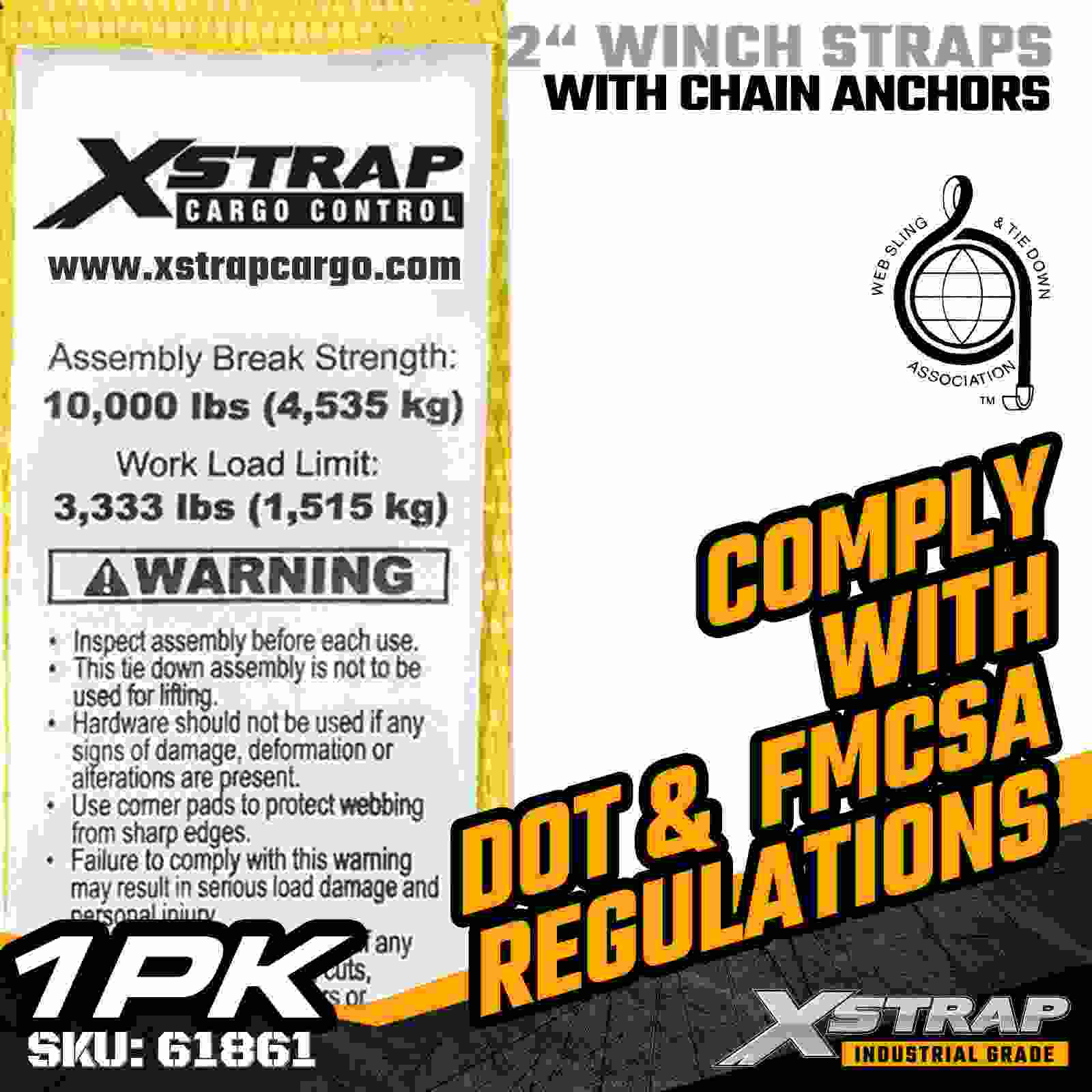 Ang Xstrap 61861 2" × 27ft Standard Winch Strap ay itinayo para sa maaasahang flatbed cargo securement, na nagtatampok ng matibay na Mga Chain Anchor at high-strength polyester webbing. May 3,333 lbs Working Load Limit at 10,000 lbs Break Strength, nagbibigay ito ng load dependable performance para sa pang-araw-araw na paghahakot ng mga tubo, at pang-araw-araw na paghahakot ng kargamento. mga aplikasyon ng logistik.