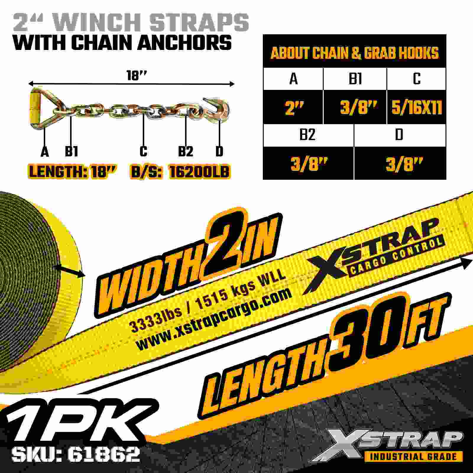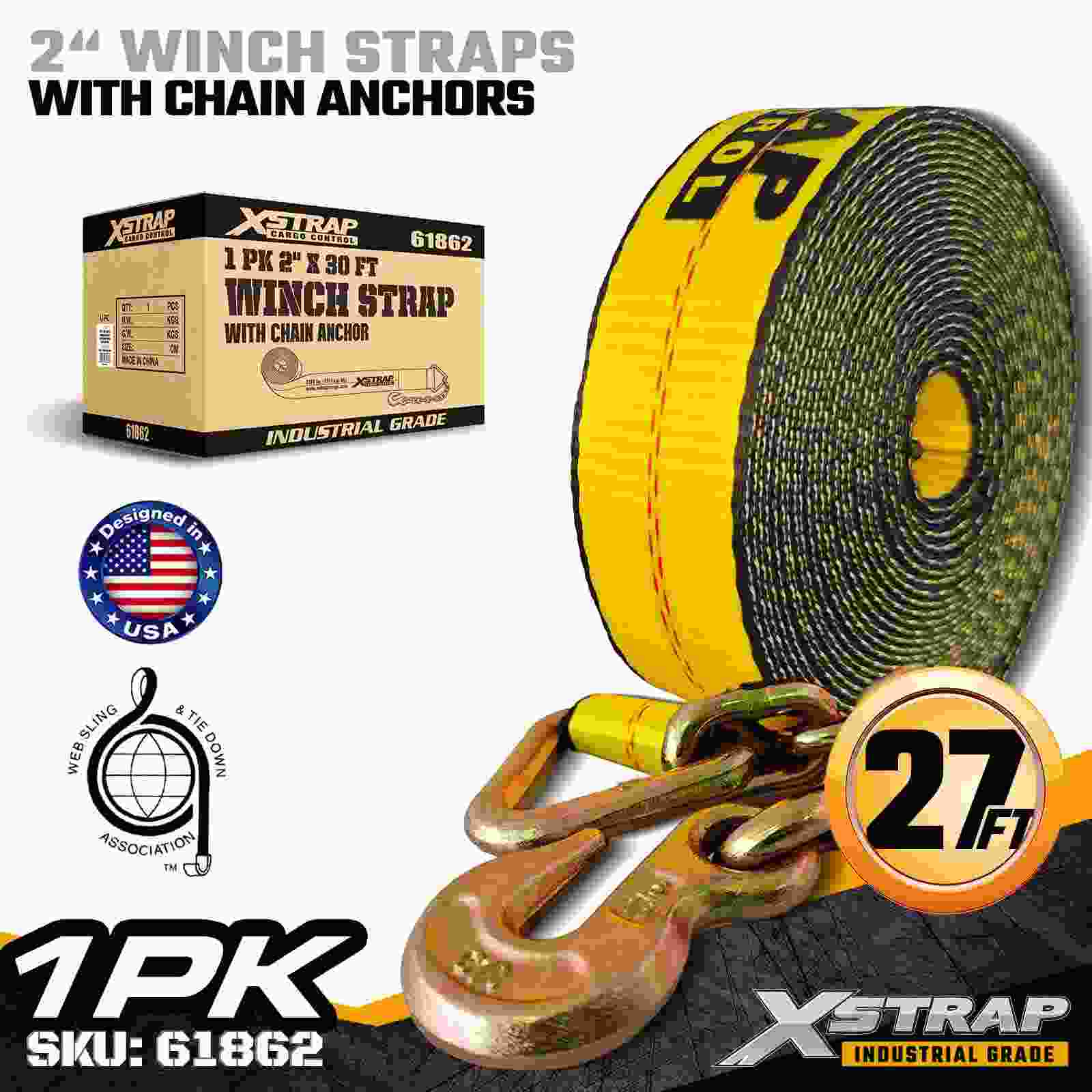 2" × 30ft Standard Winch Strap na may Chain Anchors