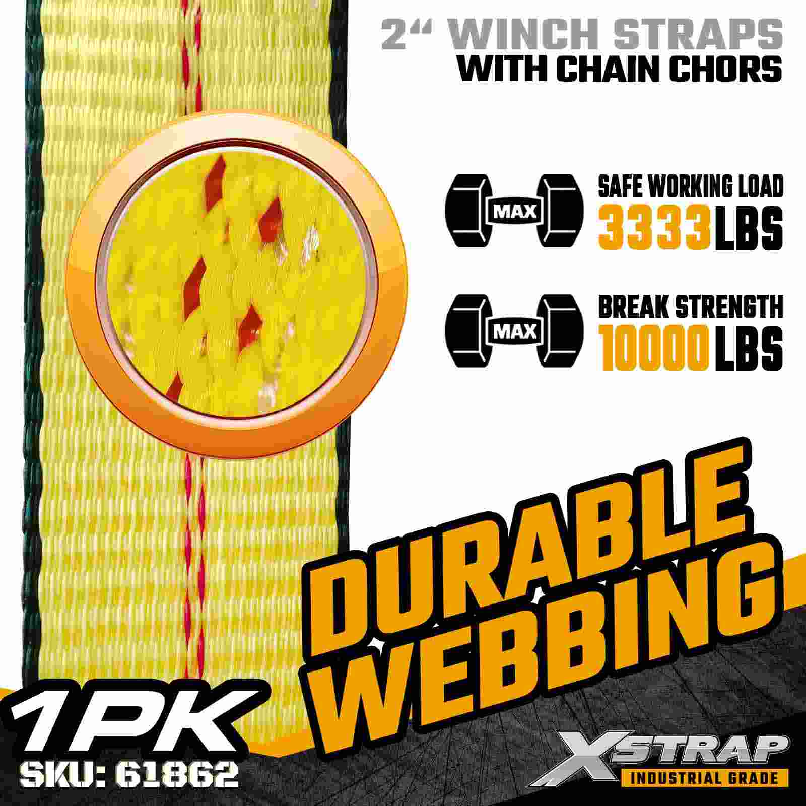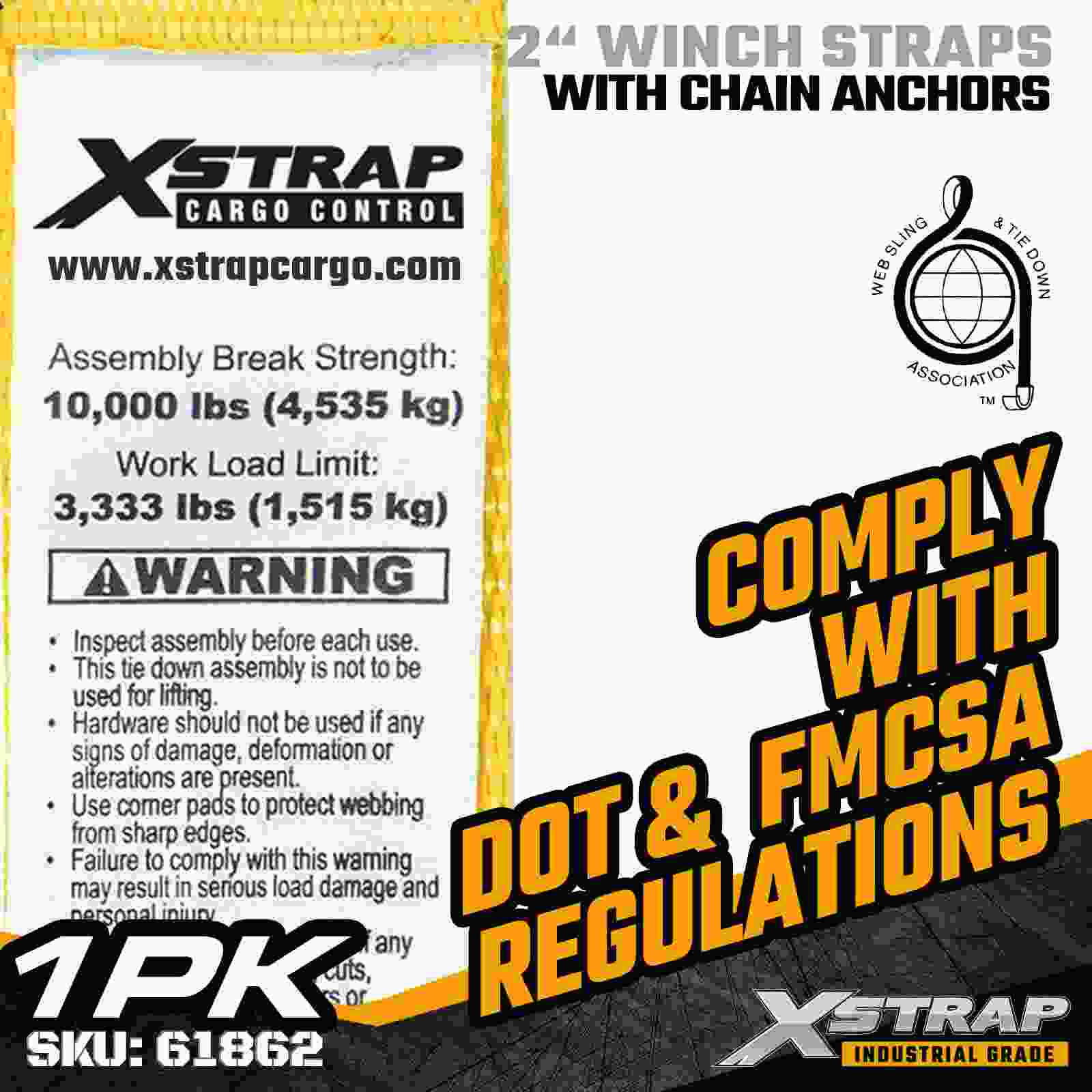 Ang Xstrap 61862 2" × 30ft Standard Winch Strap ay binuo para sa maaasahang flatbed cargo securement, na nagtatampok ng matibay na Mga Chain Anchor at high-strength polyester webbing. Na may 3,333 lbs Working Load Limit at 10,000 lbs Break Strength, nagbibigay ito ng load dependable na performance para sa pang-araw-araw na paghahakot ng kargamento para sa pang-araw-araw na paghahakot ng kargamento. mga aplikasyon ng logistik.