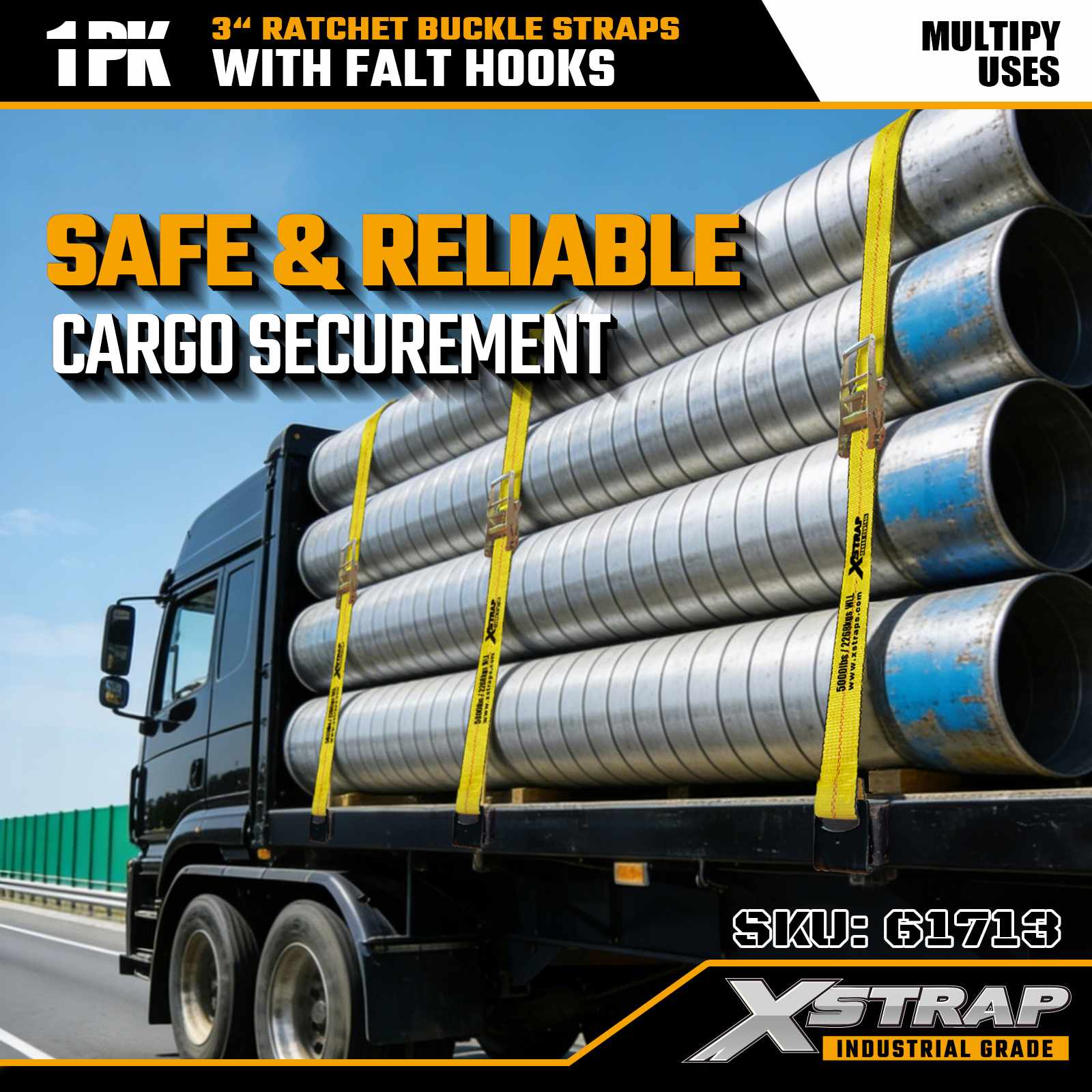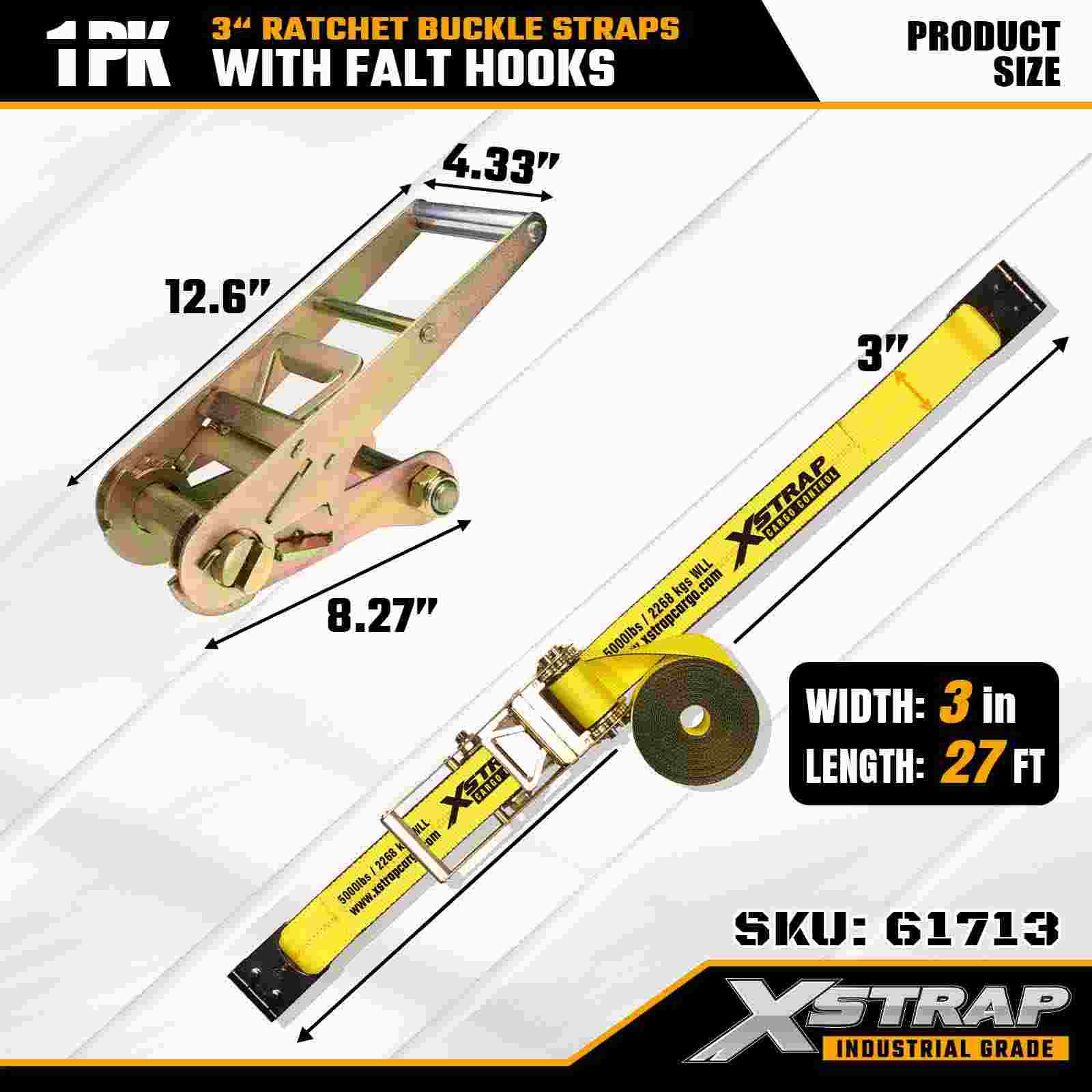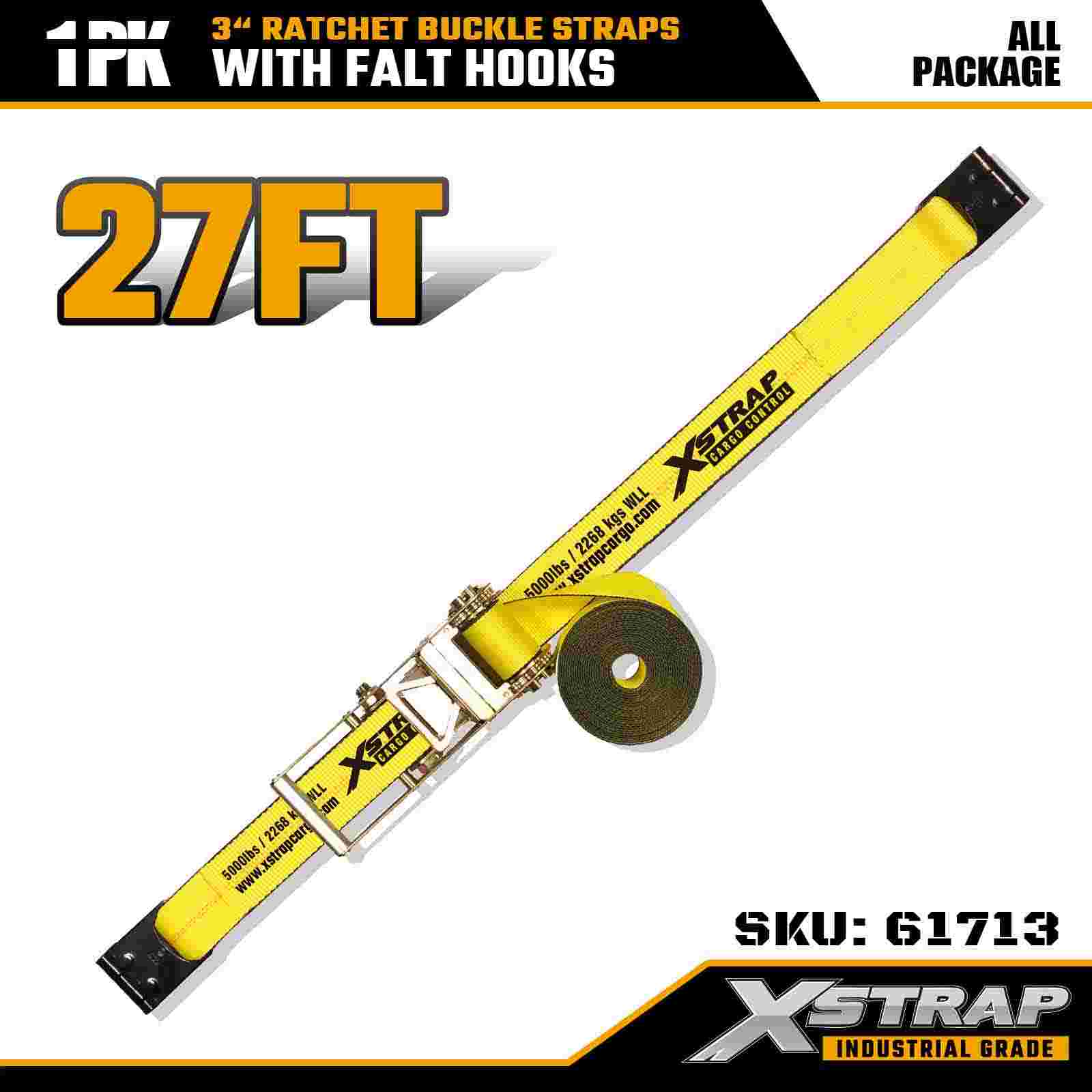 Xstrap 61713 3" x 27ft Ratchet Buckle Straps (1-Pack) Flat Hooks, 5,000lbs Load Kapasidad 15,000 lbs Break Strength, Heavy Duty Tie Down para sa mga Truck, Trailer, at Industrial Cargo Transport.