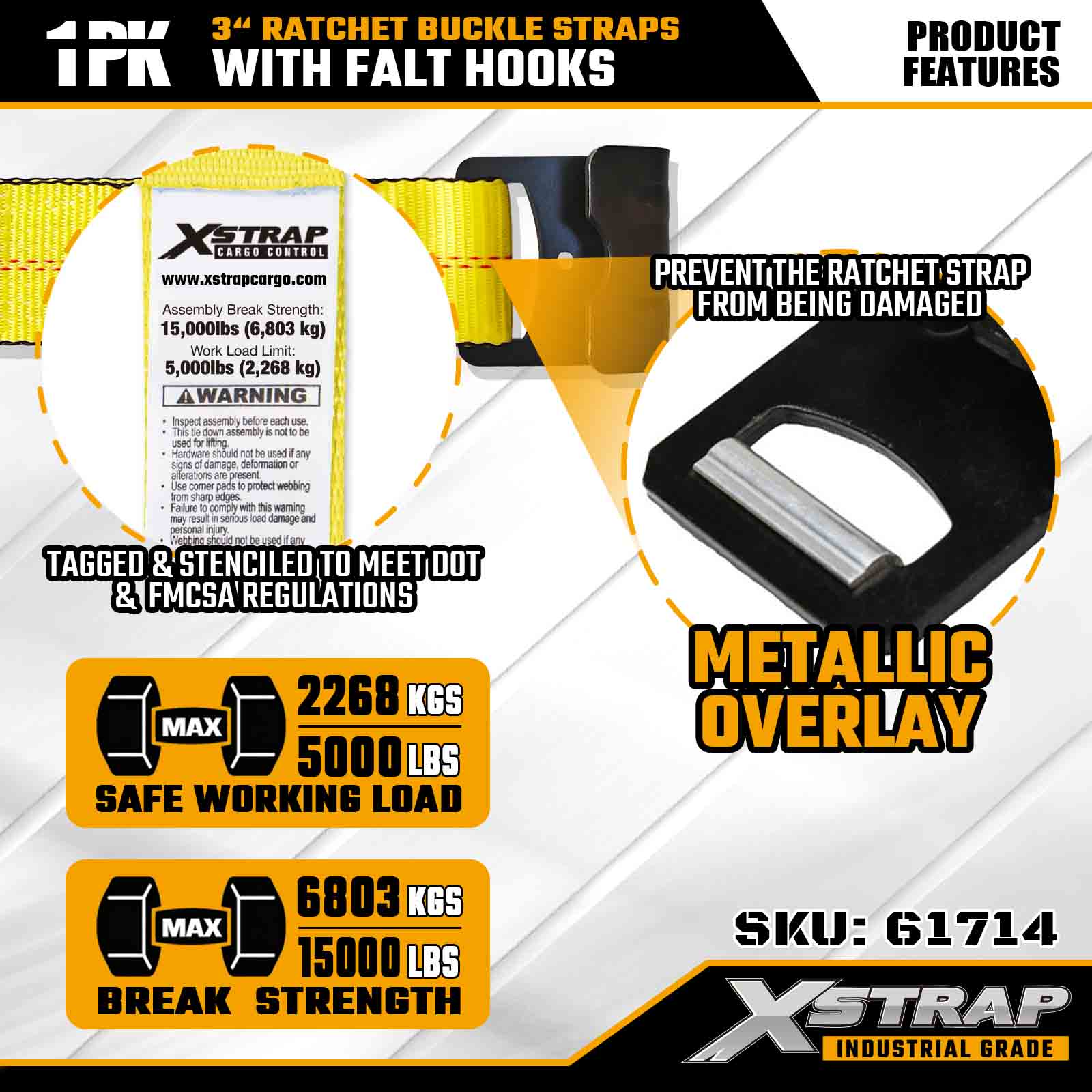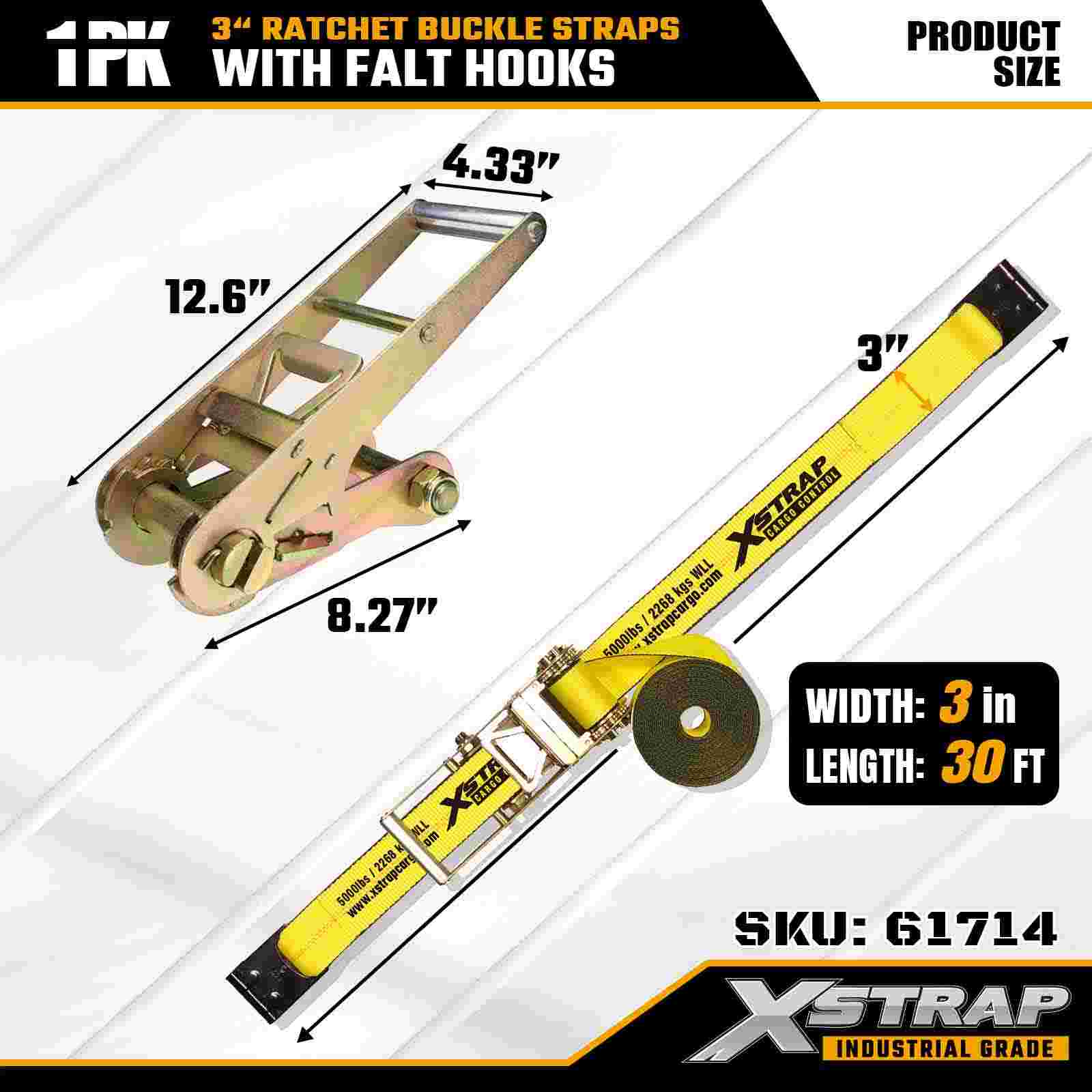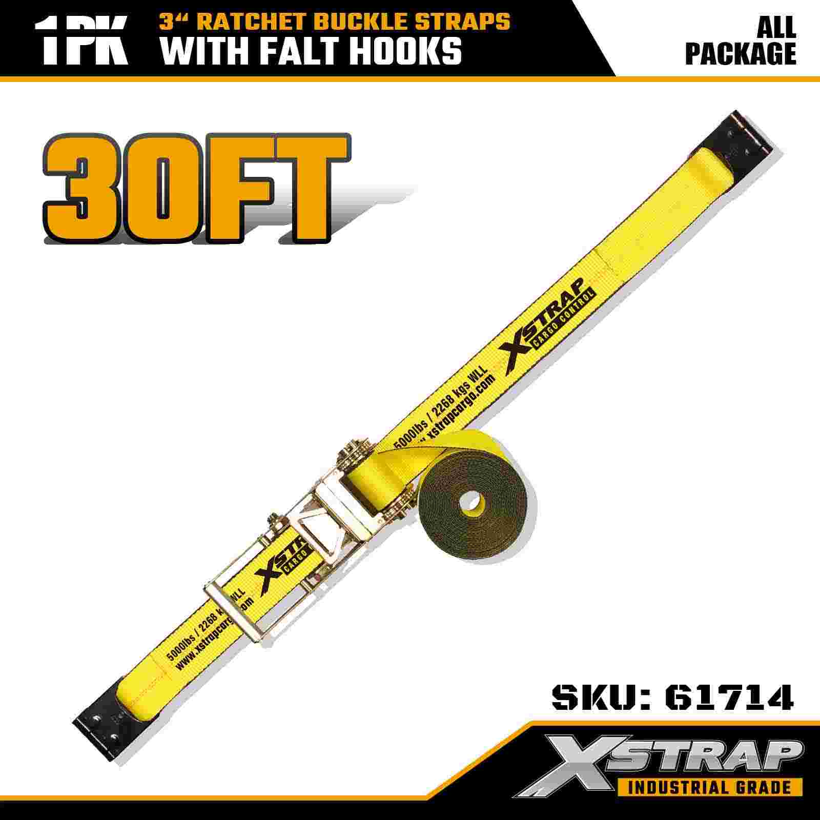 Xstrap 61714 3" x 30ft Ratchet Buckle Straps (1-Pack) – Flat Hooks, 5,000 lbs Load Kapasidad, 15,000 lbs Break Strength, Heavy Duty Tie Down para sa mga Truck, Trailer, at Industrial Cargo Transport.