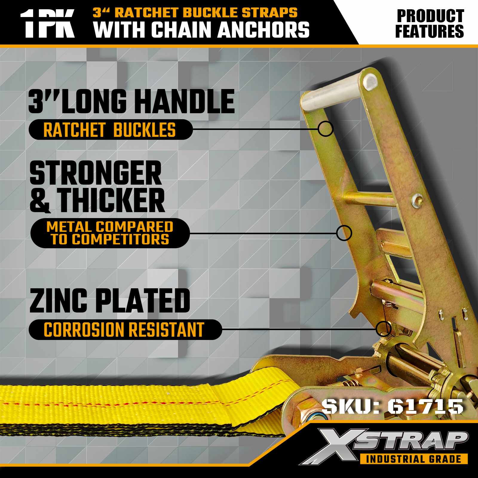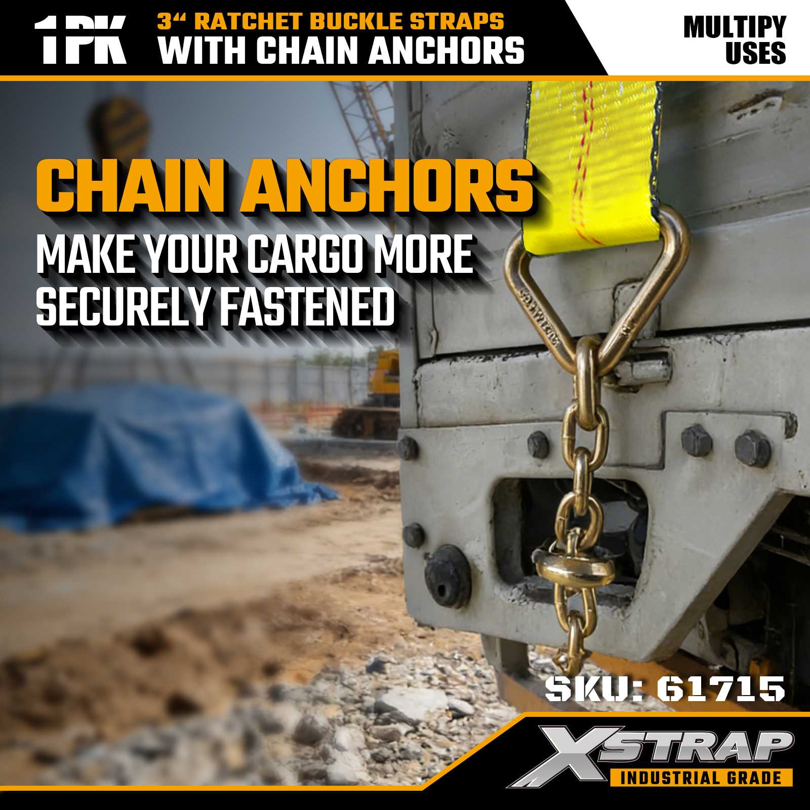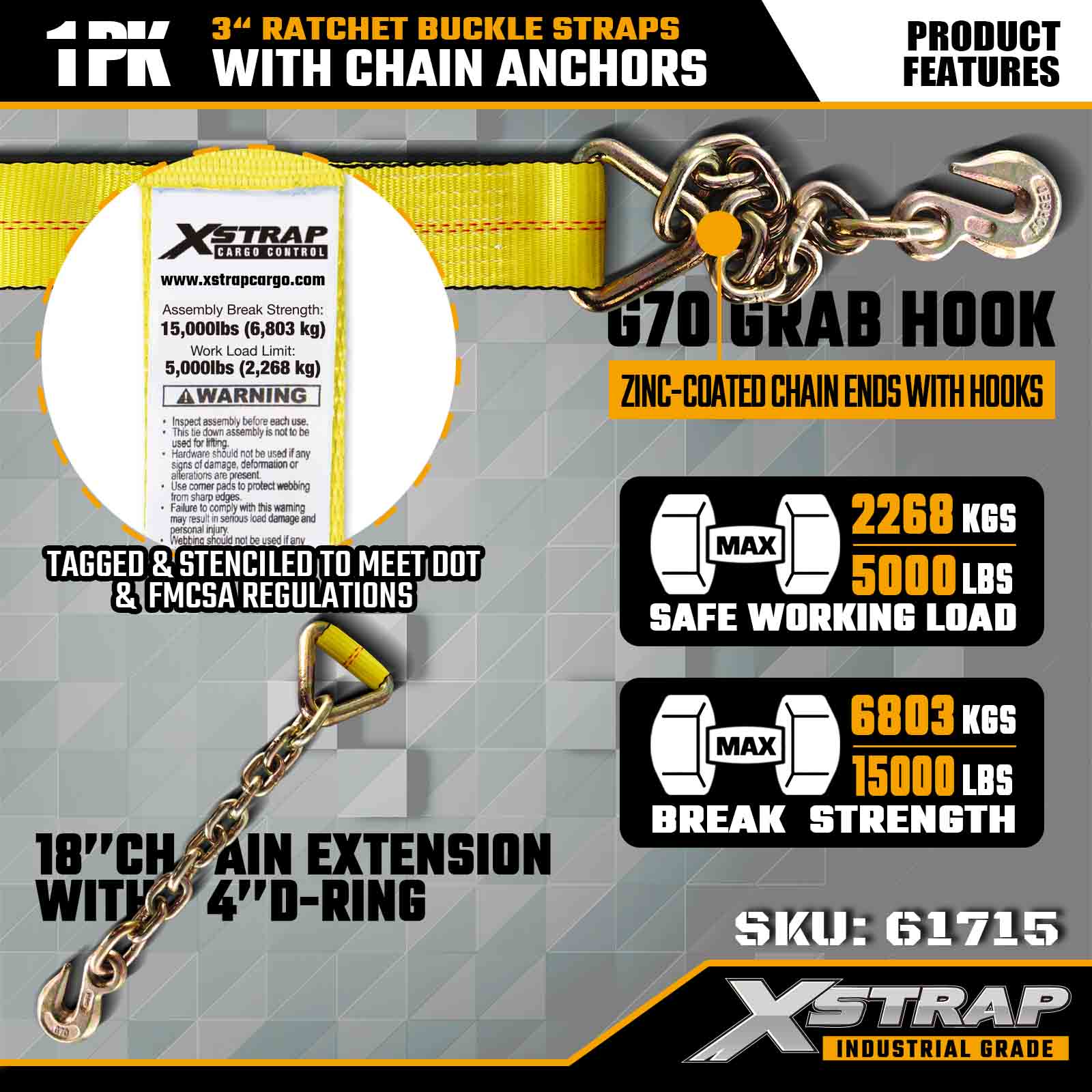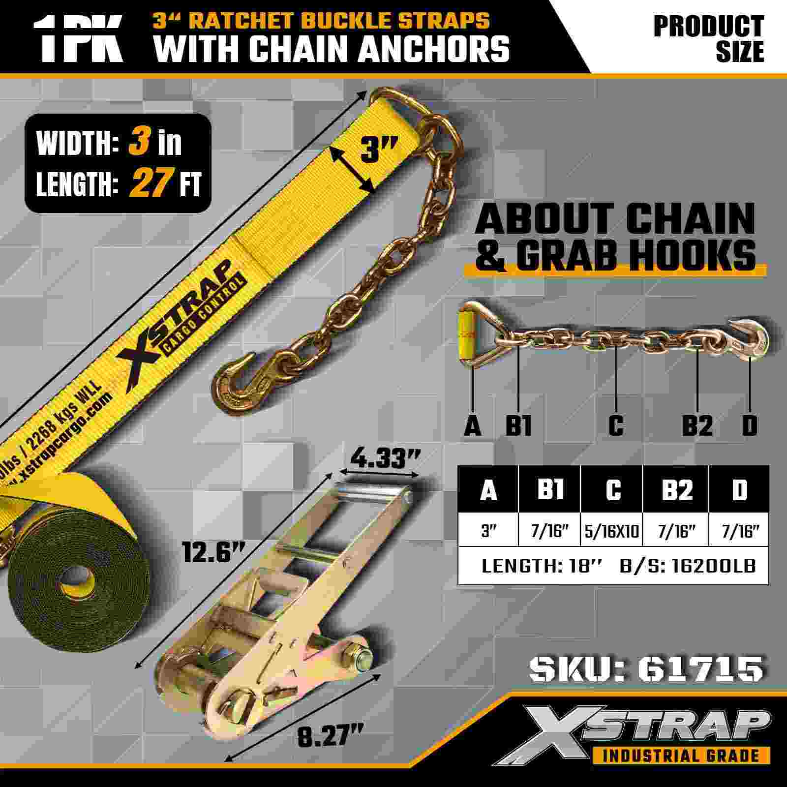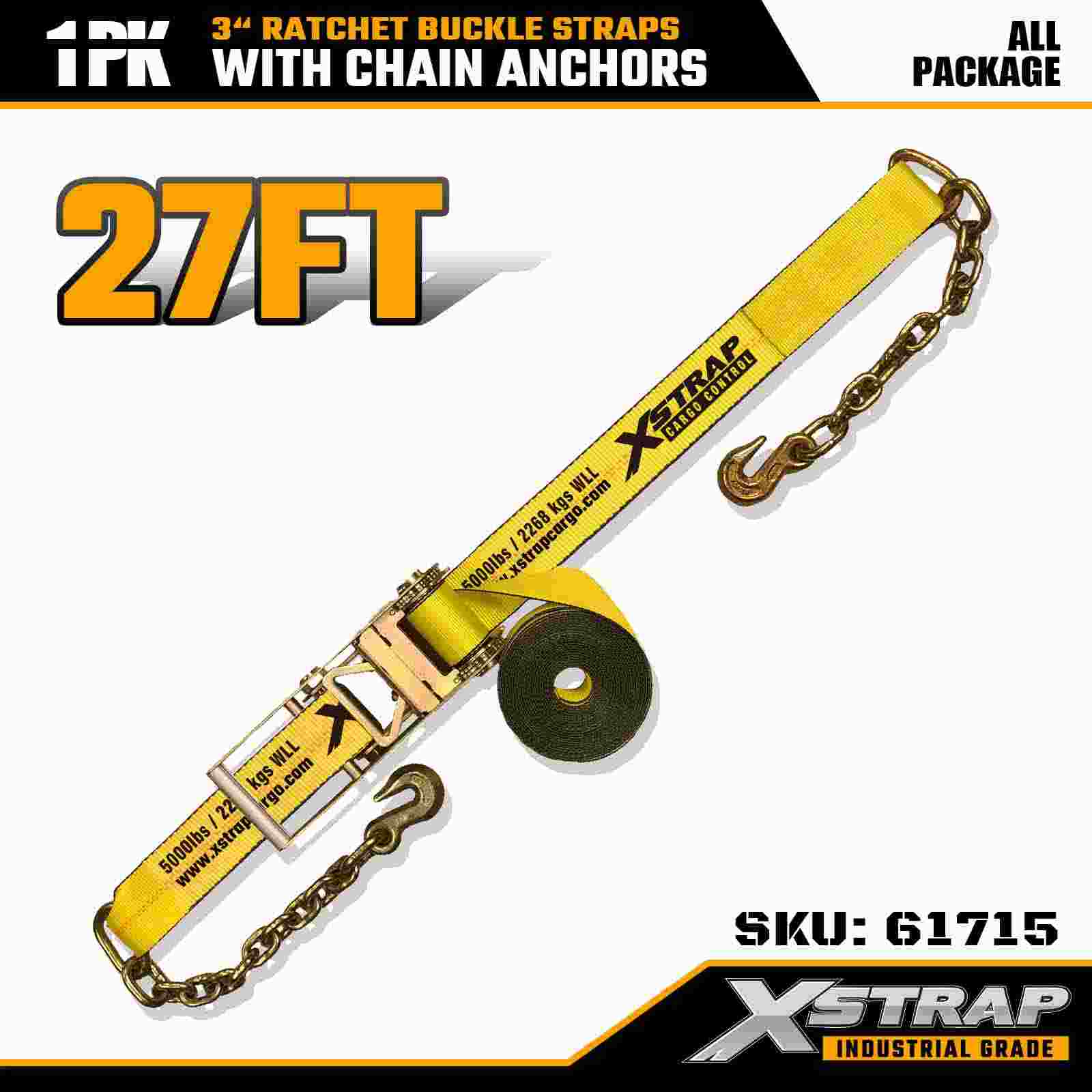 Xstrap 61715 3" x 27ft Ratchet Buckle Straps (1-Pack) – Mga Chain Anchor, 5,000 lbs Load Kapasidad, 15,000 lbs Break Strength. Dinisenyo para sa heavy-duty na cargo control, pinagsasama ng mga strap na ito ang industrial-grade na webbing na may mga chain anchor truck, at mga dulo ng seguridad para sa.