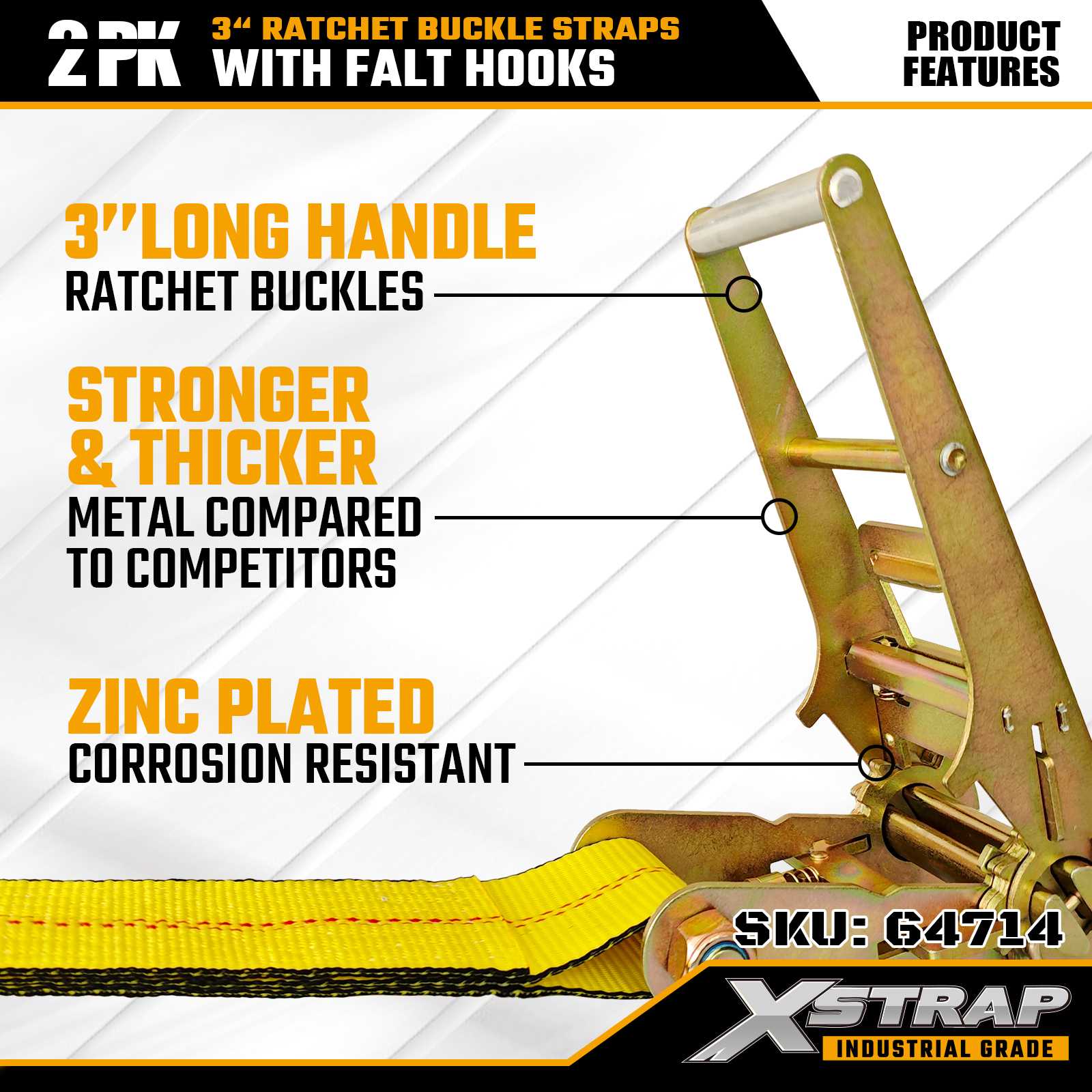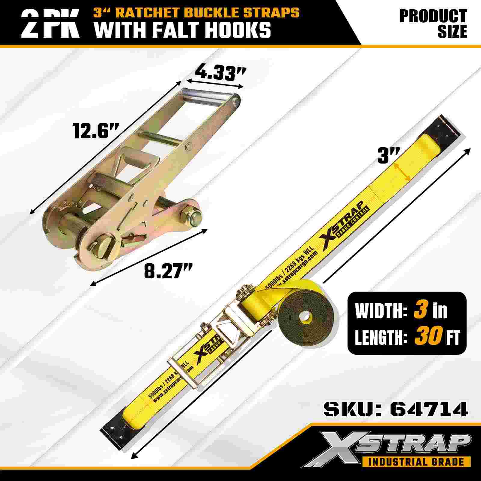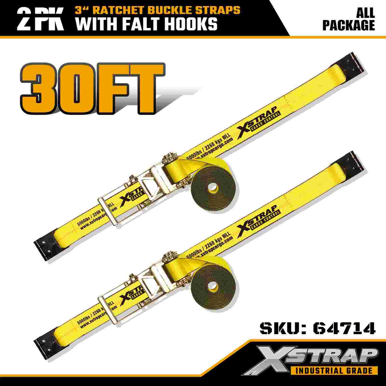 Xstrap 64714 3" x 30ft Ratchet Buckle Straps (2-Pack) – Flat Hooks, 5,000 lbs Load Kapasidad, 15,000 lbs Break Strength. Dinisenyo para sa propesyonal na kontrol ng kargamento, ang mga heavy-duty na strap na ito ay nagbibigay ng pinahabang abot at dual-pack na kaginhawahan para sa mga trak, mga trailer ng transportasyon, at industriya.