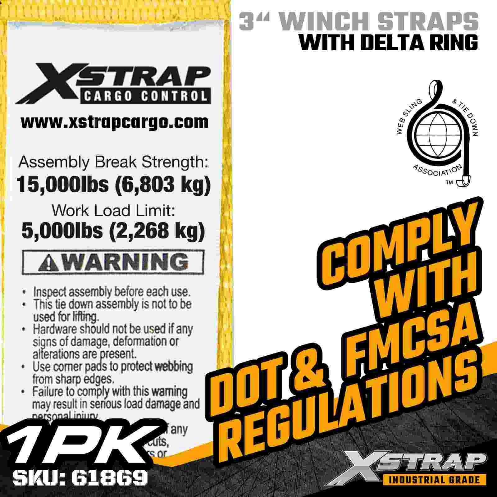 Ang Xstrap 61869 3" × 30ft Standard Winch Strap ay isang heavy-duty na cargo securement strap na inengineered para sa flatbed trailers at high-capacity transport. Nagtatampok ng reinforced Delta Ring at extra-wide 3-inch polyester webbing, ang 3 inch winch strap na ito ay naghahatid ng 5,000 lbs, 10,00 na Break at Working lbs. Lakas. Ito ay mainam para sa pag-secure ng malalaking kargada gaya ng tabla, bakal, makinarya, at pang-industriya na kargamento habang hinihingi ang mga operasyon ng paghakot.
