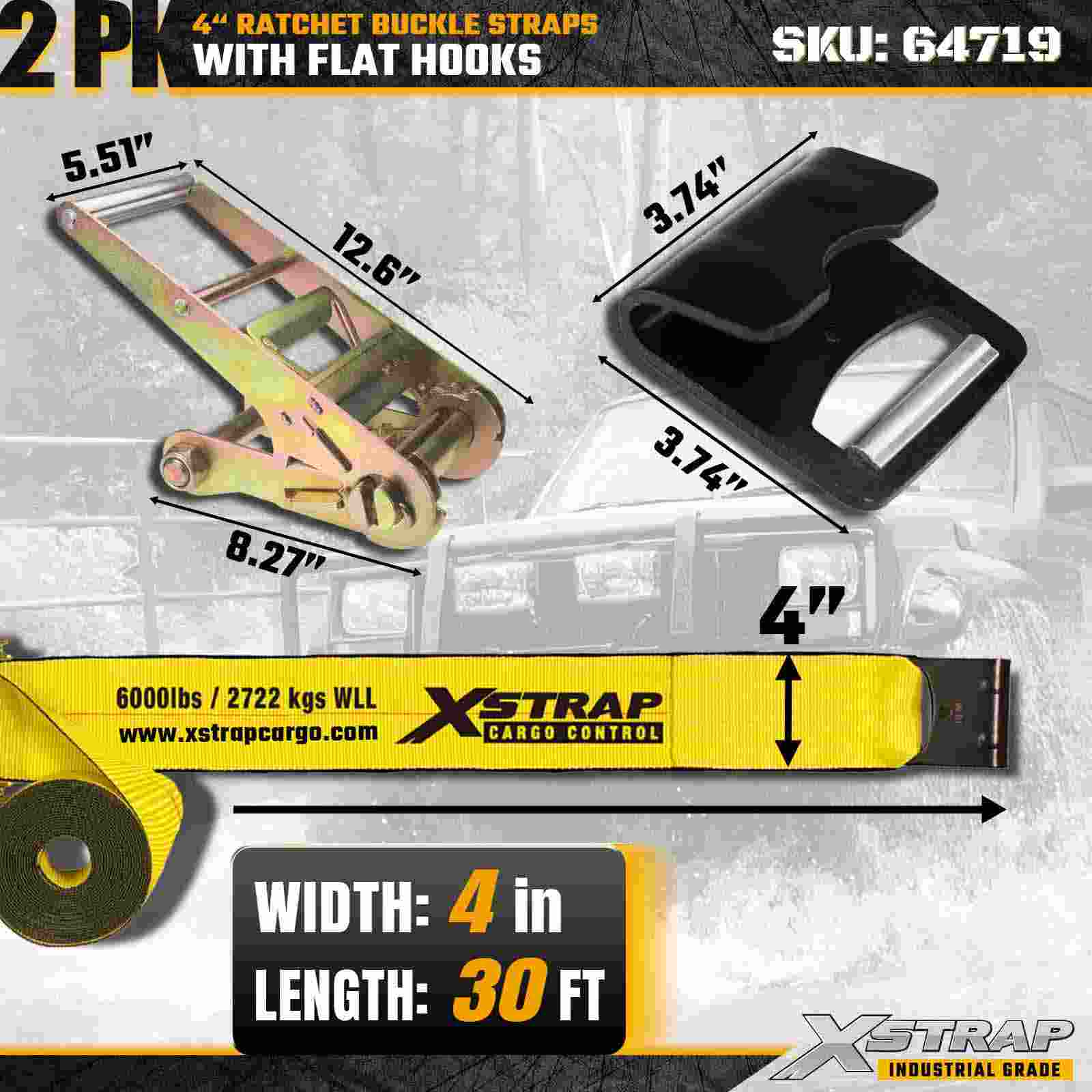 Ang Xstrap 64719 4" × 30ft Ratchet Buckle Straps (2-Pack) ay naghahatid ng heavy-duty na cargo securement na may reinforced Flat Hooks at isang matibay na mekanismo ng ratchet. Na-rate sa 6,000 lbs WLL at 18,000 lbs Break Strength, ang mga ito ay perpekto para sa flatbed application at pang-industriya na paghakot, mga makinang pang-industriya.