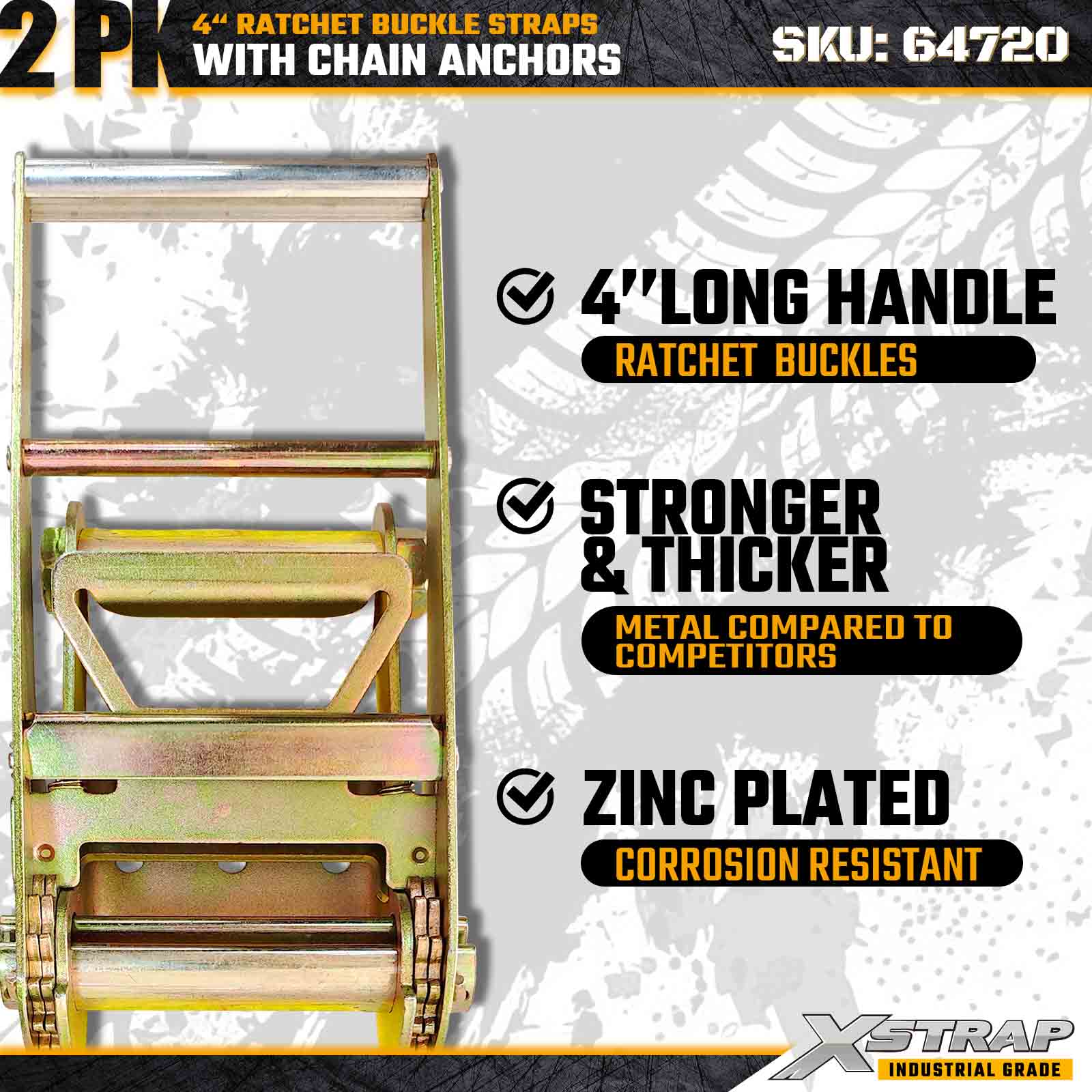 Ang Xstrap 64720 4" × 27ft Ratchet Buckle Straps (2-Pack) ay inengineered para sa heavy-duty cargo securement, na nagtatampok ng masungit na Mga Chain Anchor at isang reinforced ratchet mechanism. May 6,000 lbs na Working Load Limit at 18,000 lbs na kargamento, mainam para sa mga flat na straps na ito. load, at pang-industriya na mga aplikasyon ng kargamento na nangangailangan ng pinakamataas na lakas at pagiging maaasahan.