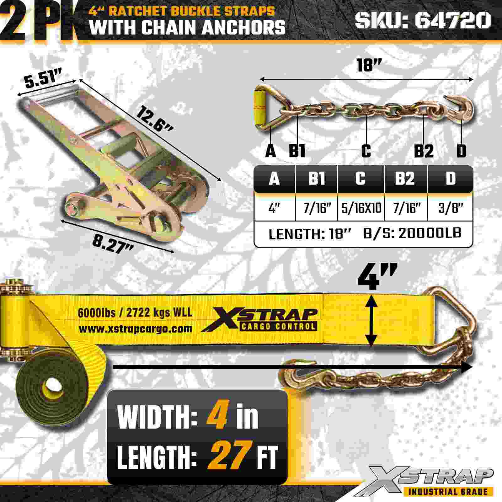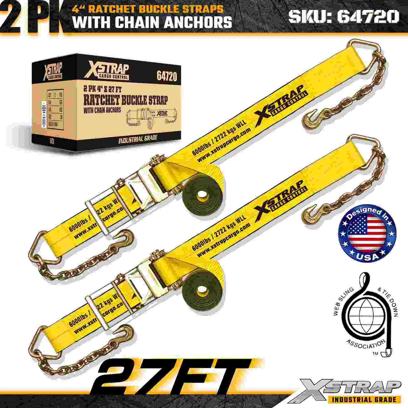 4" × 27ft Ratchet Buckle Straps na may Chain Anchors