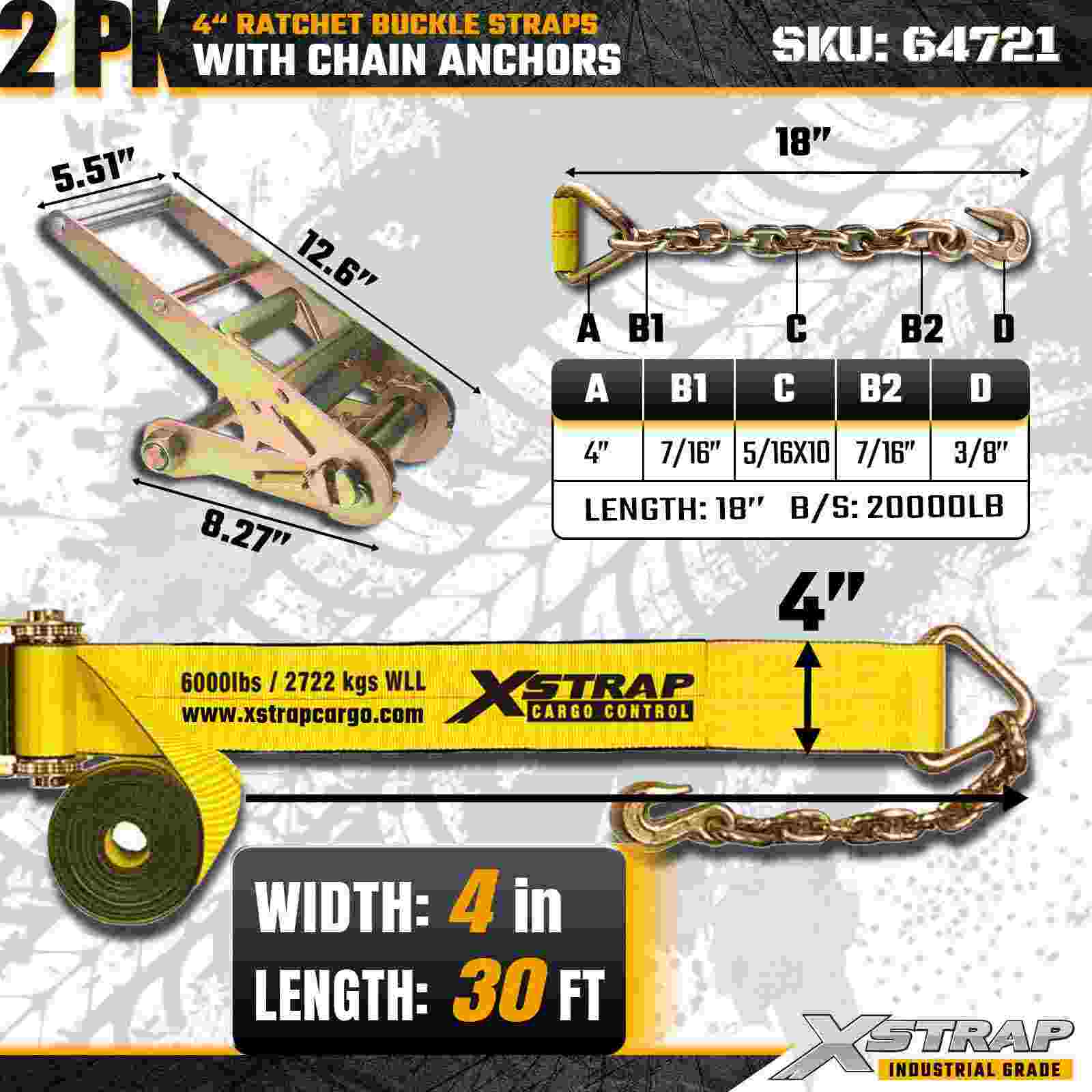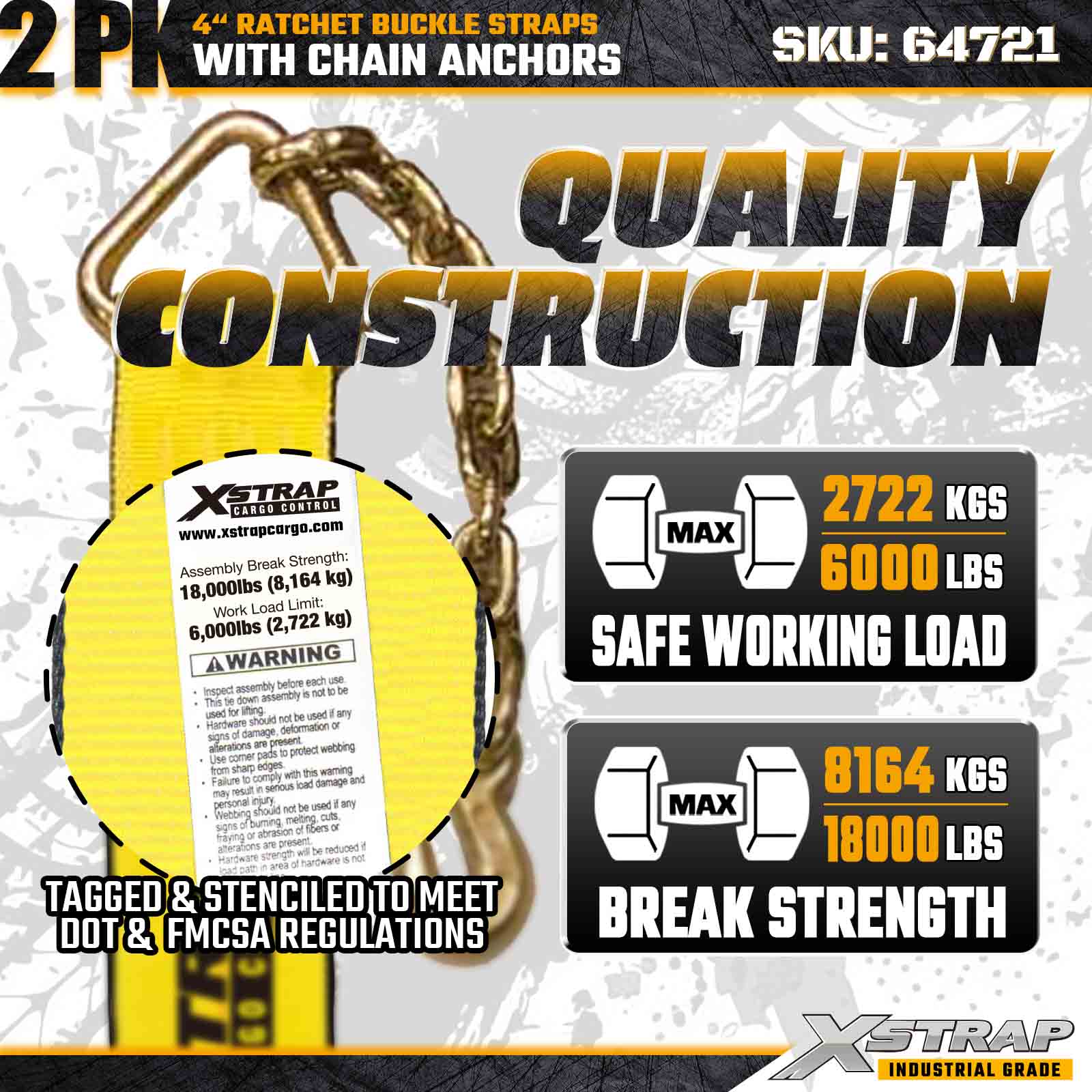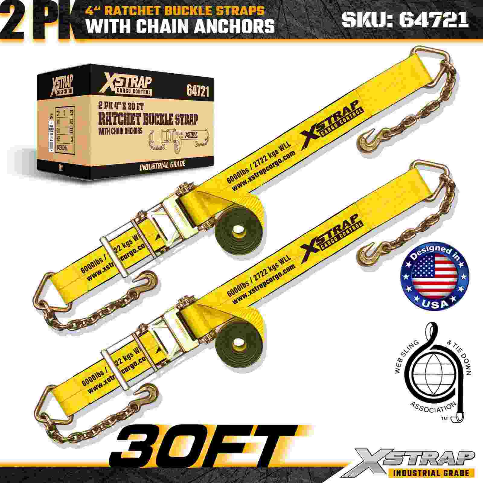Ang Xstrap 64721 4" × 30ft Ratchet Buckle Straps (2-Pack) ay inengineered para sa heavy-duty cargo securement, na nagtatampok ng masungit na Mga Chain Anchor at isang reinforced ratchet mechanism. Na may 6,000 lbs na Working Load Limit at 18,000 lbs na kargamento, mainam para sa flat transport Strength na ito. load, at pang-industriya na mga aplikasyon ng kargamento na nangangailangan ng pinakamataas na lakas at pagiging maaasahan.