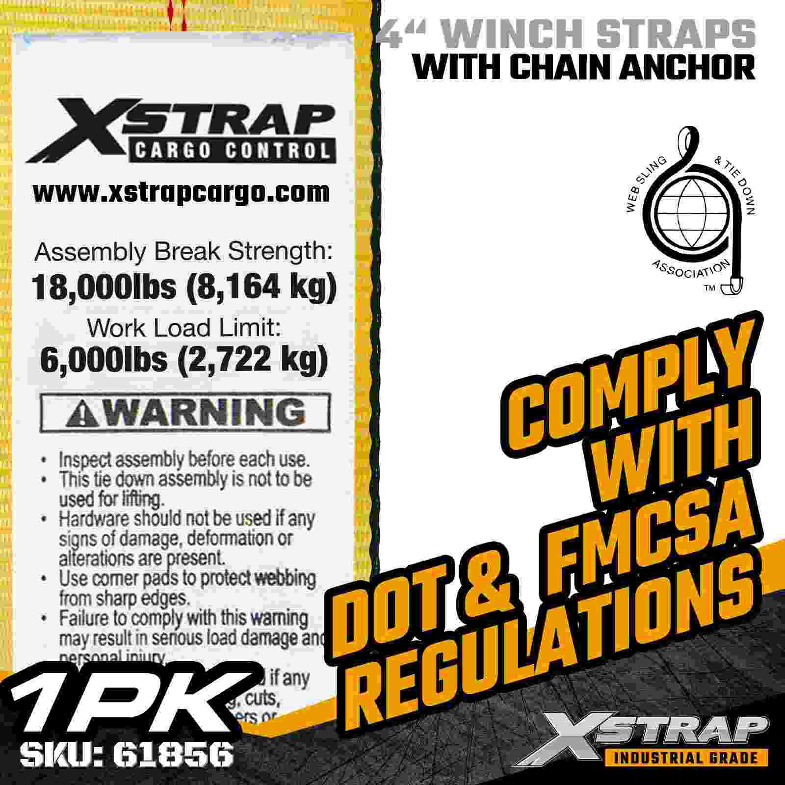 Ang Xstrap 61856 4" × 30ft Standard Winch Strap ay isang high-capacity, extended-reach cargo securement strap na ginawa para sa flatbed trailers at oversized industrial freight. Nagtatampok ng forged Chain Anchor at ultra-wide 4-inch polyester webbing, itong 4 inch winch strap at Load na ito ay naghahatid ng 6 lbs, at Load. 18,000 lbs Break Strength Ang pinalawig na 30ft na haba ay nagbibigay ng karagdagang abot para sa pag-secure ng malapad, matangkad, o hindi regular na hugis na mga load na nangangailangan ng maximum na lakas at katatagan ng hawak.