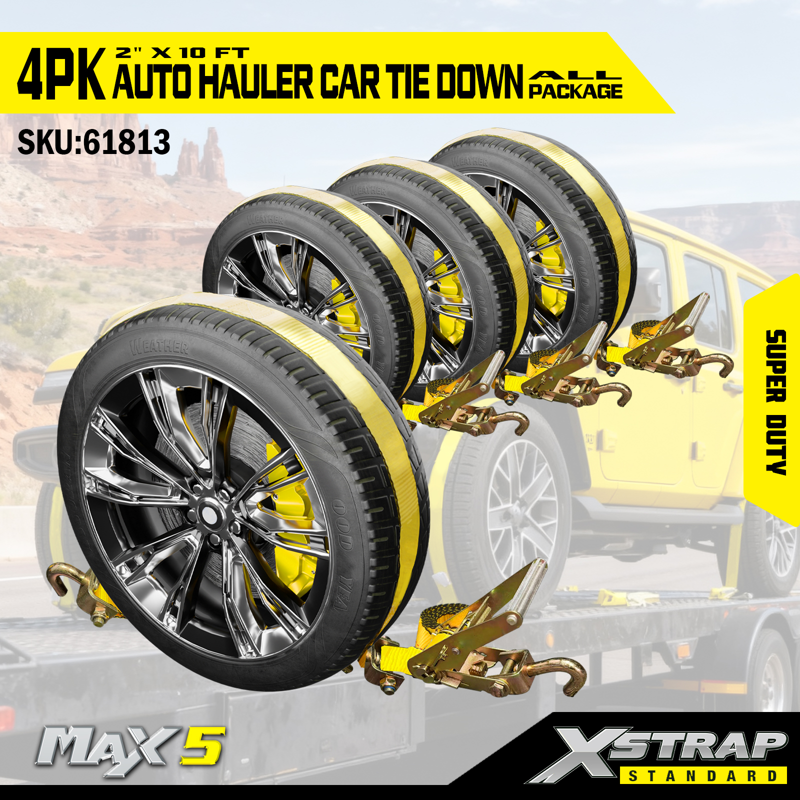 - 4-Pack Complete Coverage: Ang 4-piece set ay nagbibigay ng isang tie down bawat gulong, na naghahatid ng full load security para sa isang sasakyan sa panahon ng transportasyon.