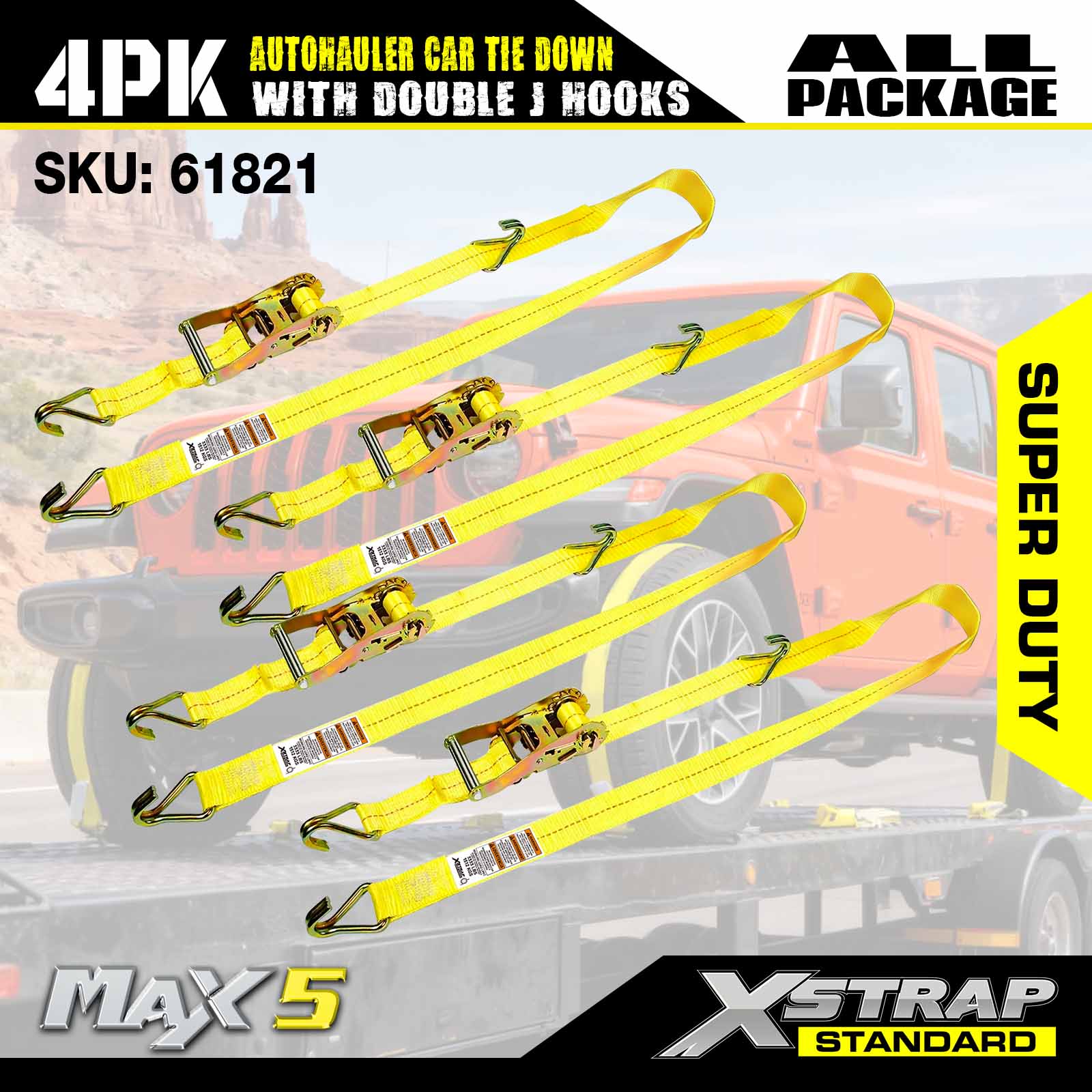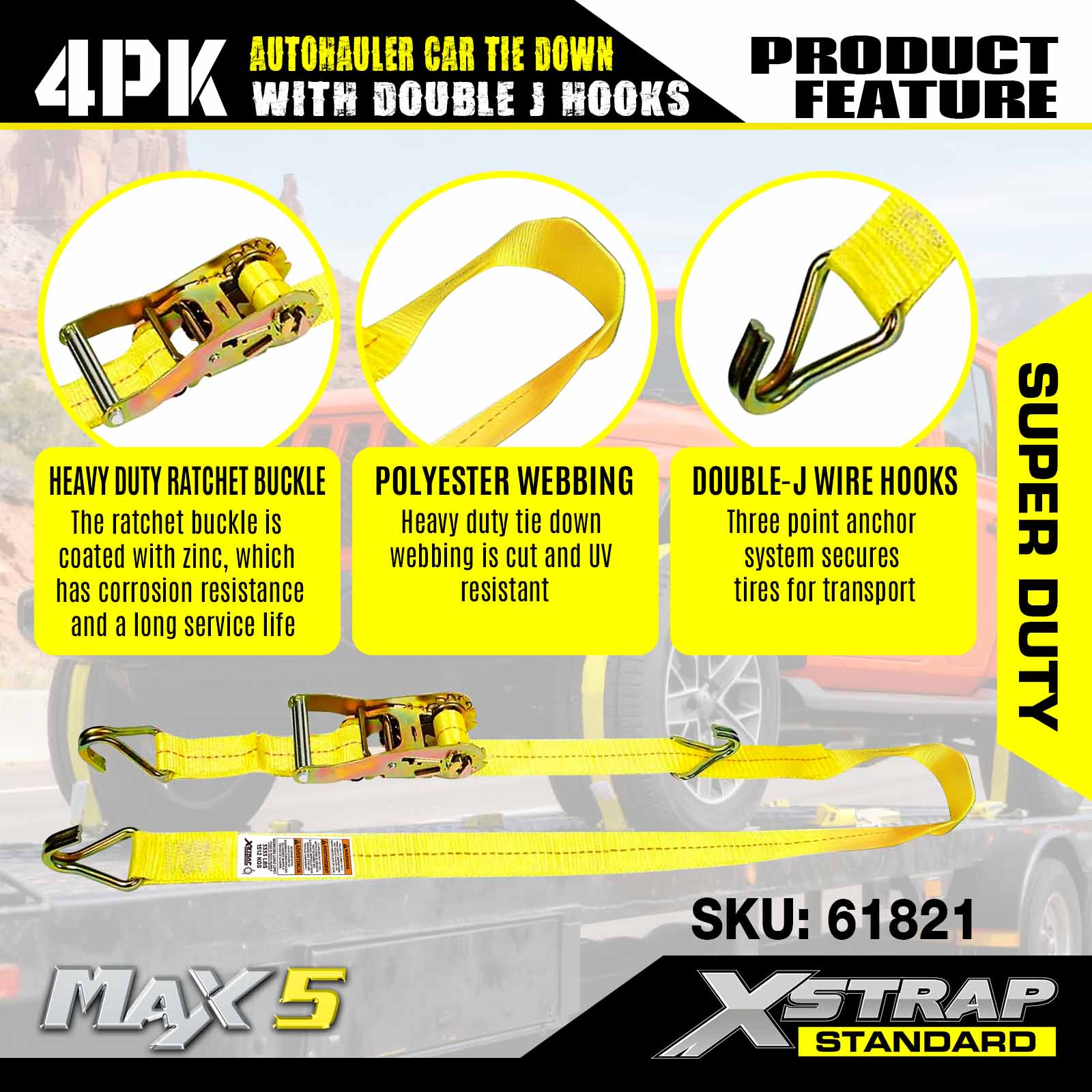 - 4-Pack Value: Ang 4-piece set ay nagbibigay ng buong saklaw para sa pag-secure ng isang sasakyan (hal., isang tie down bawat gulong), na may organisadong packaging para sa madaling imbakan kapag hindi ginagamit.