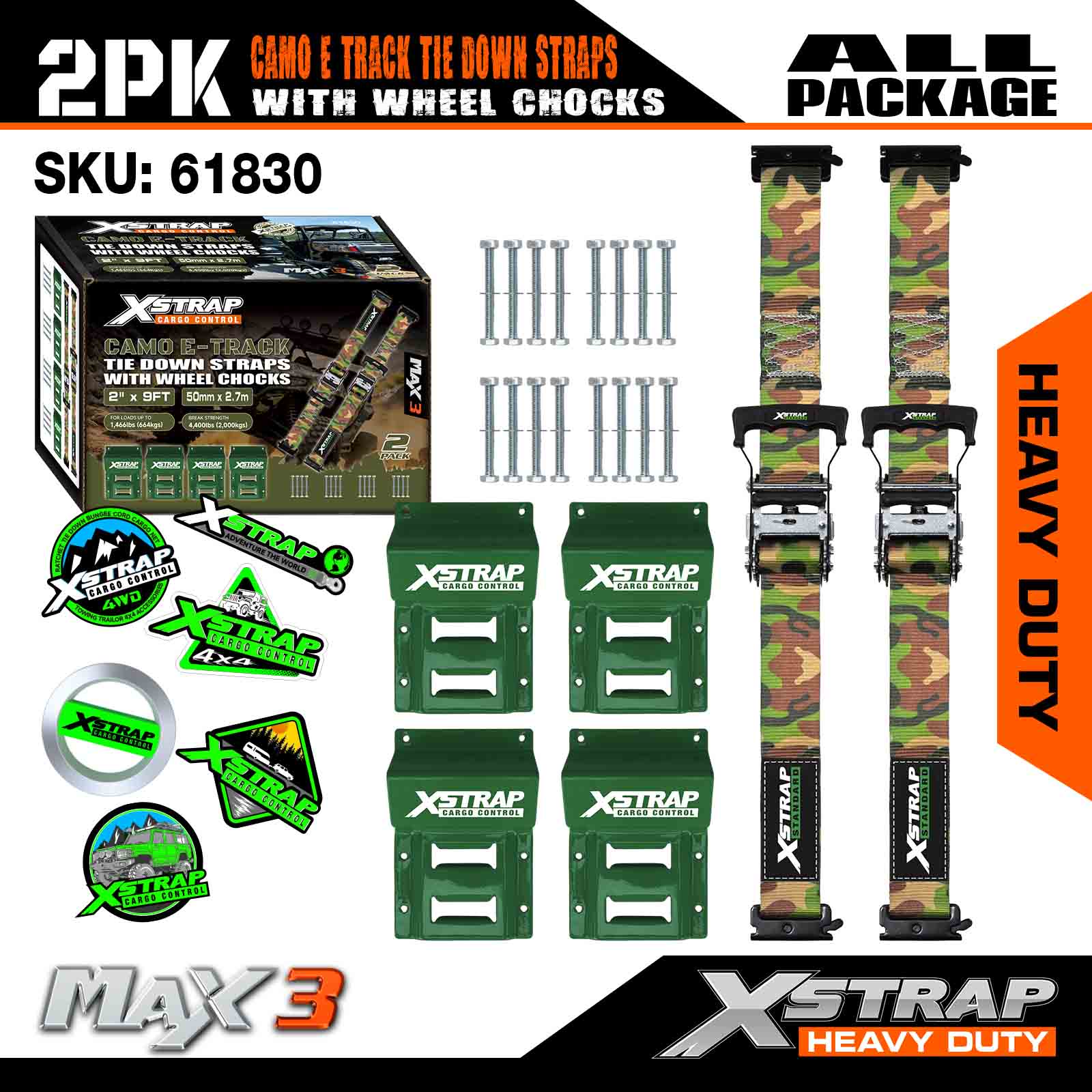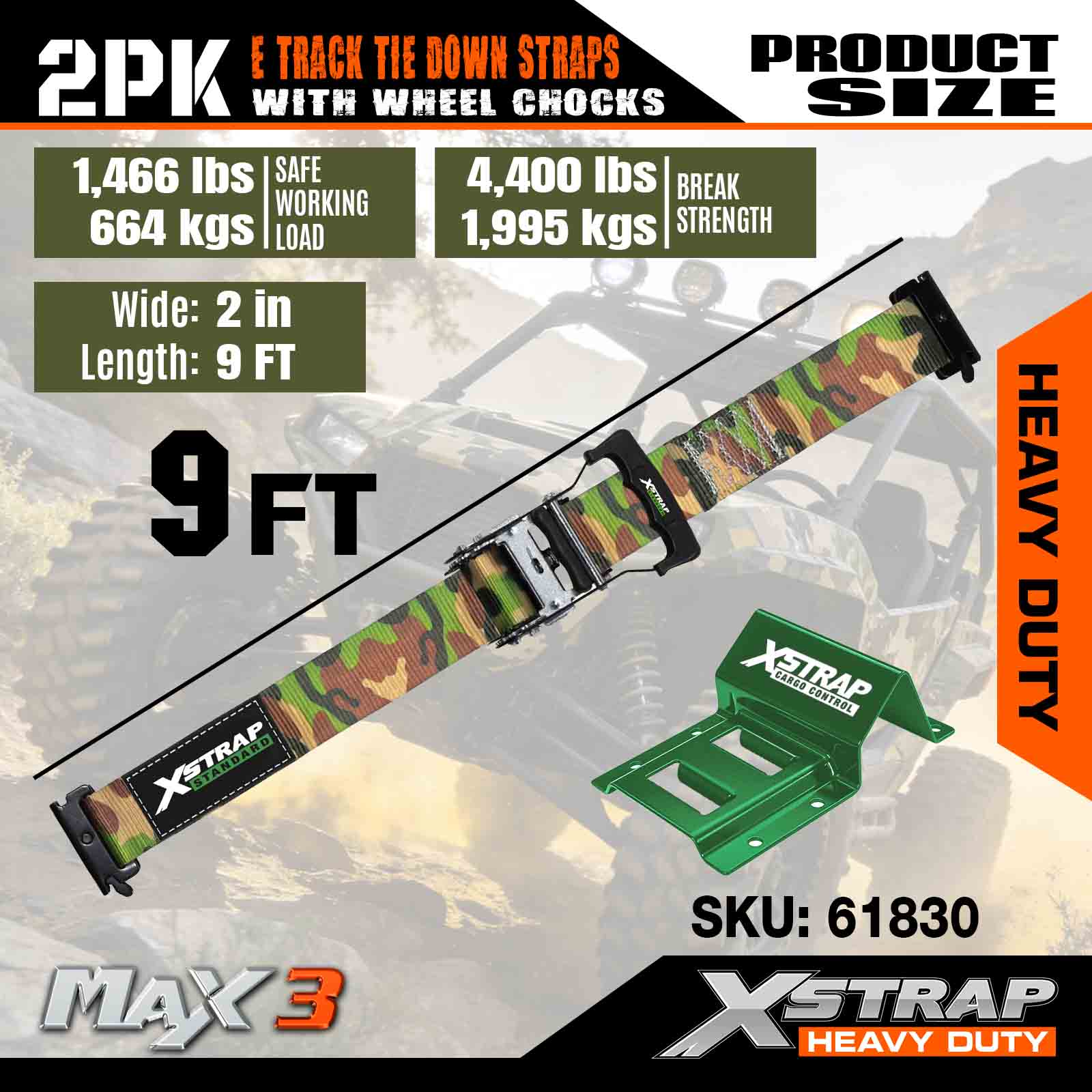 Xstrap Wheel Chock Tie Down Kit 4,400lb Lakas ng Break (2) Heavy Duty Trailer Tire Ratchet Straps (4) Wheel Chocks - E Track System para sa ATV, UTV, Lawn Mower Four Wheeler - CAMO
