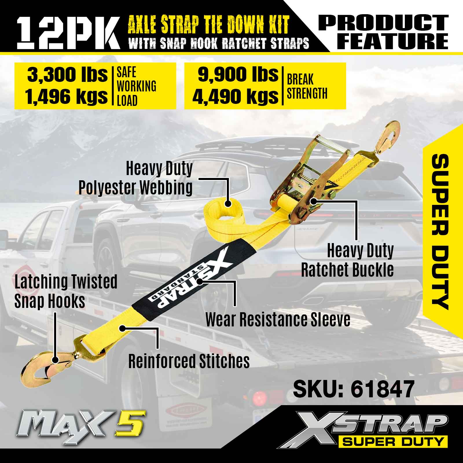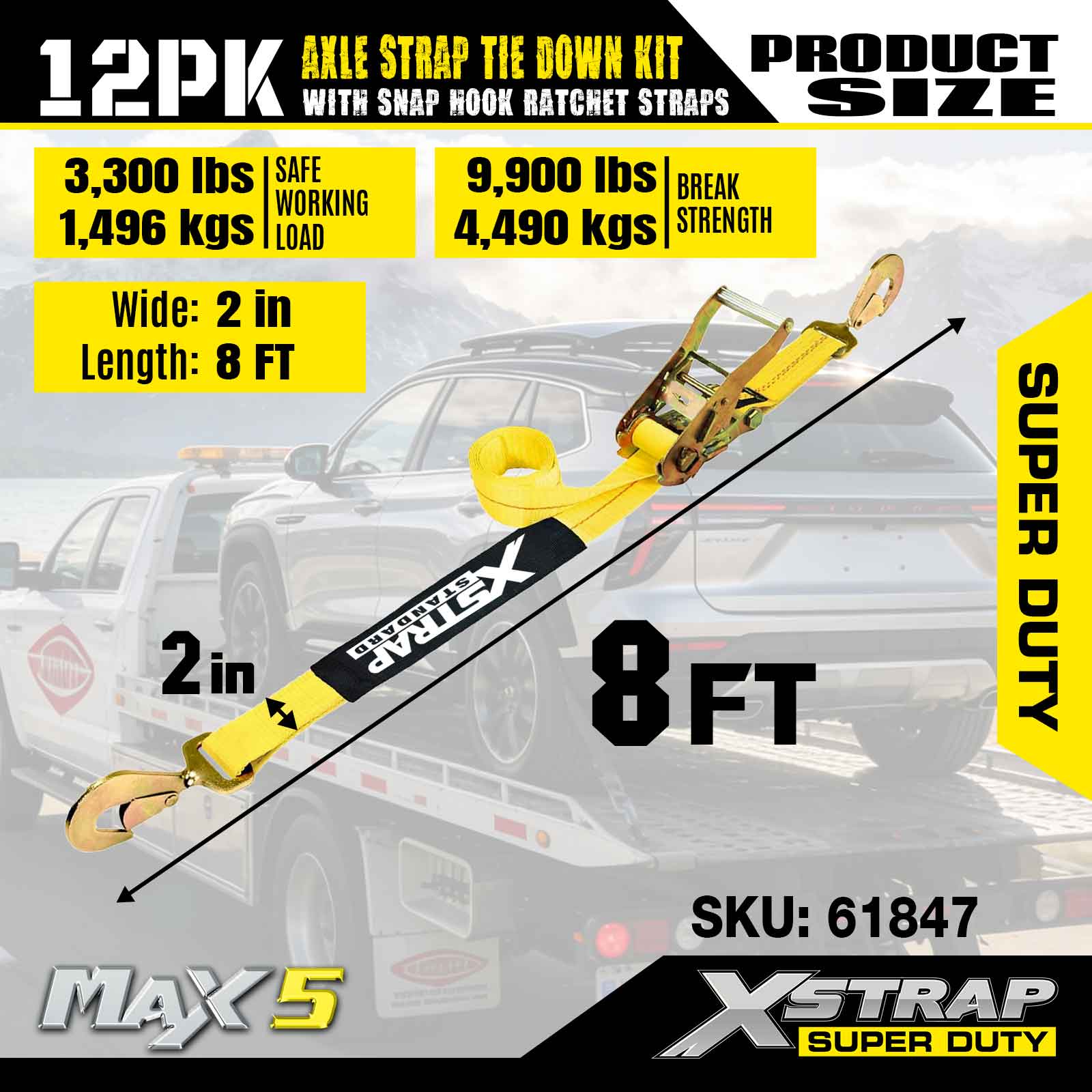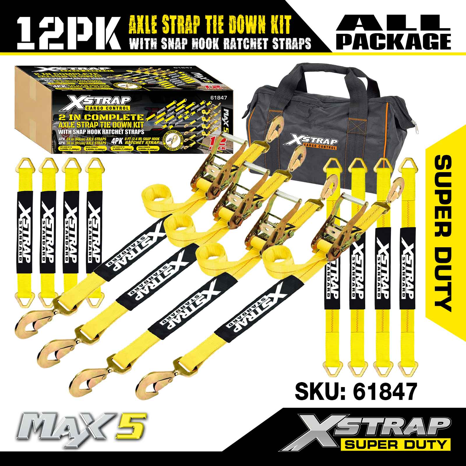Xstrap 12PK Axle Strap Tie Down Kit (na may Snap Hook Ratchet Straps) – Super Duty. Mayroon itong ligtas na working load na 3,300LBS (1,496KGs) at breaking strength na 10,000LBS (4,490KGs).