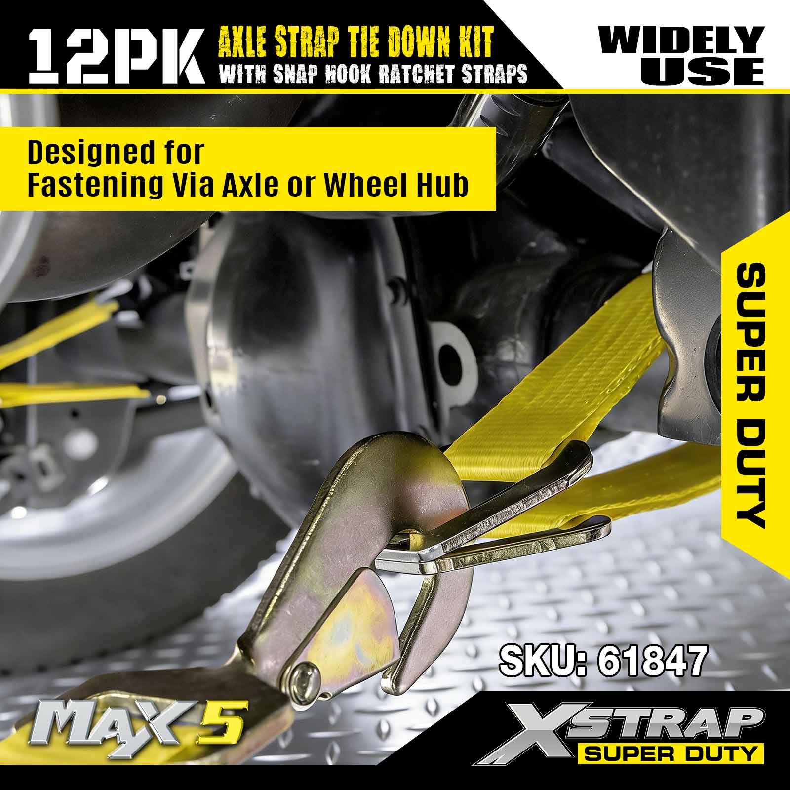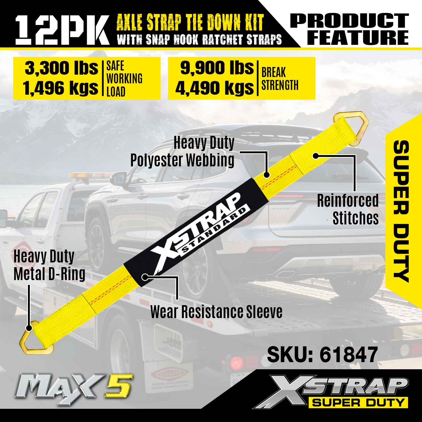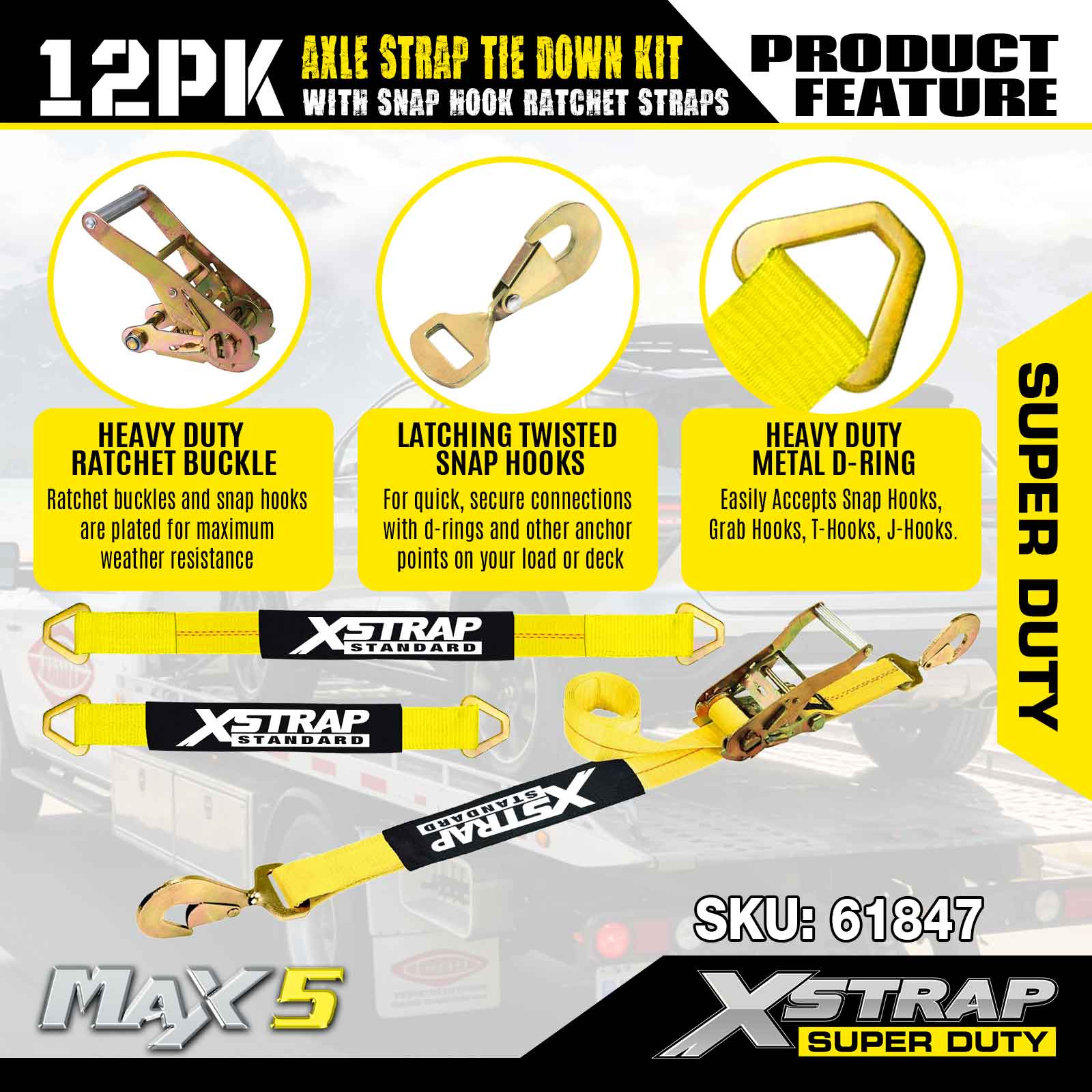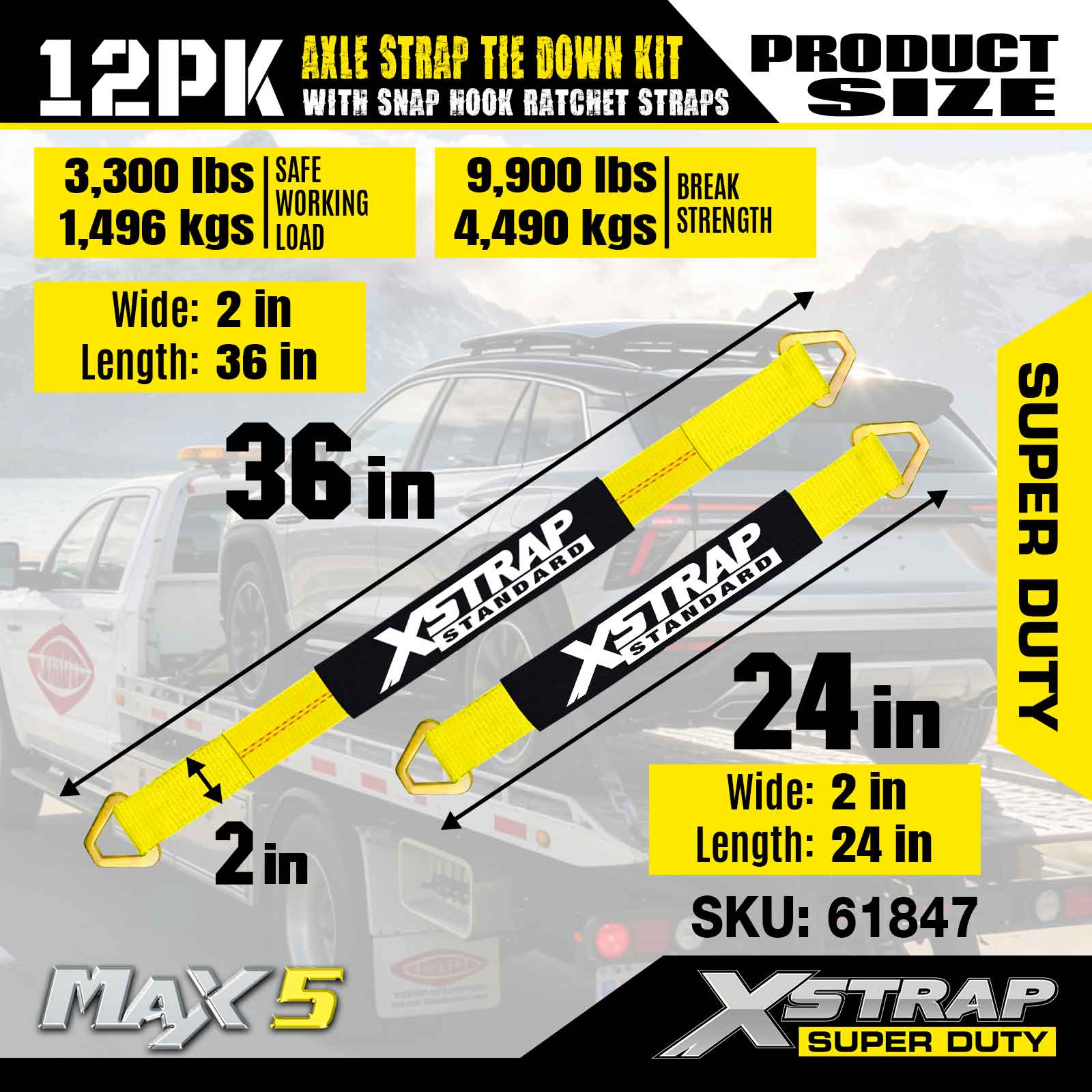 Xstrap 12PK Axle Strap Tie Down Kit (na may Snap Hook Ratchet Straps) – Super Duty. Mayroon itong ligtas na working load na 3,300LBS (1,496KGs) at breaking strength na 10,000LBS (4,490KGs).