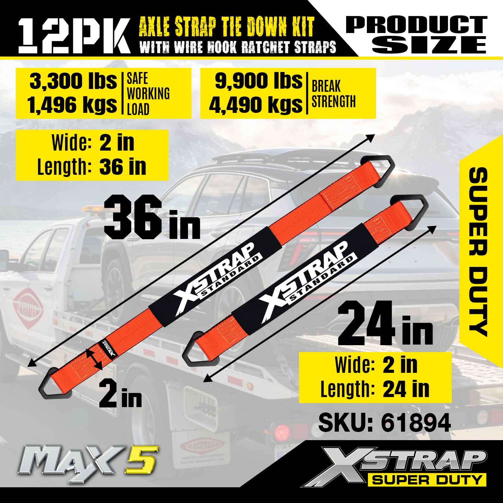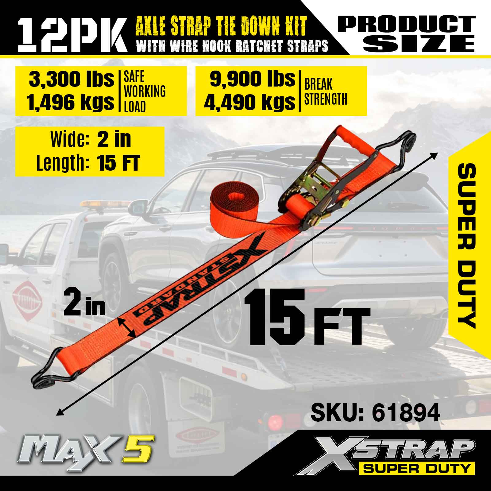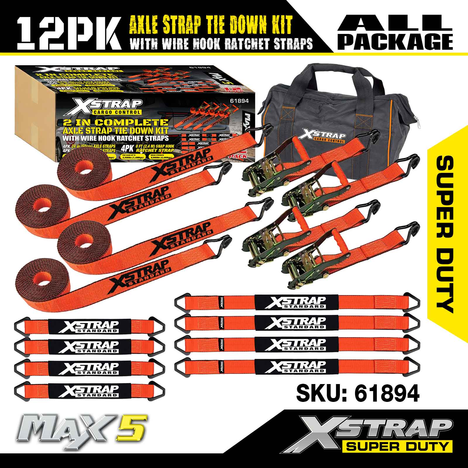 Xstrap 12PK Axle Strap Tie Down Kit (na may Wire Hook Ratchet Straps) – Super Duty. Mayroon itong ligtas na working load na 3,300LBS (1,496KGs) at breaking strength na 9,900LBS (4,490KGs).