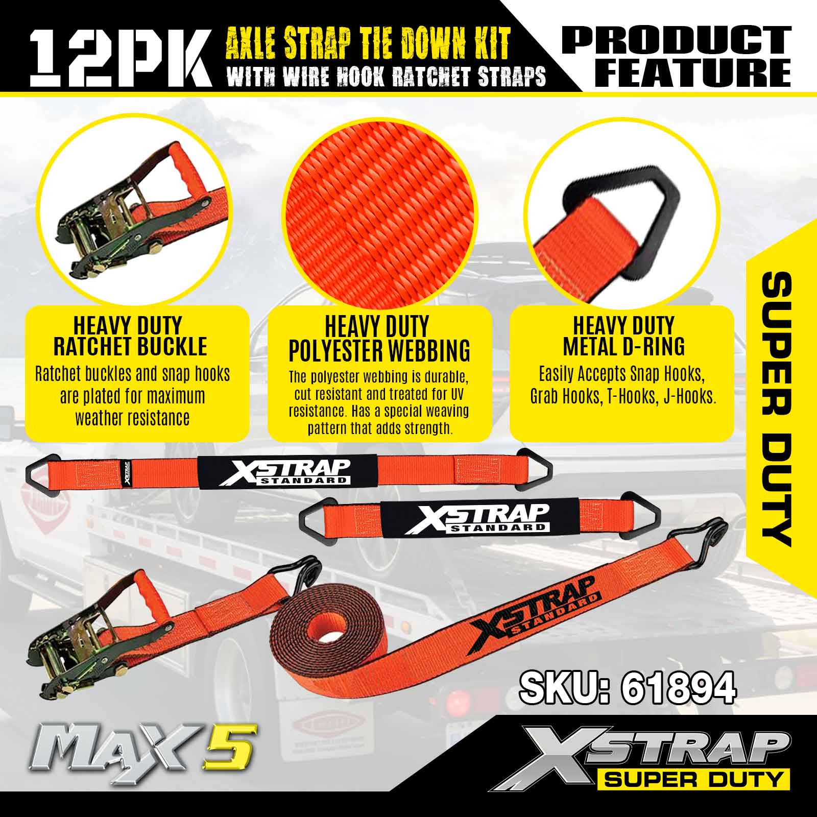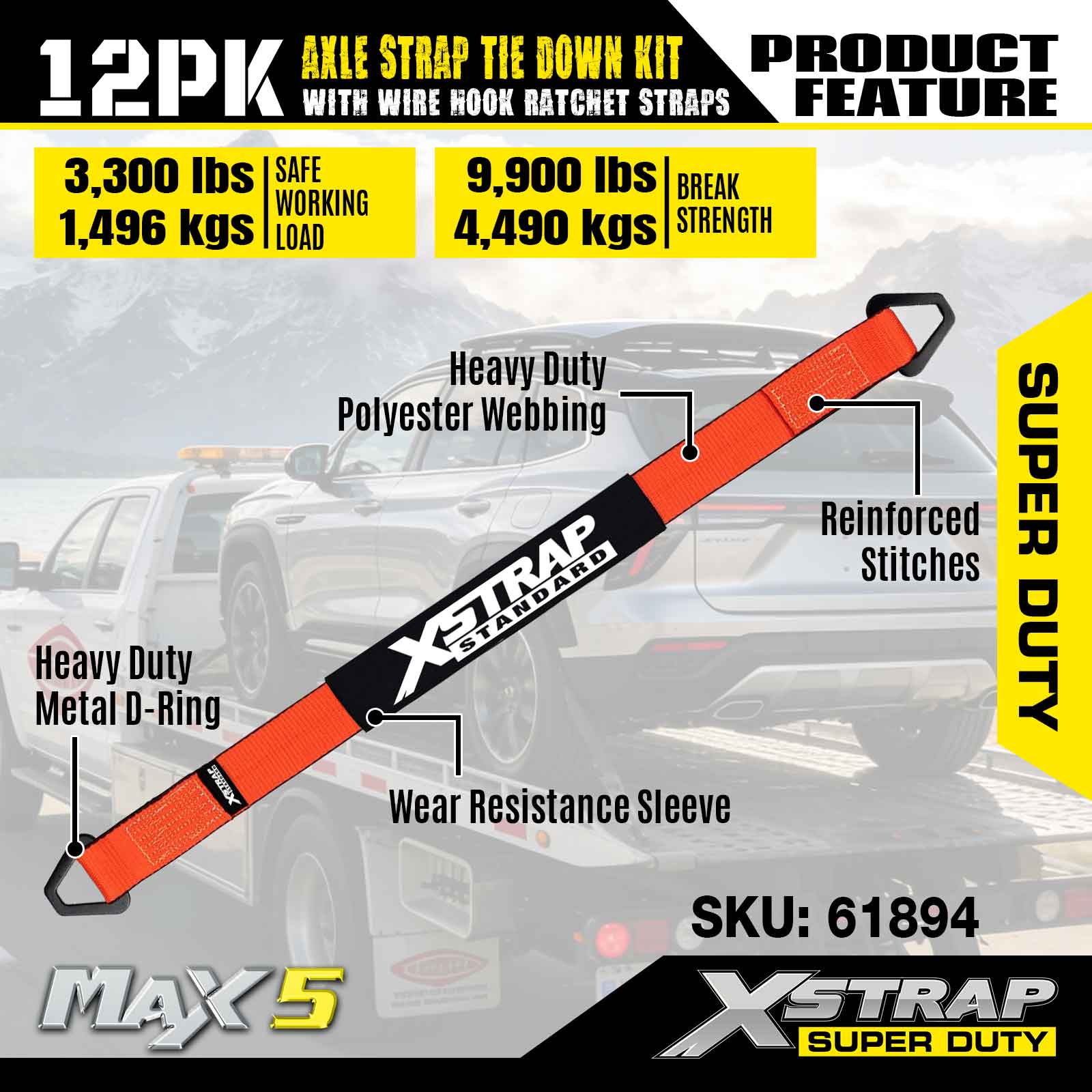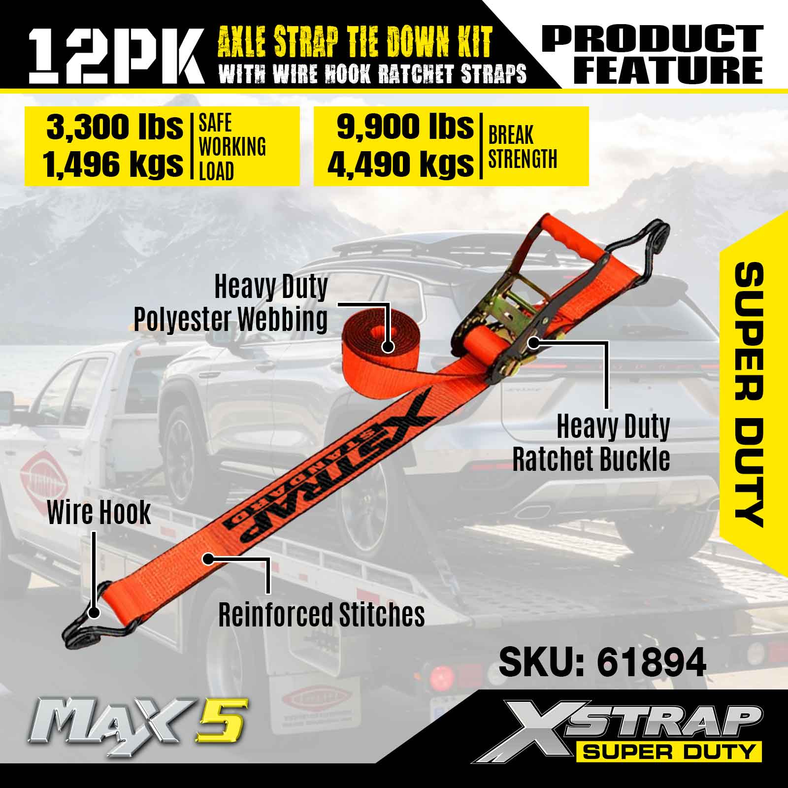 Xstrap 12PK Axle Strap Tie Down Kit (na may Wire Hook Ratchet Straps) – Super Duty. Mayroon itong ligtas na working load na 3,300LBS (1,496KGs) at breaking strength na 9,900LBS (4,490KGs).