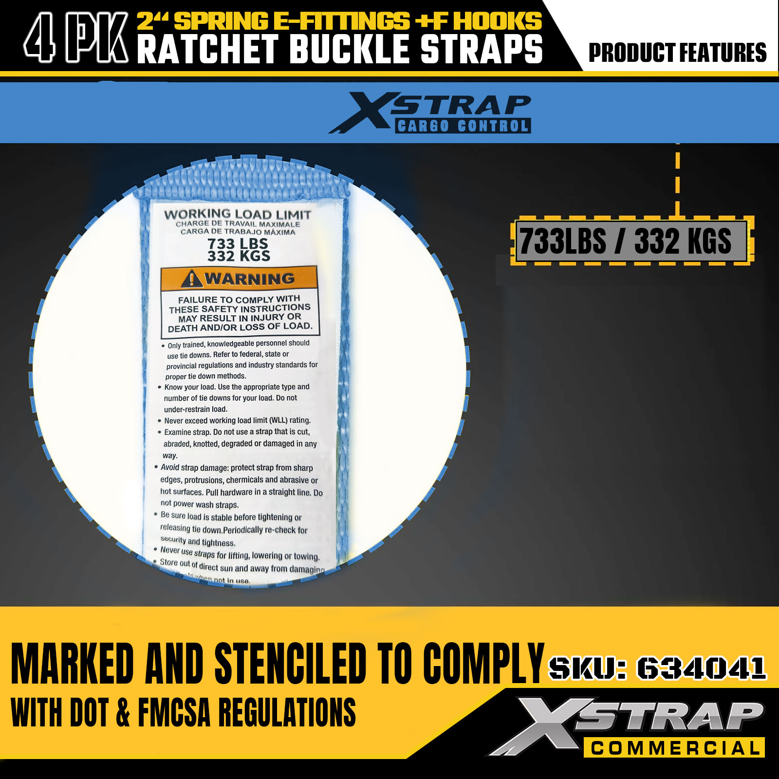 - Nababasang Mga Tagapahiwatig ng Kaligtasan: Ang bawat strap ay malinaw na may label na may ligtas na working load (SWL) na 733 lbs at maximum load capacity na 332 lbs, na nag-aalok ng mahahalagang tagubilin sa kaligtasan para sa tama at secure na aplikasyon.