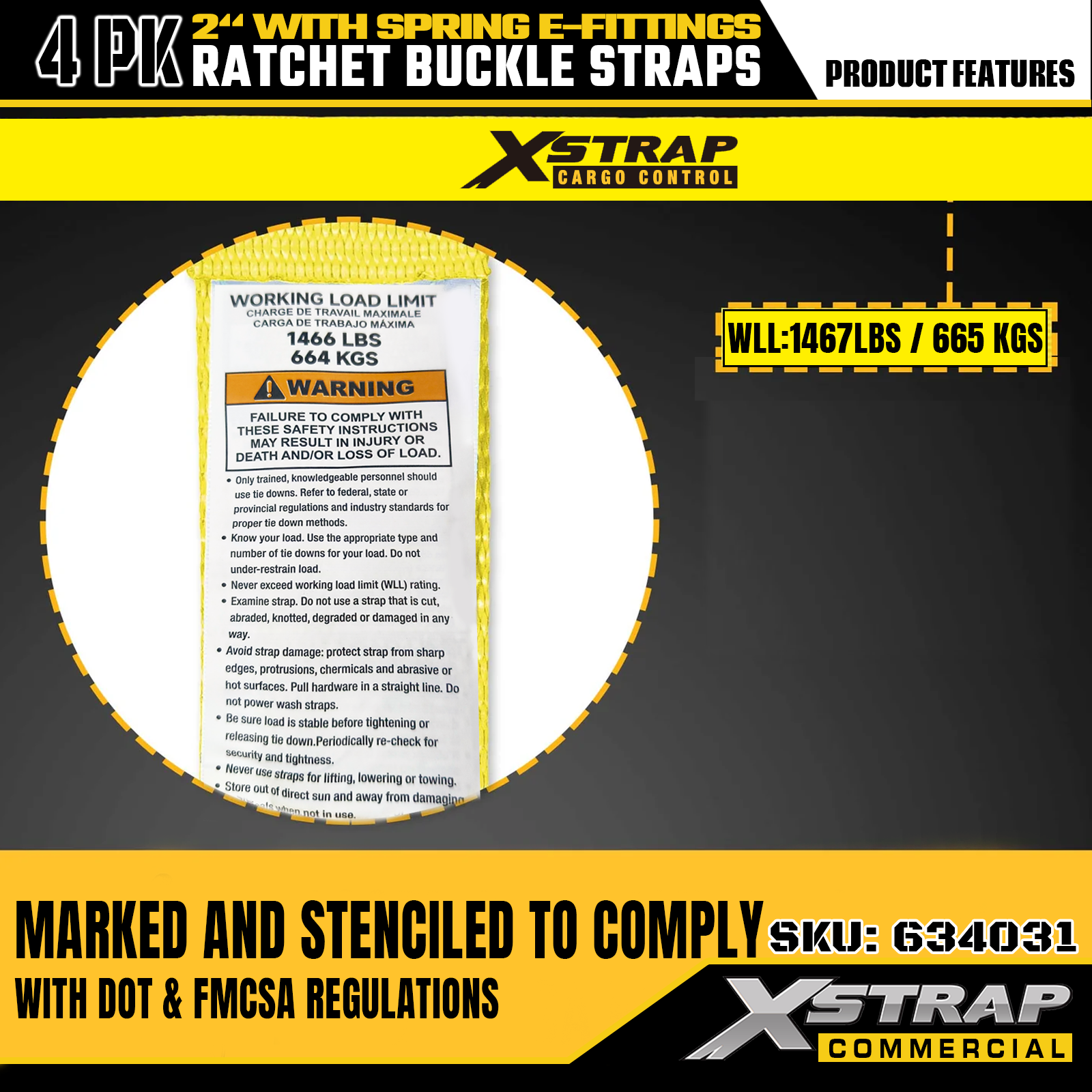 - Clear Safety Labeling & Convenient 4-Pack: Ang bawat strap ay malinaw na may label na may safe working load (SWL) na 1467 lbs at ang maximum breaking strength na 4401 lbs, na nagbibigay ng mahalagang impormasyon sa kaligtasan para sa wastong paggamit. May 4-pack na configuration, perpektong nakakatugon sa mga pangangailangan ng batch na paggamit sa iba't ibang cargo control at paglipat ng mga sitwasyon.