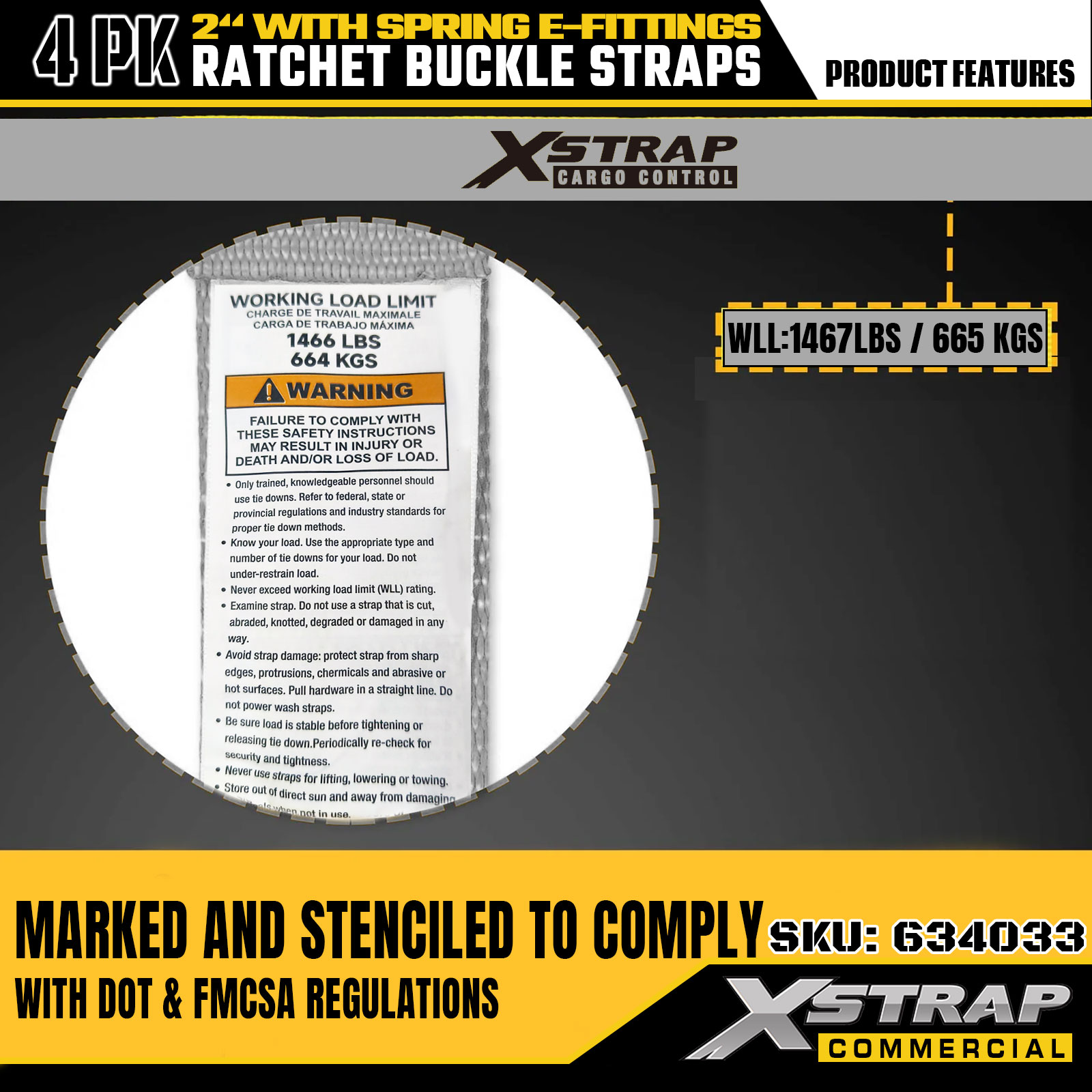 Xstrap 4 Pack Ratchet Tie-Down Straps, 2" x 16' Polyester Cargo Securing Straps, 1467 lbs Safe Working Load at 4401 lbs Breaking Strength, na may Metal E Hooks para sa Truck, Mower, ATVs2. Detalye ng produkto:
