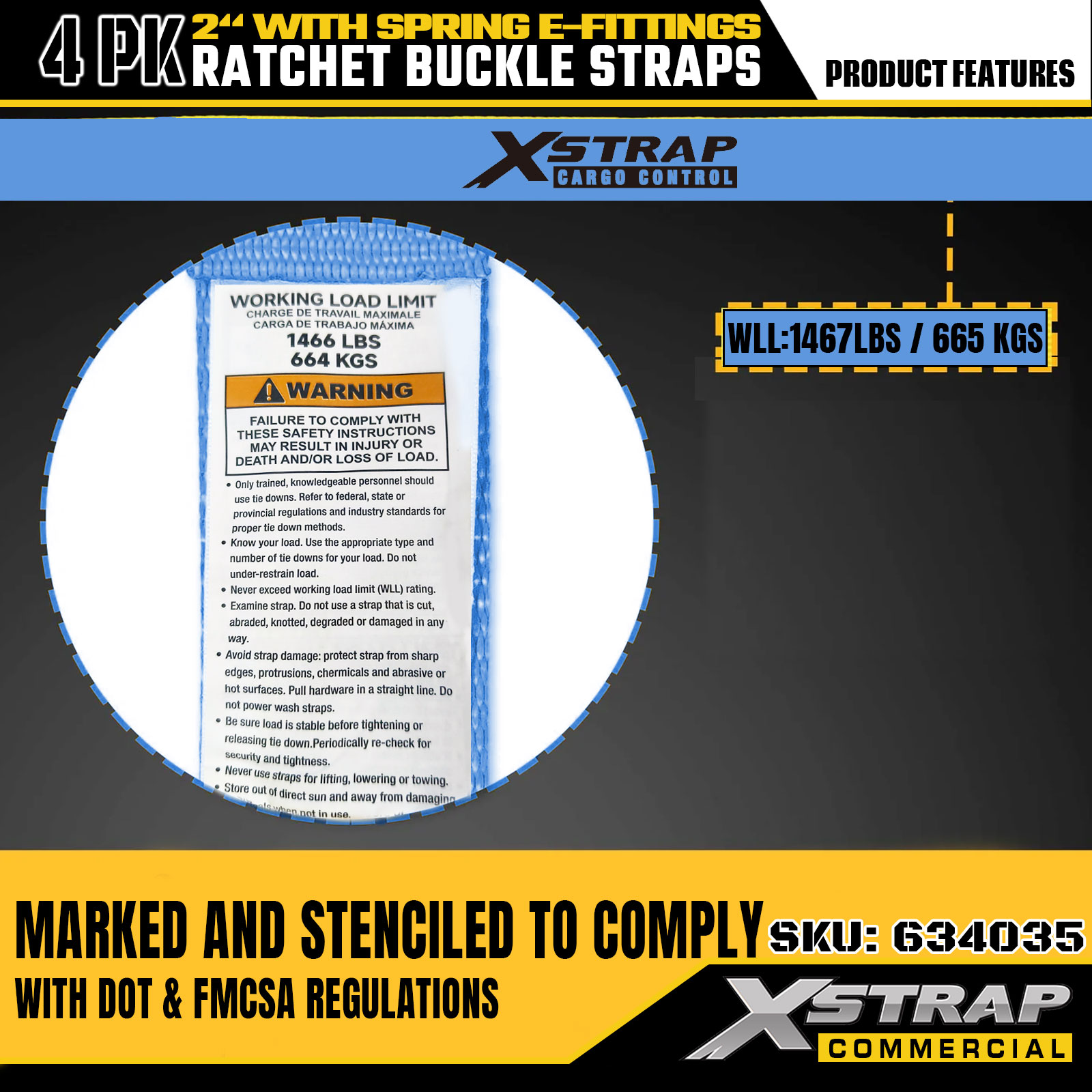 Xstrap 4 Pack Ratchet Tie-Down Straps, 2" x 12' Polyester Cargo Securing Straps na may Spring E-Fittings, 1467 lbs Safe Working Load (SWL) at 4401 lbs Breaking Strength, para sa mga Truck, Mower, ATV