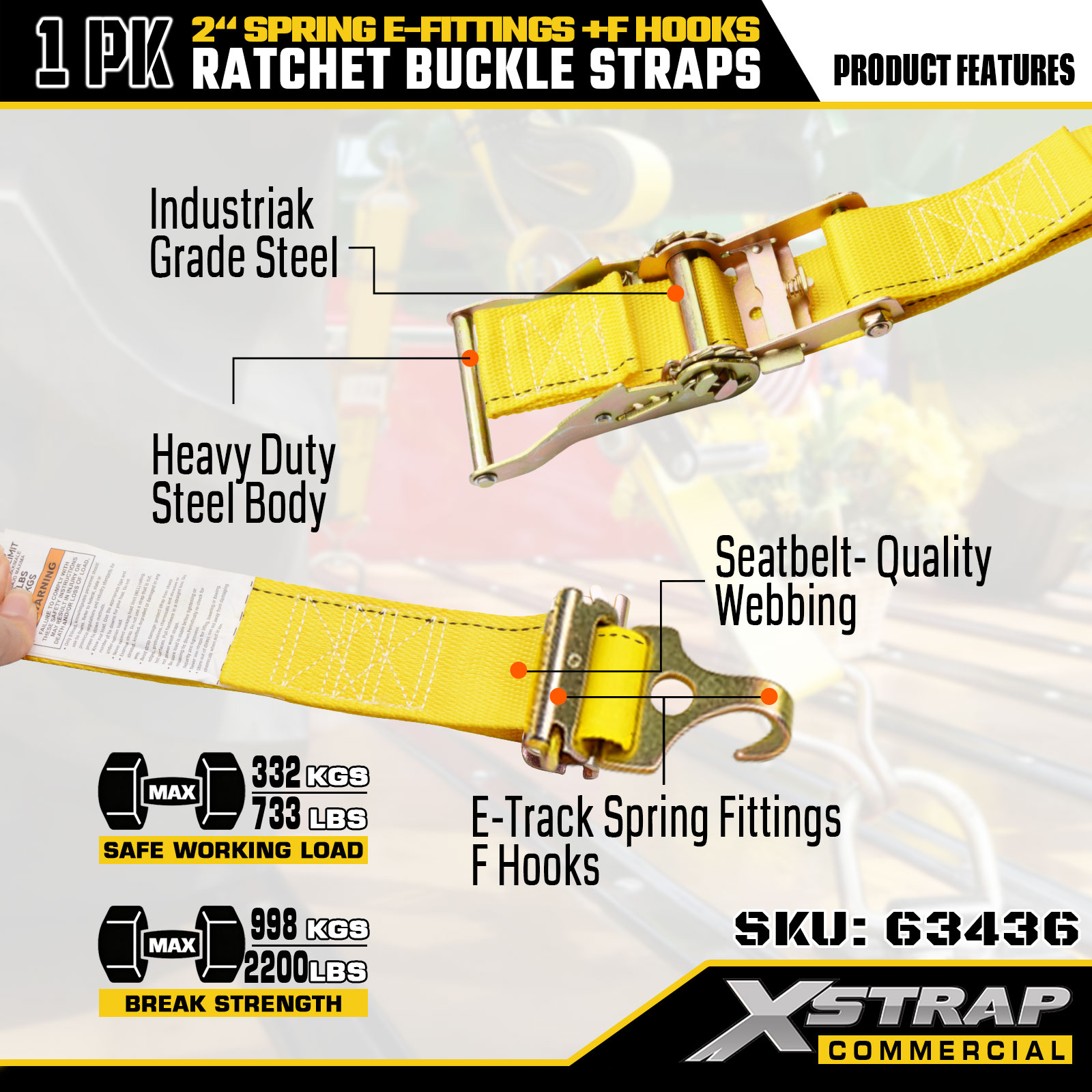 Xstrap 1-Pack Tie-Down Ratchet Straps, 2" x 12' Heavy Duty Cargo Tie-Downs na may Spring E-Fittings at F Hooks (Dilaw), 733 lbs na Kapasidad para sa Mga Trailer, Truck, Van, at Motorcycle Securing