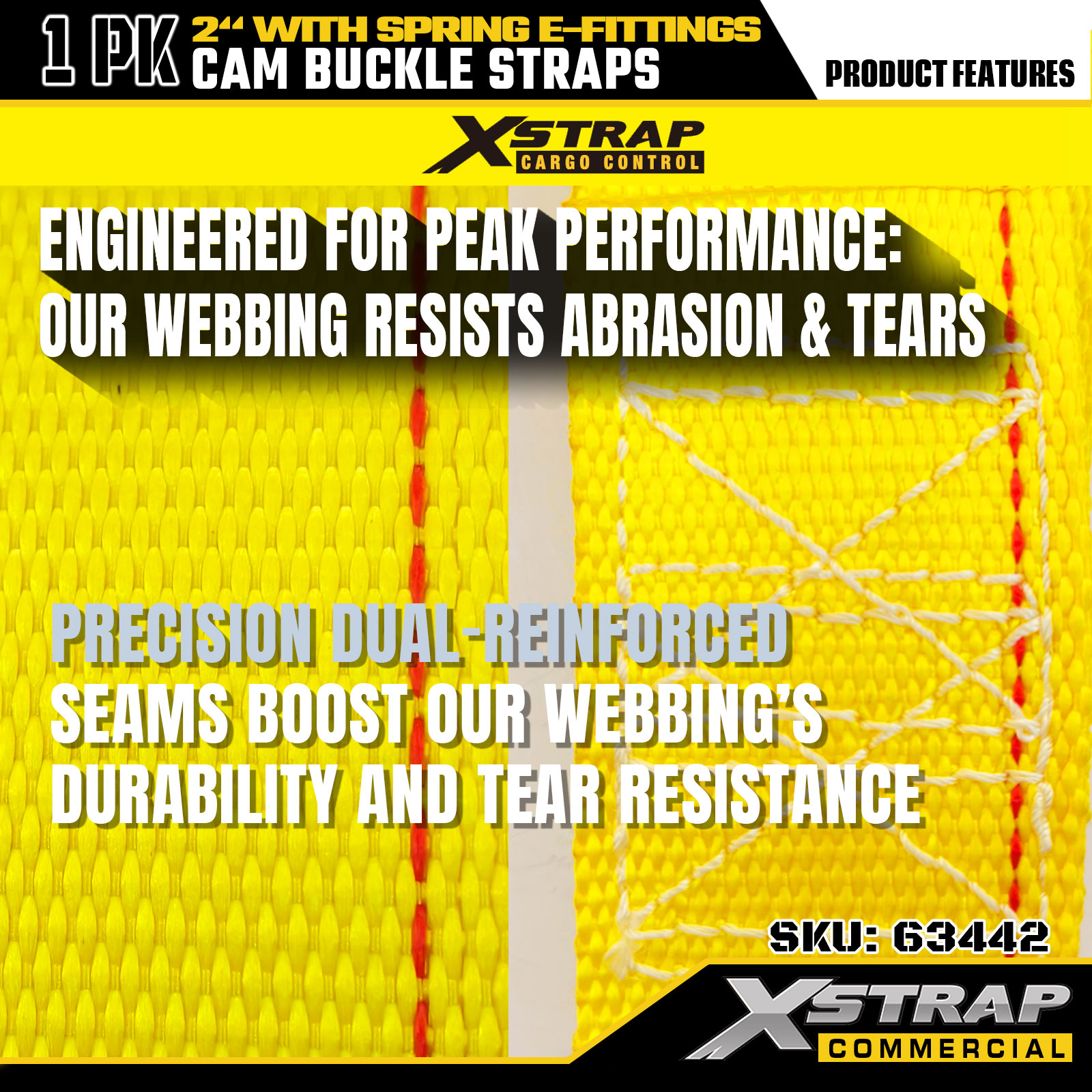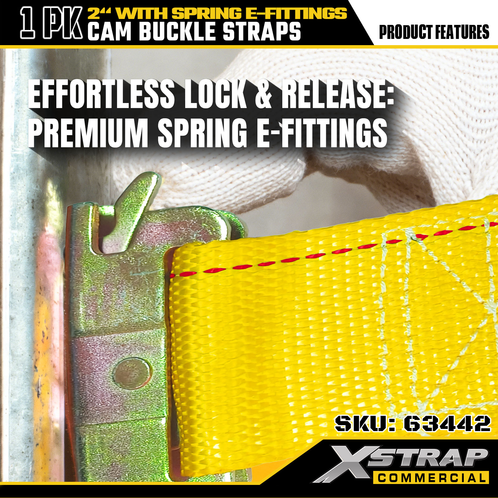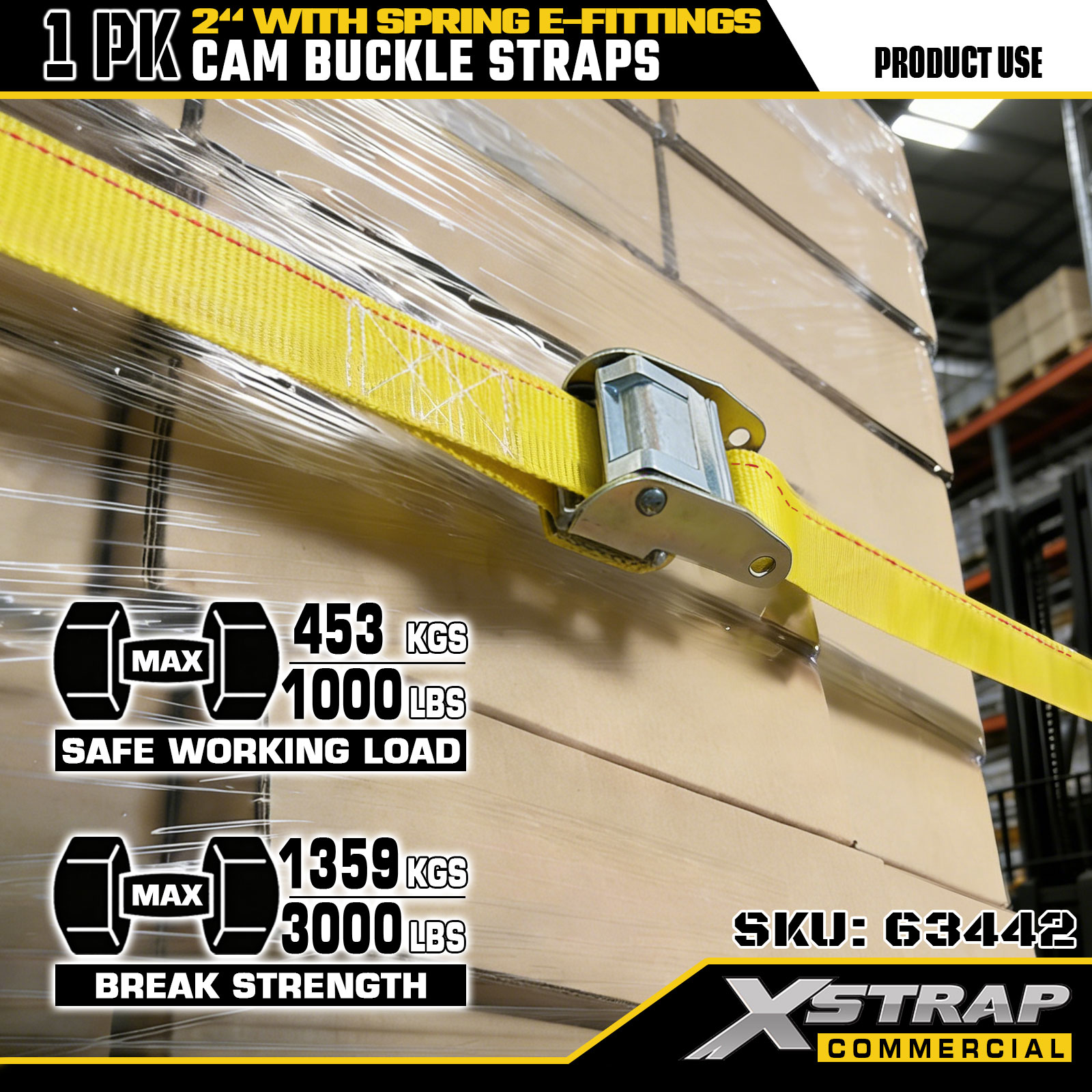 Xstrap 63442 Heavy-Duty Cam Buckle Strap 2" x 12' (1PK) - Dilaw Polyester na may Spring E-Fittings, 1000 lbs SWL & 453 lbs Breaking Strength para sa Paggalaw, Cargo Control at Transport