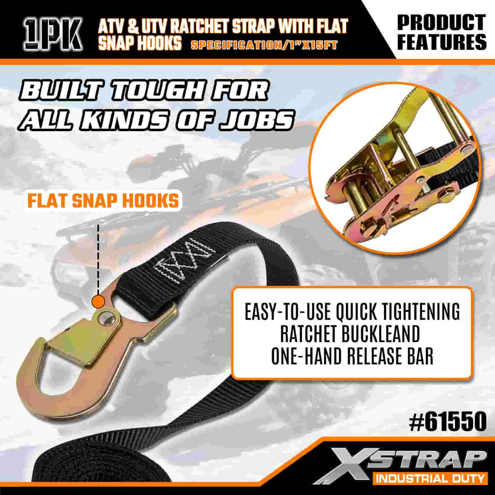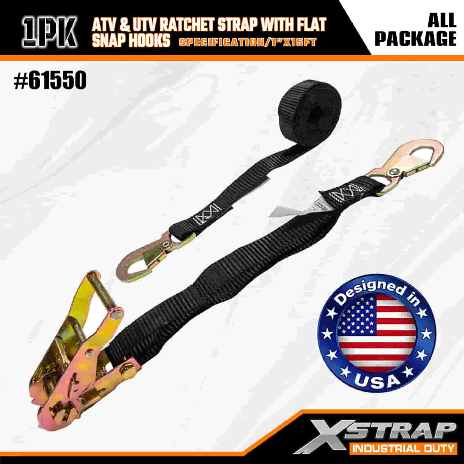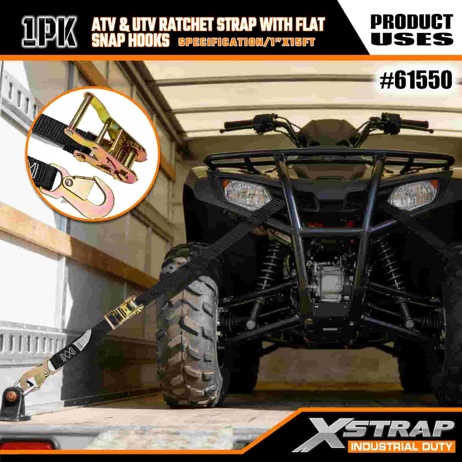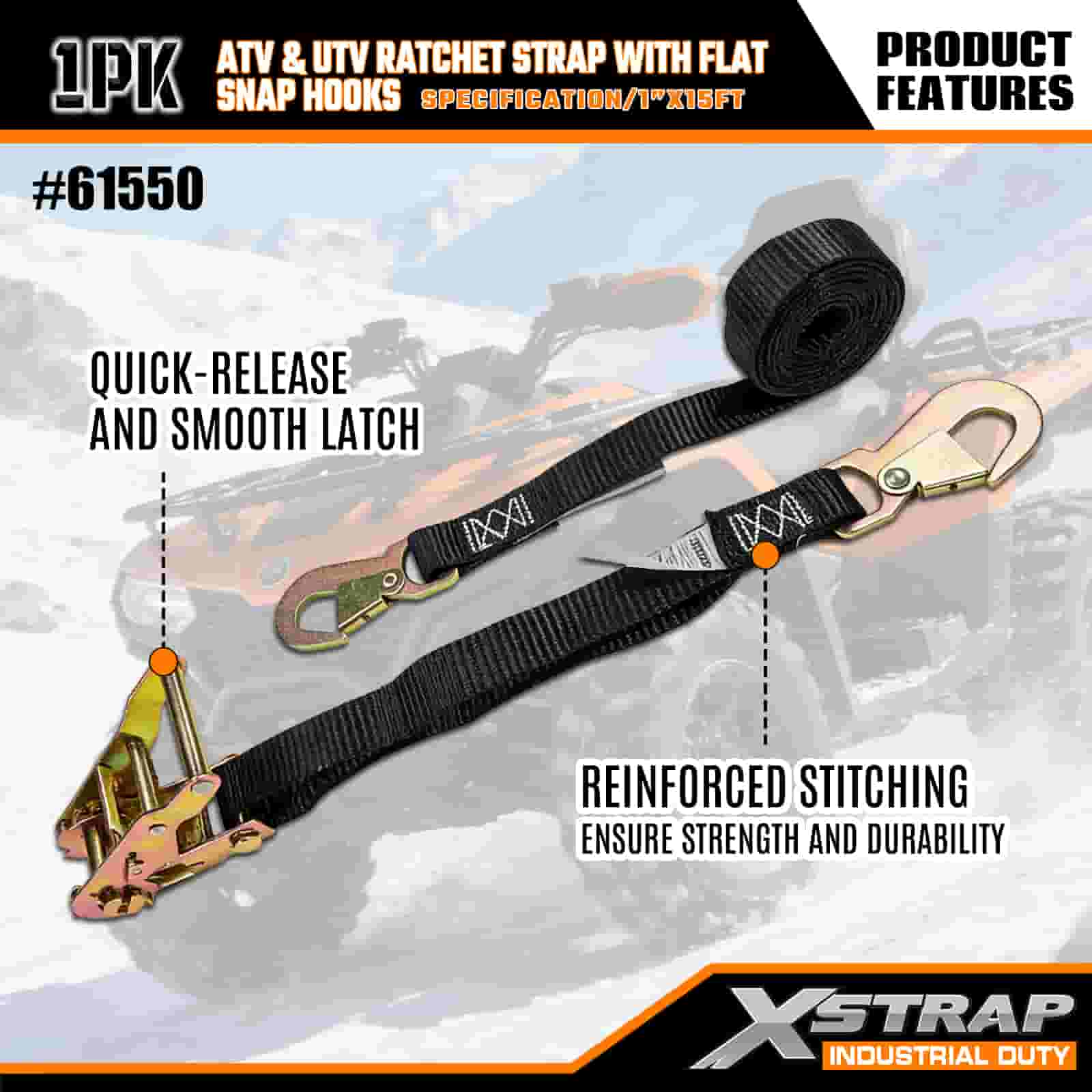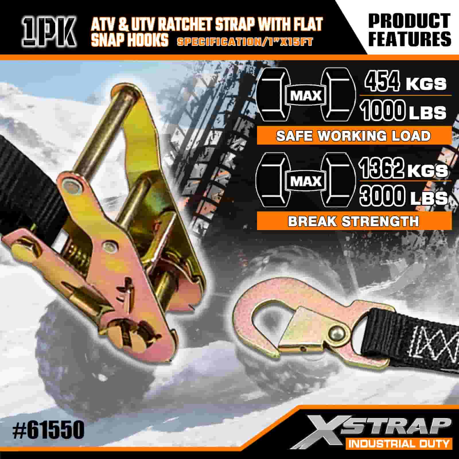 Xstrap ATV at AUV Ratchet Strap na may Flat Snap Hooks, 1” x 15’ Polyester Tie Down Strap Ratchet Strap, 1000lbs Kapasidad Cargo Lashing Securing Straps na may Flat Snap para sa Trailer, Flat Bed Trailer Ski Boat, Maliit na Kotse, Malakas na Kagamitan.