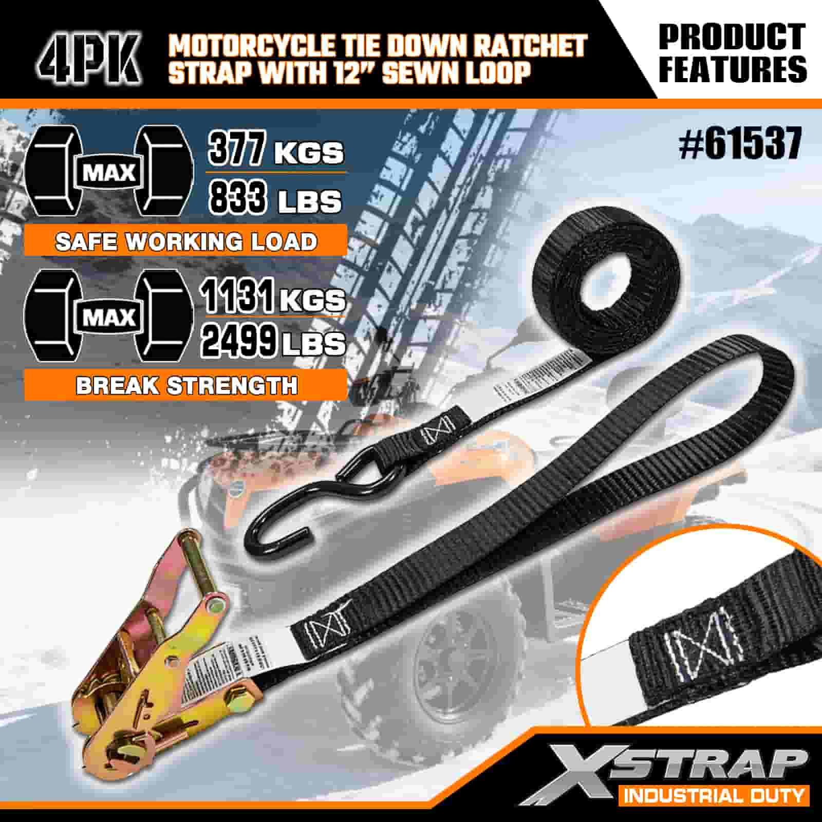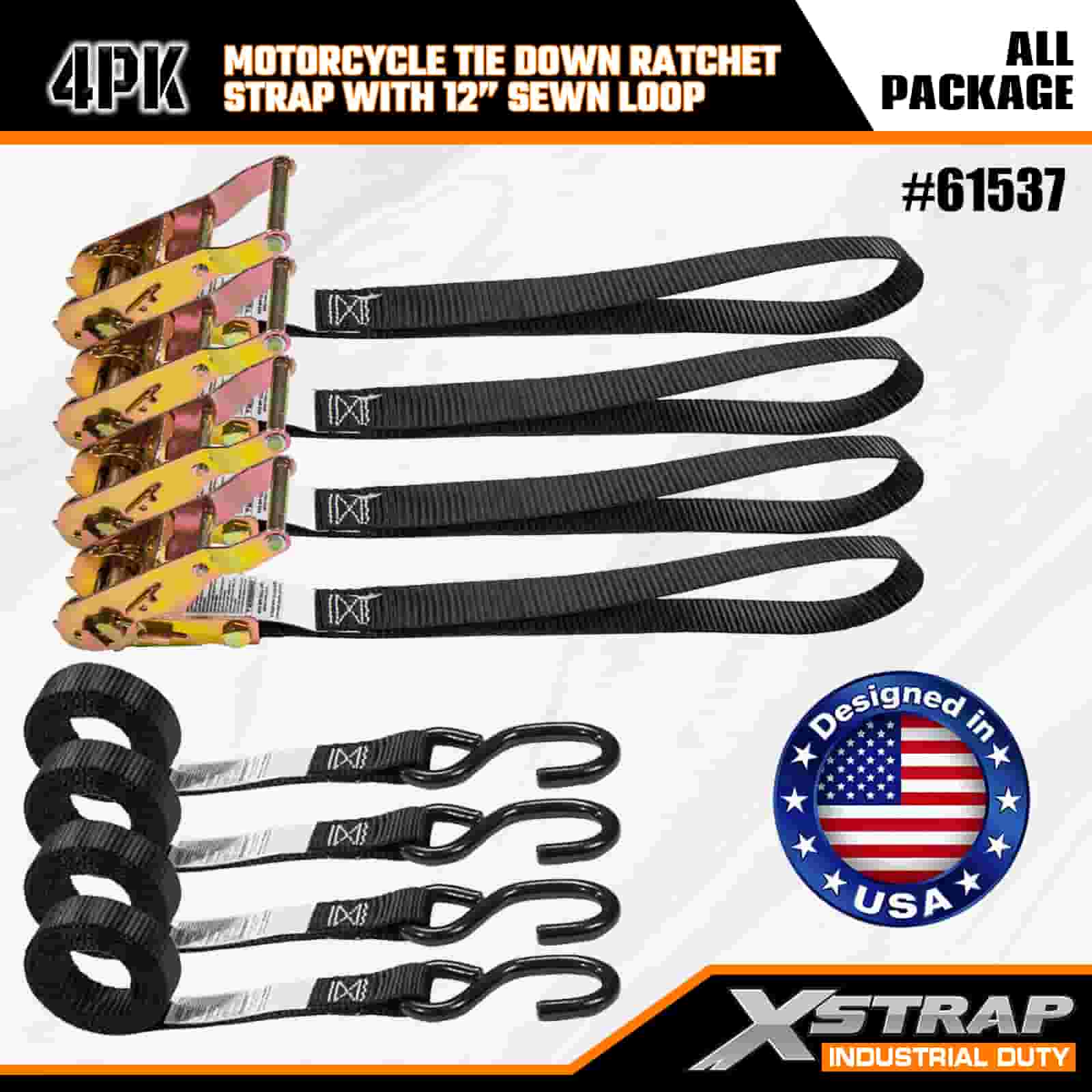 Xstrap 4PK Motorcycle Tie Down Ratchet Strap na may 12” Sewn Loop, 1” x 6’ Polyester Tie Down Strap Pull Ratchet Strap, 833lbs Kapasidad Cargo Lashing Securing Straps na may S Hook para sa Seryosong Propesyonal na Secure Cargo Trailer, Flat Bed Trailer, Ski Boat, Maliit na Kotse.