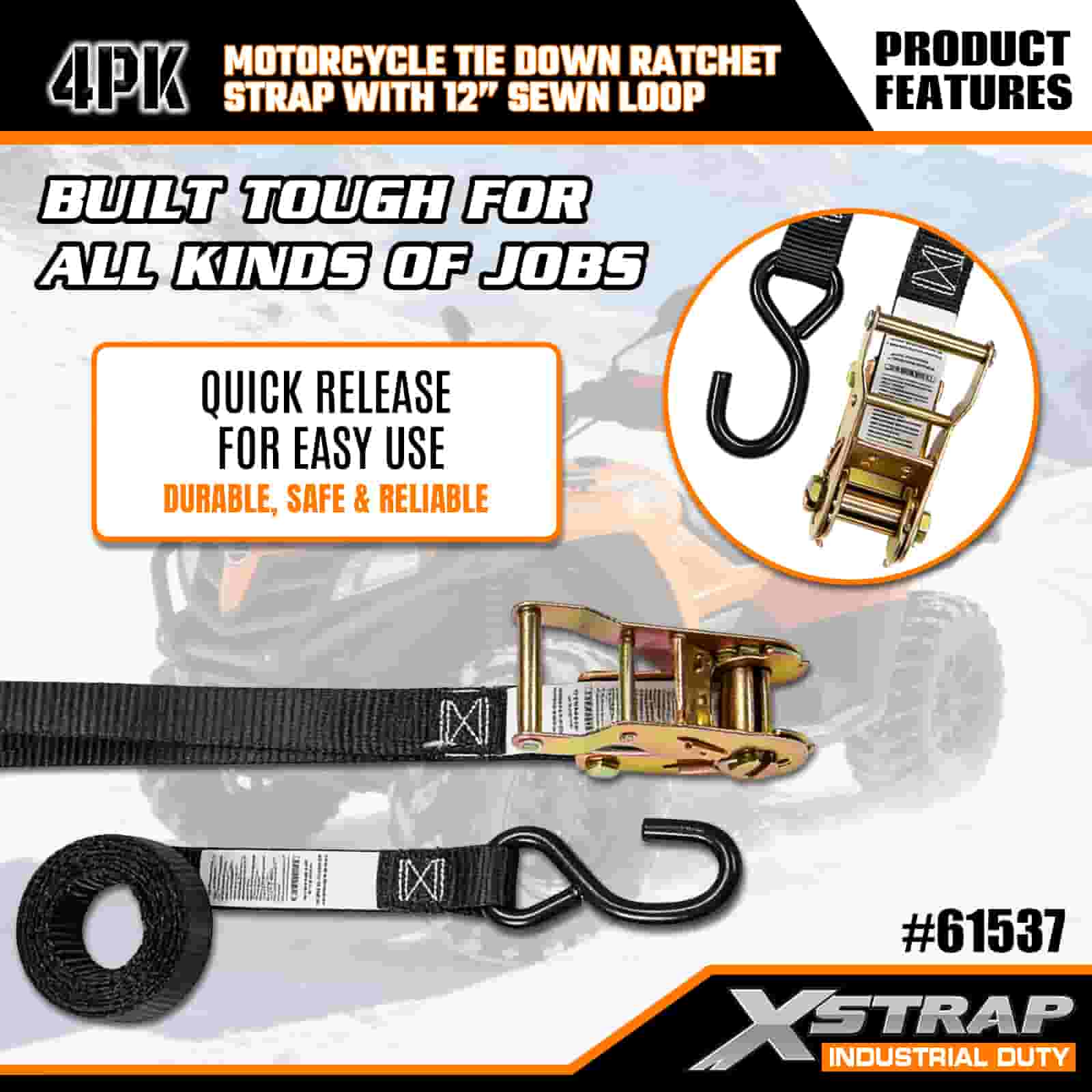 - 4-Pack 6FT Straps para sa Motorcycle Tie-Down: Ibinenta bilang isang 4-strap na set (1 pulgada ang lapad × 6 na talampakan ang haba), perpekto para sa pag-secure ng mga motorsiklo, ATV, at maliliit na gear sa mga kama ng trak o habang dinadala.