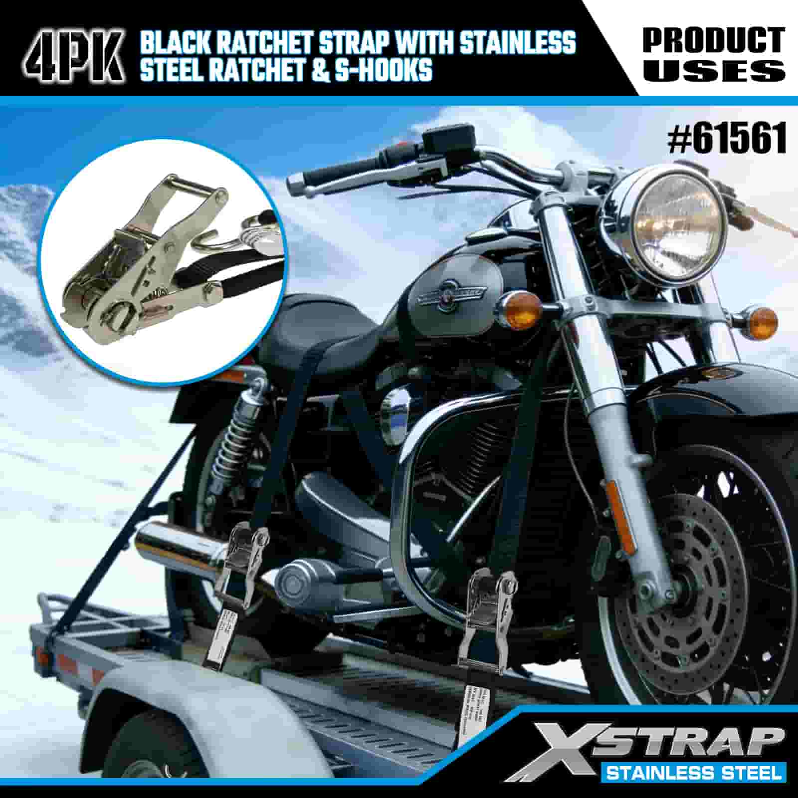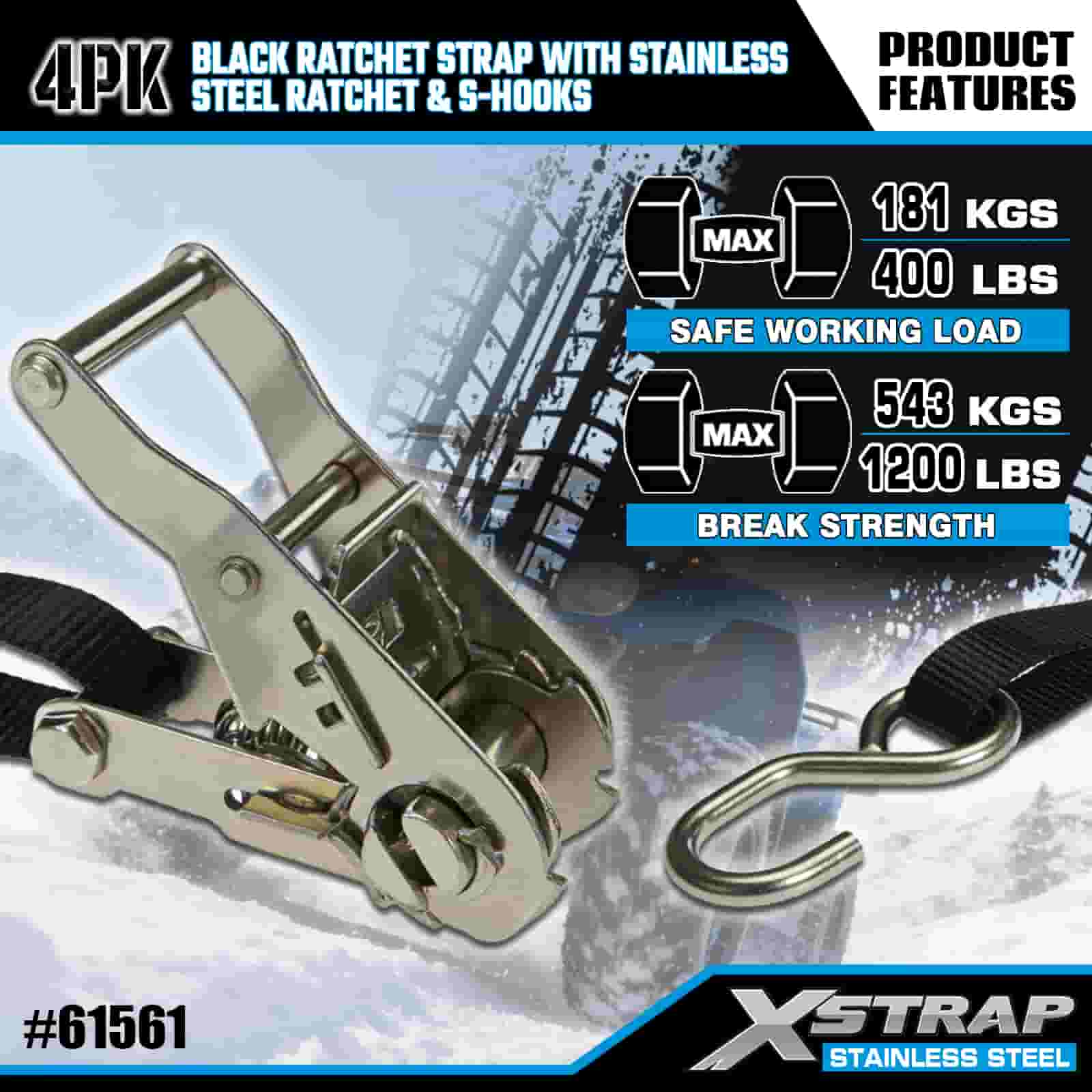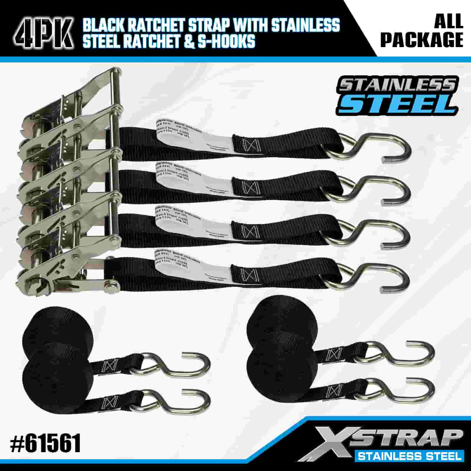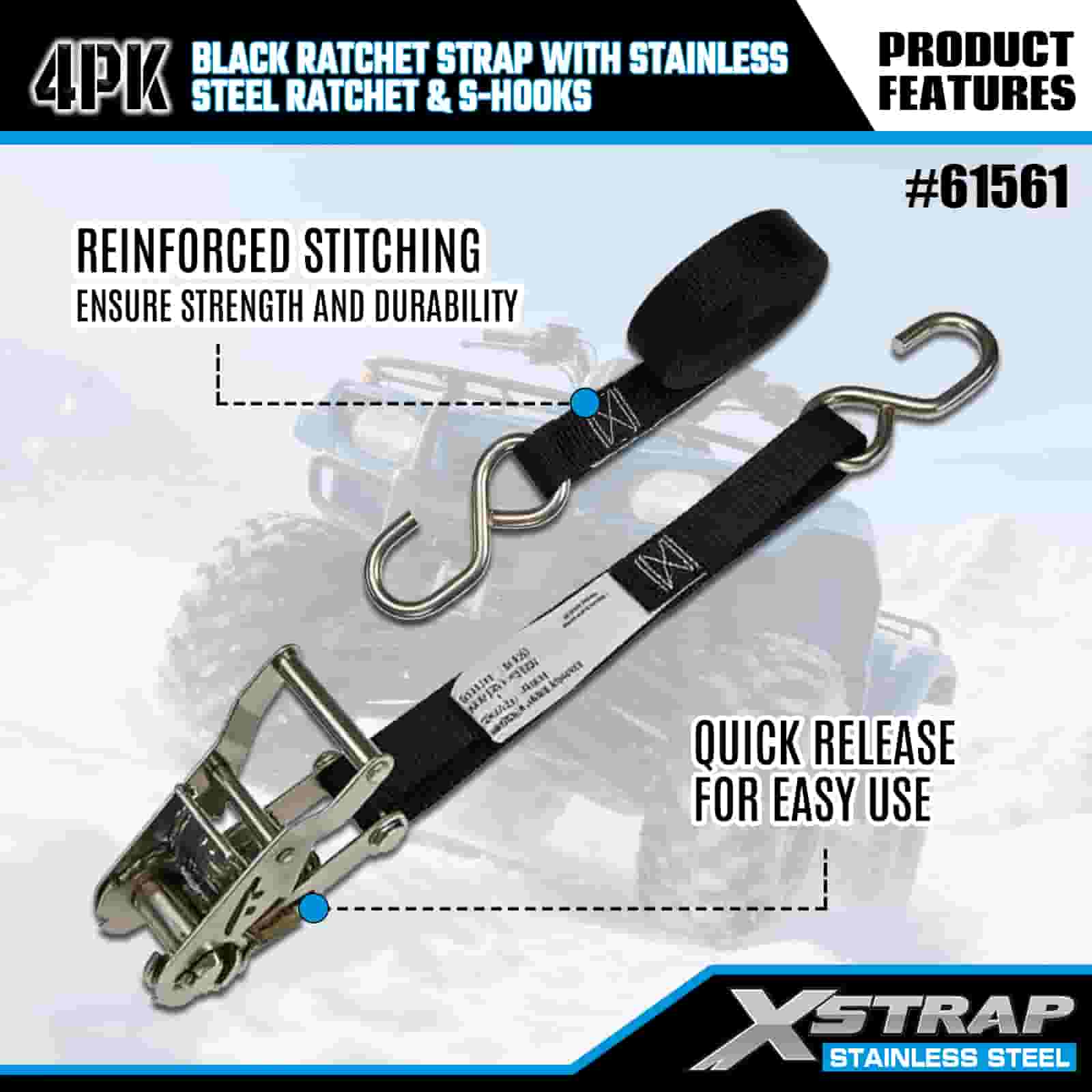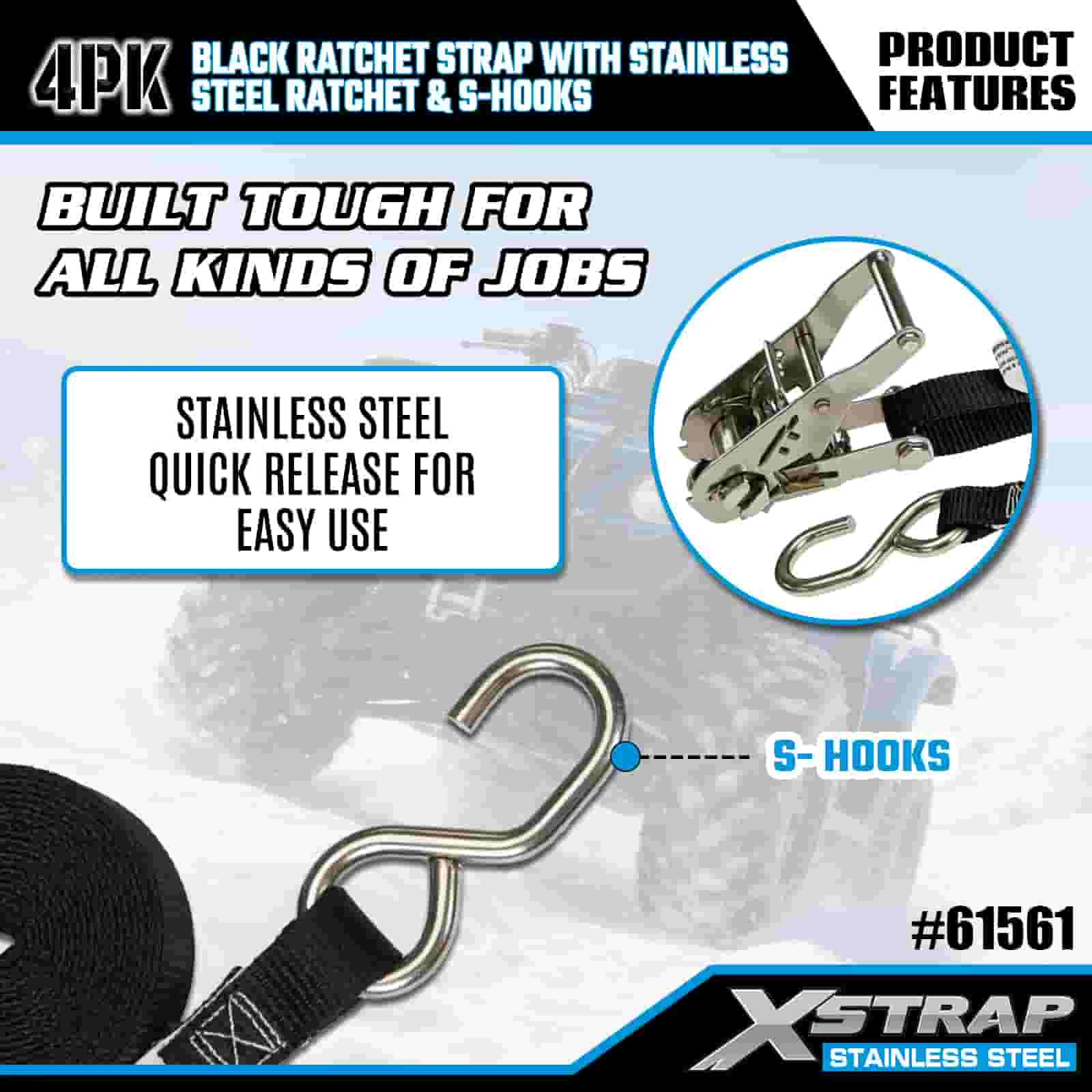 Xstrap 4PK Itim Ratchet Strap na may Stainless Steel Ratchet at S Hooks, 1” x 6’ Polyester Tie Down Strap Ratchet Strap, 400lbs Kapasidad Cargo Lashing Securing Straps na may S Hooks para sa Trailer, Flat Bed Trailer Ski Boat, Maliit na Kotse, Malakas na Kagamitan.