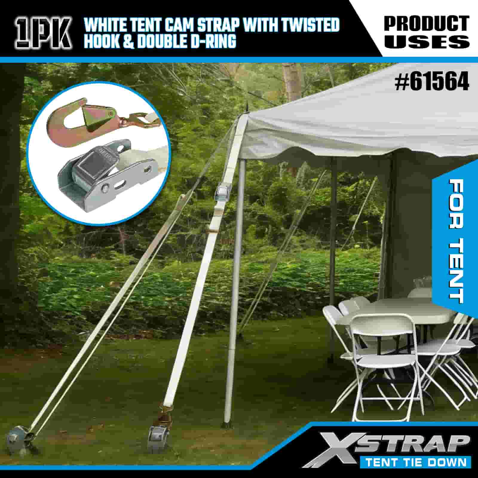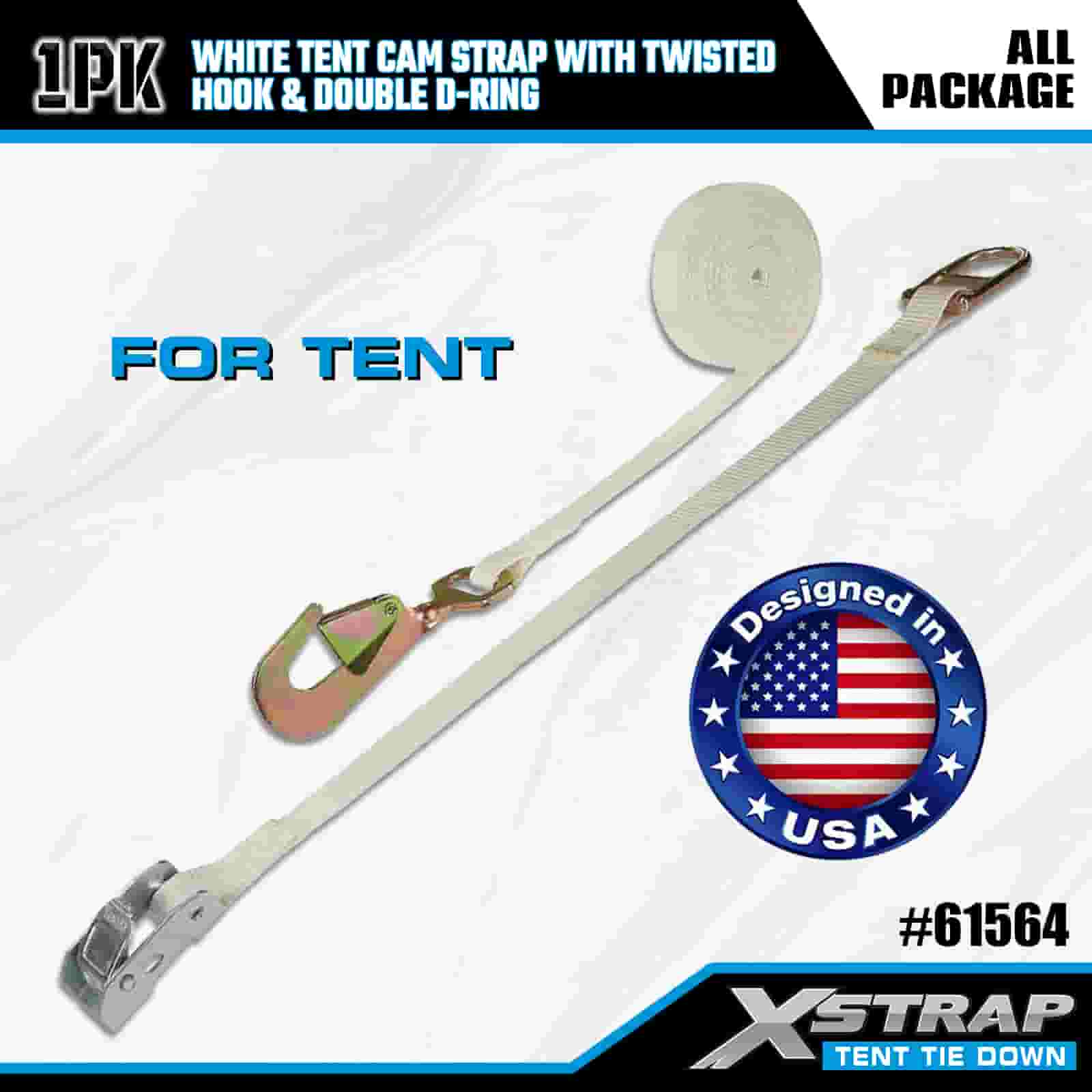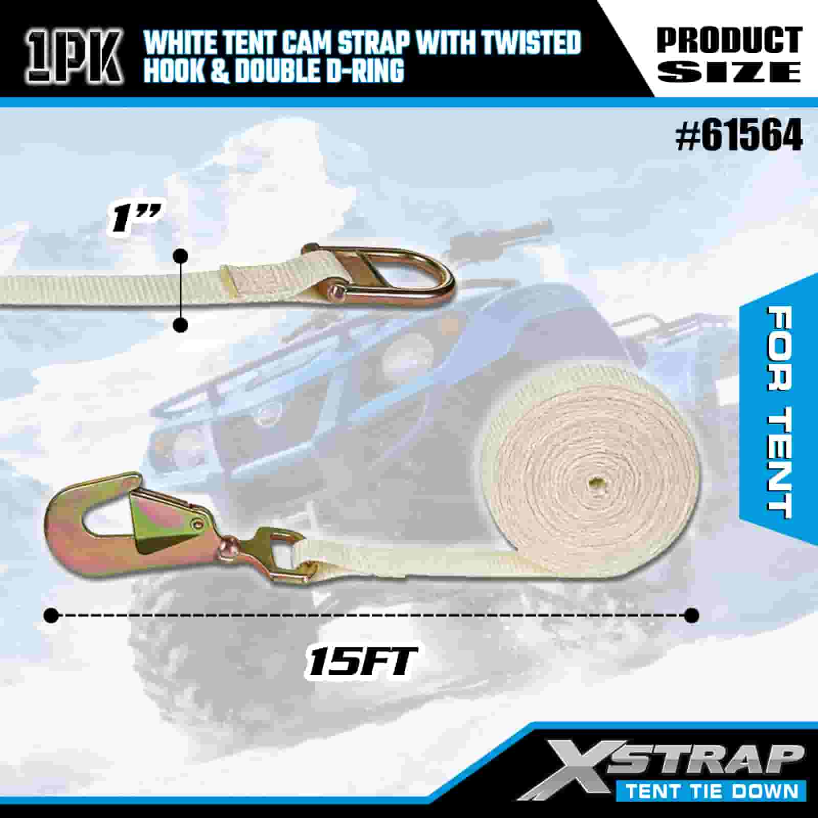 1” x 15’ White Tent Cam Strap na may Twisted Hook at Double D Ring