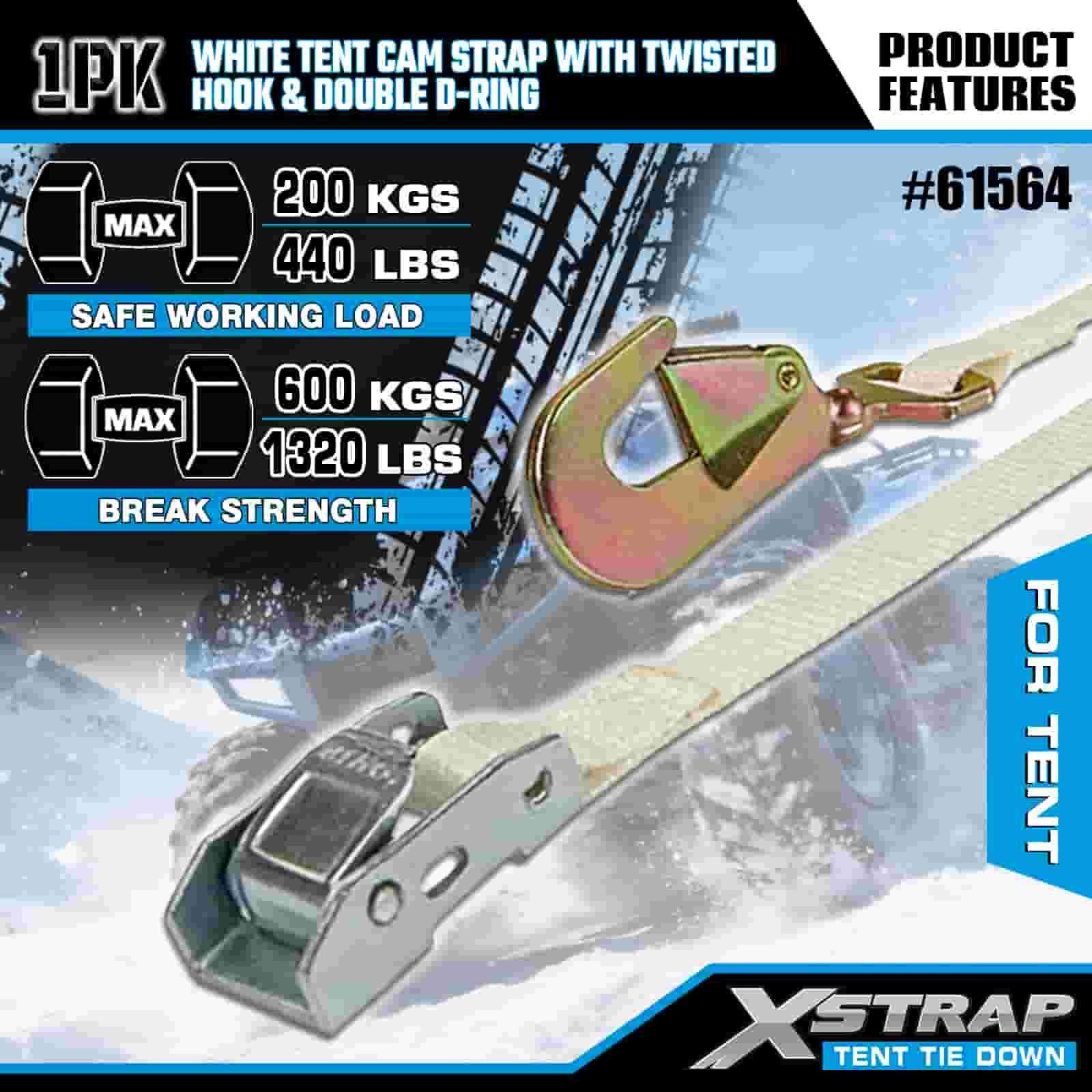 Xstrap Puti Tent Cam Strap na may Twisted Hook at Double D Ring, 1" x 15' Polyester Tie Down Strap Ratchet Strap, 440lbs Kapasidad Cargo Lashing Securing Straps na may Twisted Hook at Double D Ring para sa Cargo Control, Tent fixation.