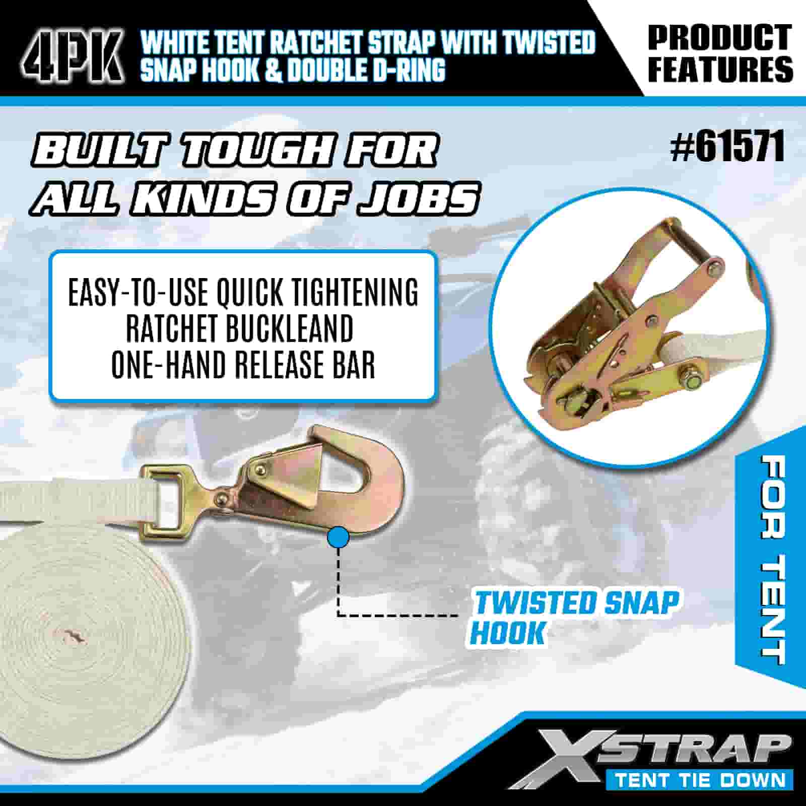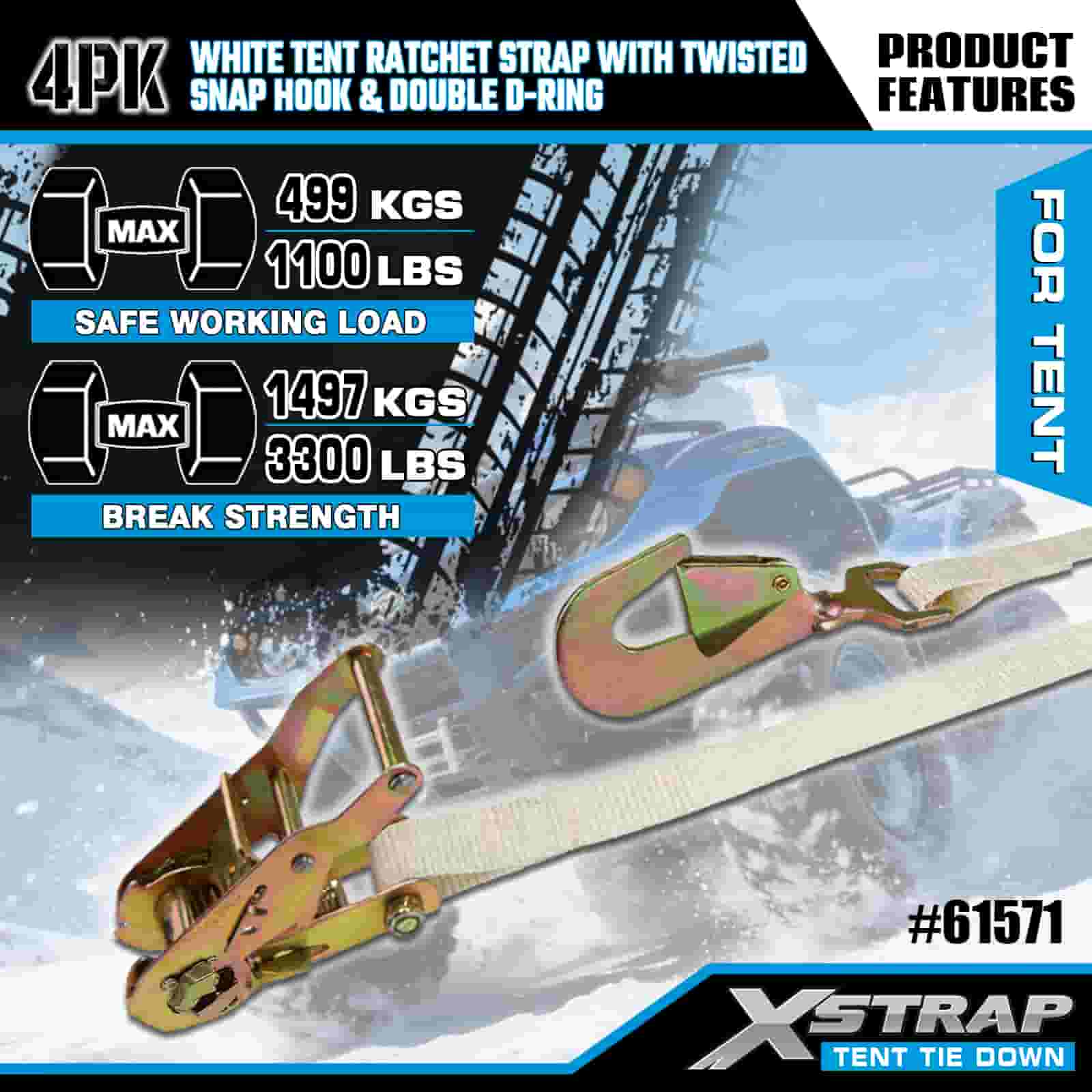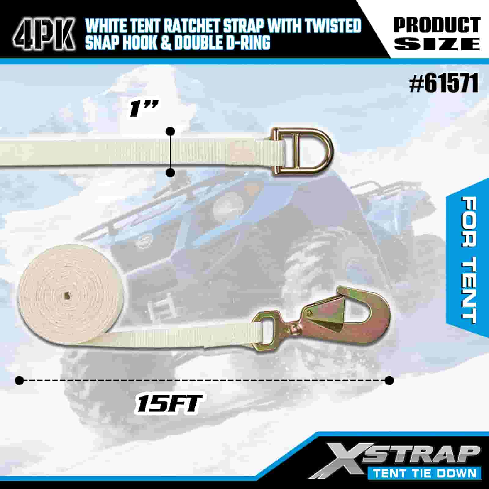 Xstrap 4PK Puti Tent Ratchet Strap na may Twisted Snap Hook at Double D Ring, 1" x 15' Polyester Tie Down Strap Ratchet Strap, 1100lbs Kapasidad Cargo Lashing Securing Straps na may Twisted Snap Hook at Double D Ring para sa Cargo Control, Tent fixation.