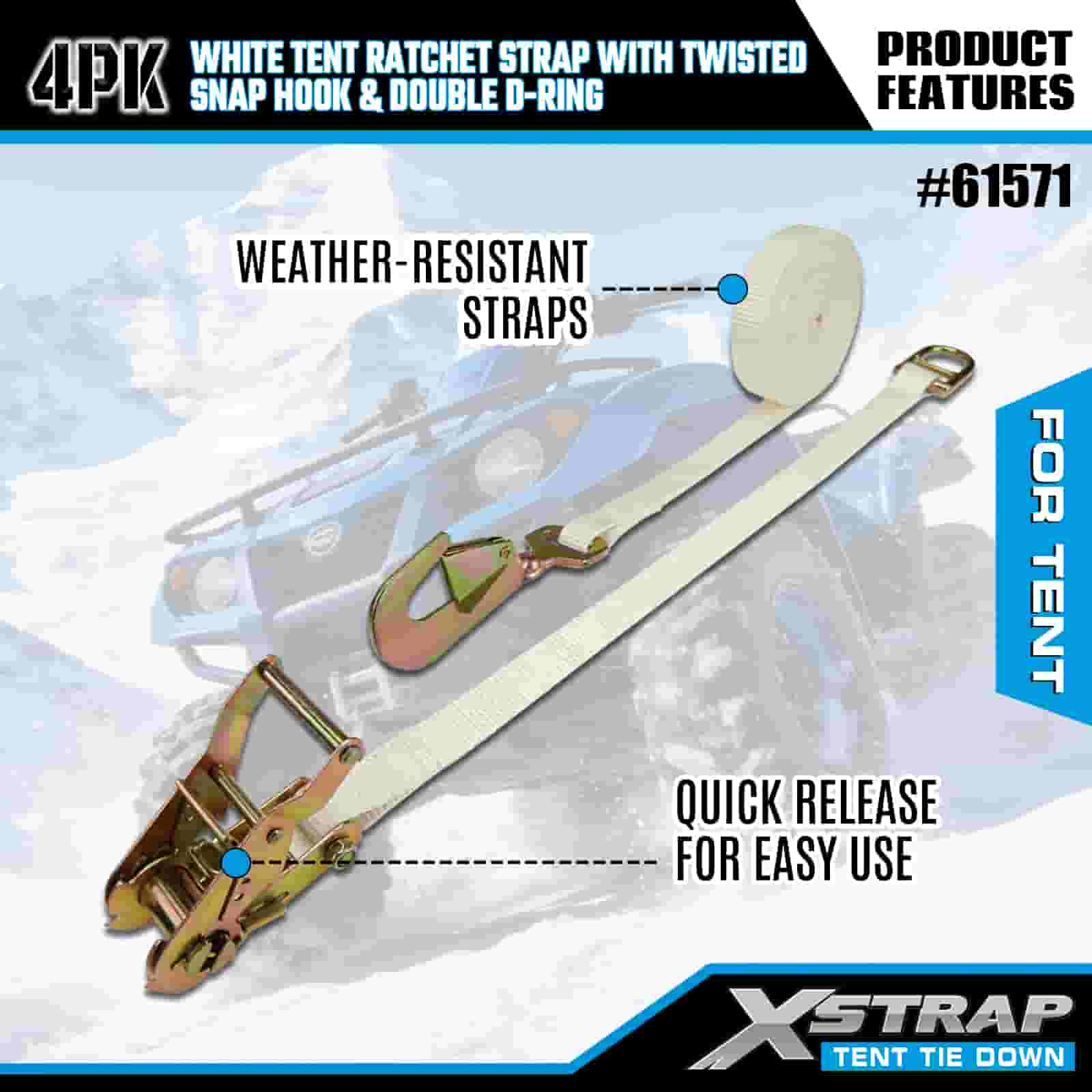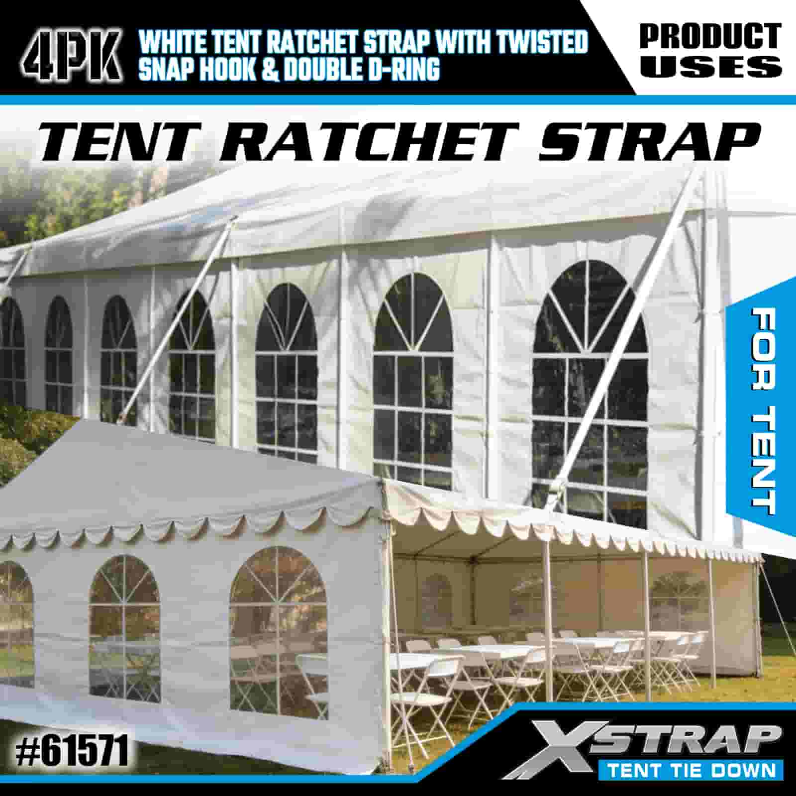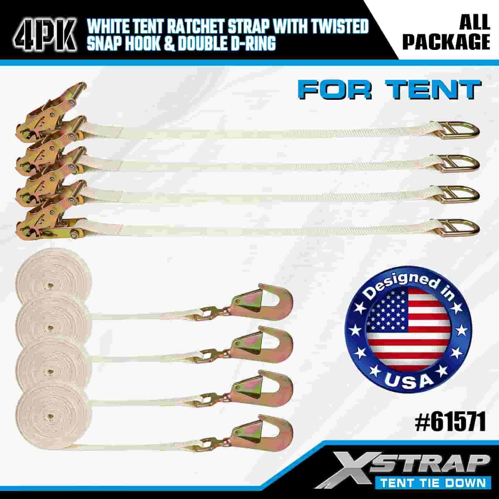Xstrap 4PK Puti Tent Ratchet Strap na may Twisted Snap Hook at Double D Ring, 1" x 15' Polyester Tie Down Strap Ratchet Strap, 1100lbs Kapasidad Cargo Lashing Securing Straps na may Twisted Snap Hook at Double D Ring para sa Cargo Control, Tent fixation.