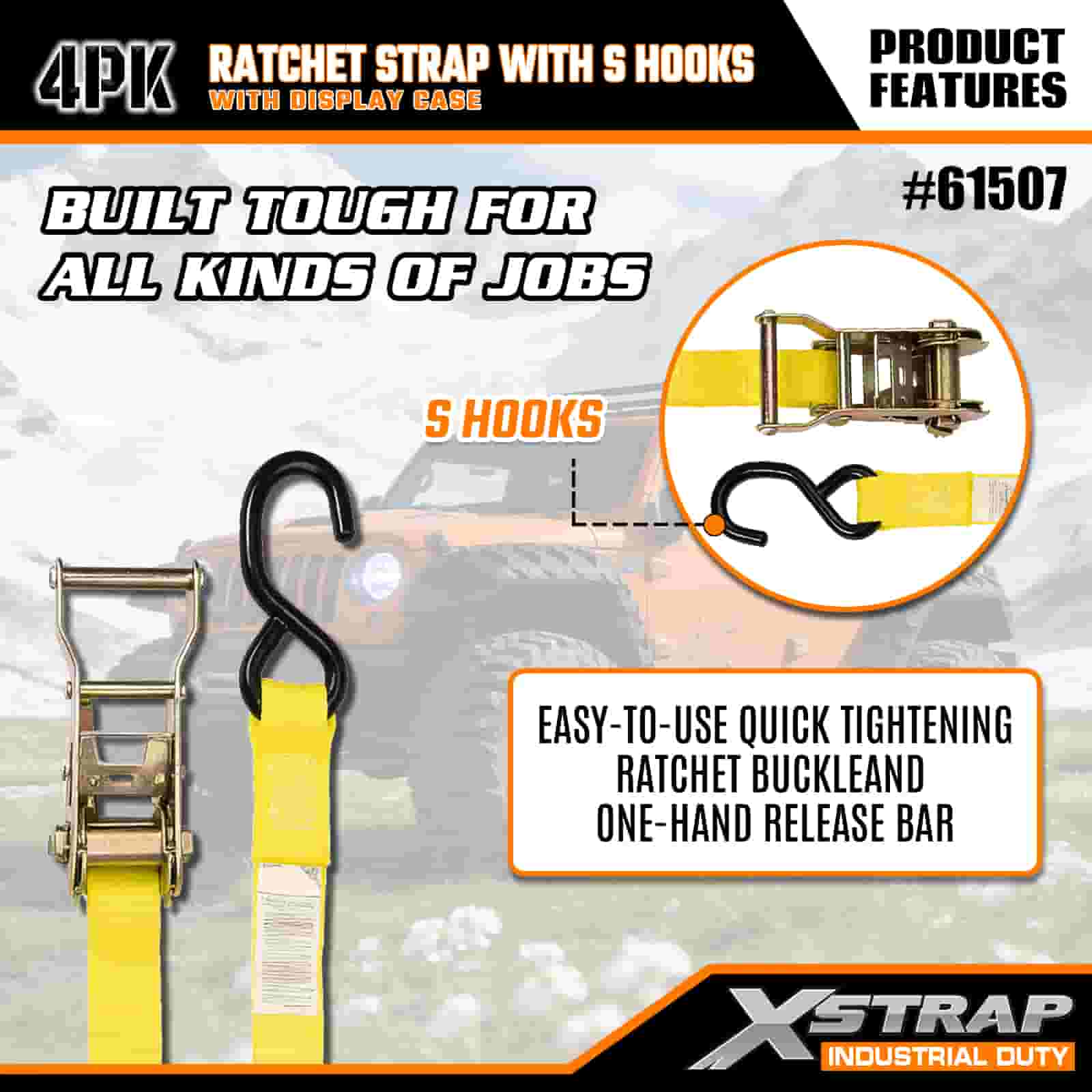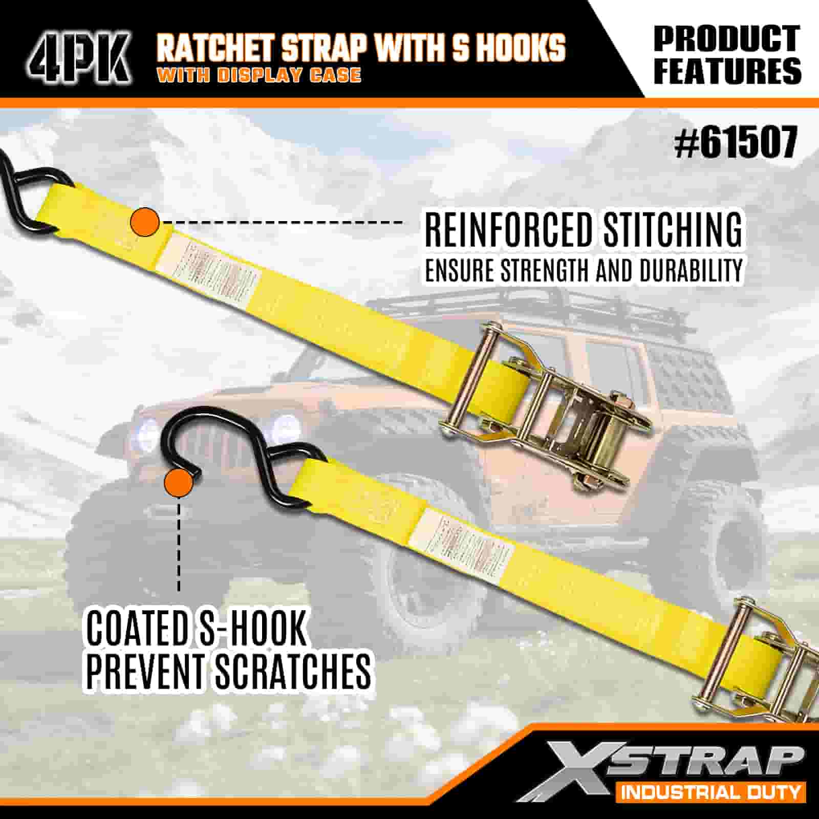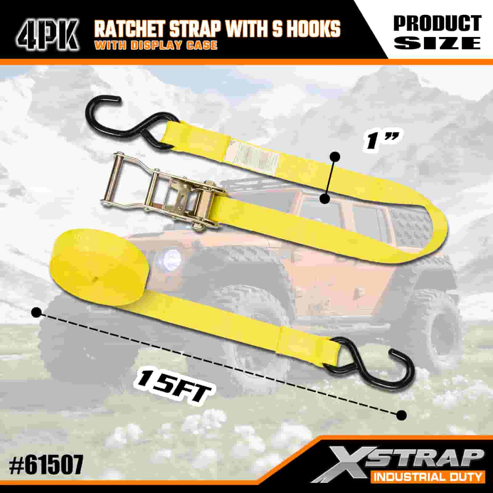 Xstrap 4 Pack Ratchet Strap na may S Hooks, 1" x 15' Polyester Tie Down Strap Pull Ratchet Strap, 400lbs Kapasidad Cargo Lashing Securing Straps na may S Hooks para sa Seryosong Propesyonal na Secure Cargo Trailer, Flat Bed Trailer, Ski Boat, Maliit na Kotse.