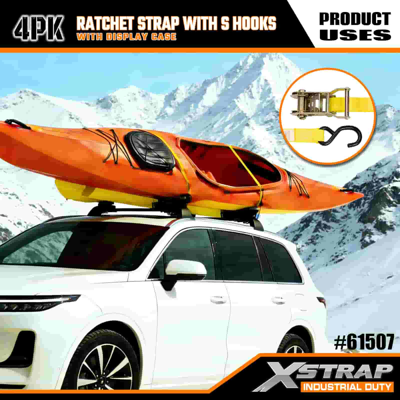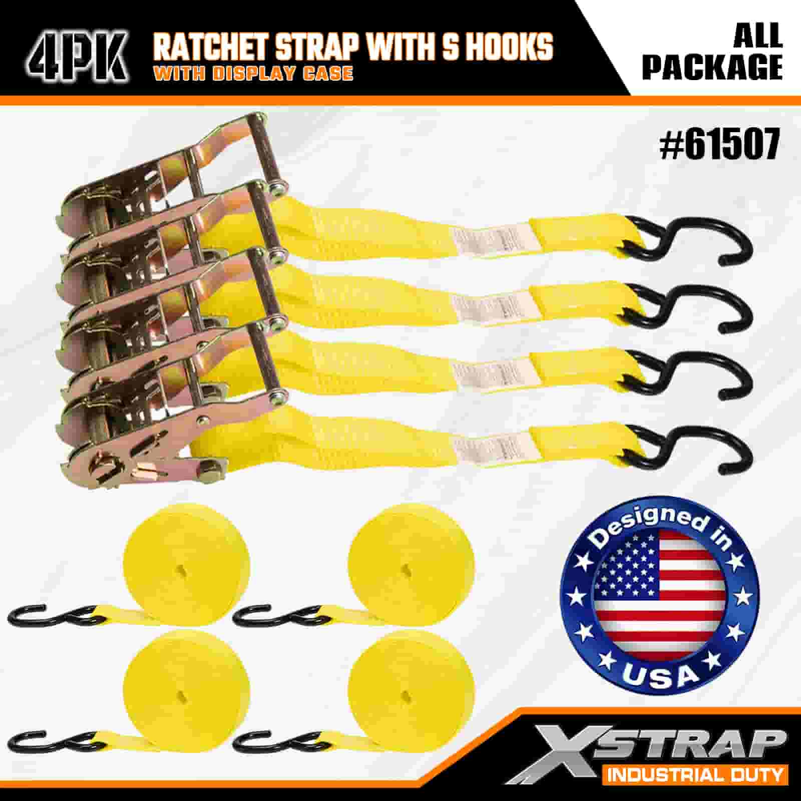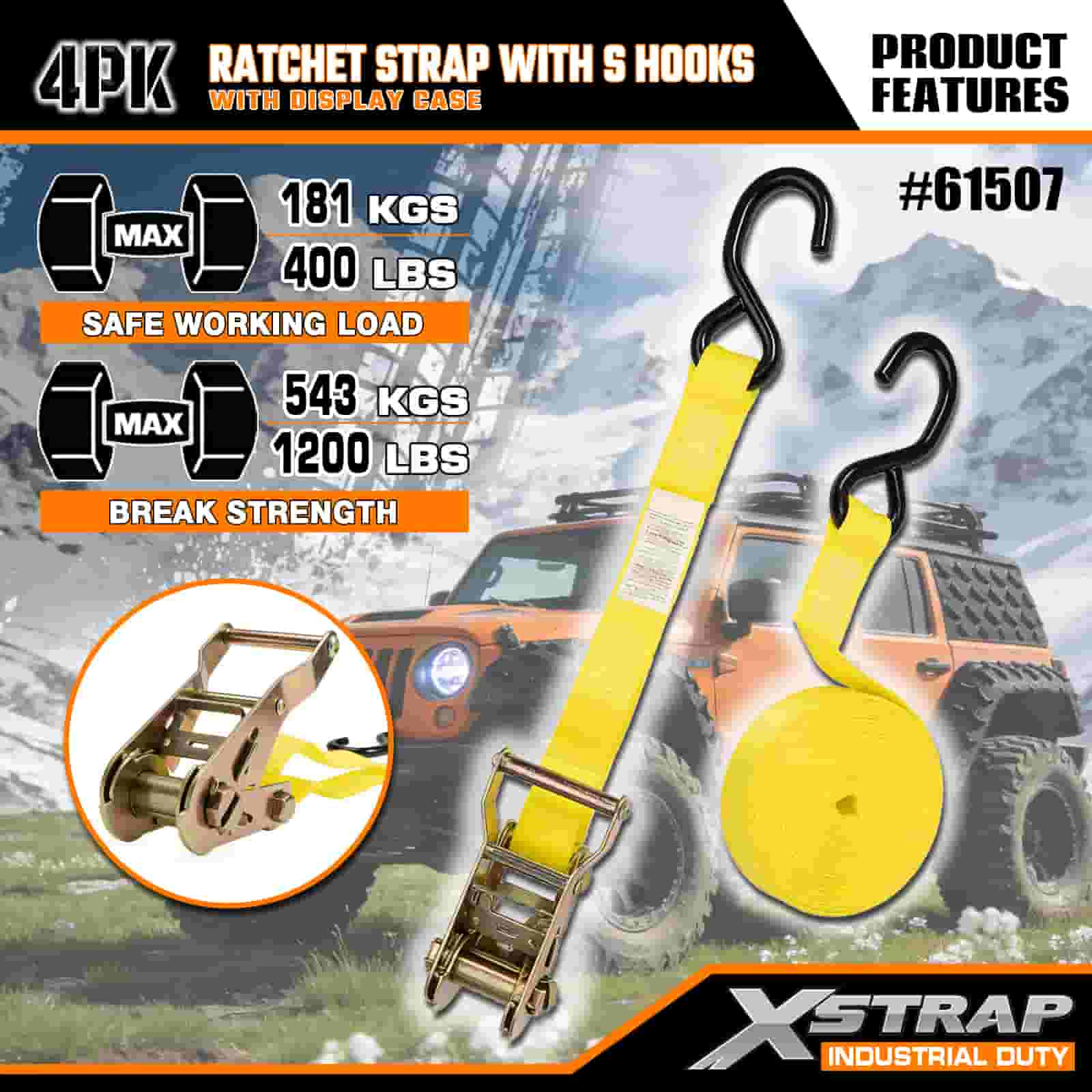 Xstrap 4 Pack Ratchet Strap na may S Hooks, 1" x 15' Polyester Tie Down Strap Pull Ratchet Strap, 400lbs Kapasidad Cargo Lashing Securing Straps na may S Hooks para sa Seryosong Propesyonal na Secure Cargo Trailer, Flat Bed Trailer, Ski Boat, Maliit na Kotse.