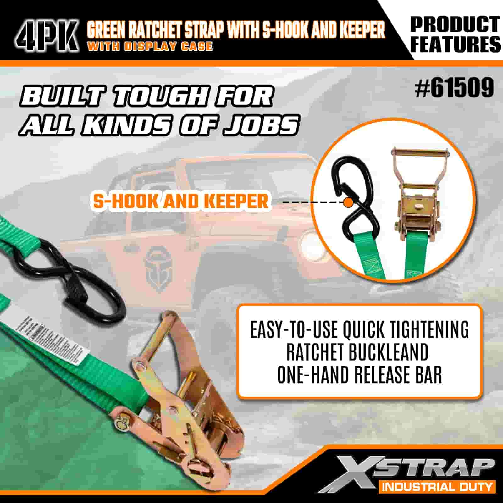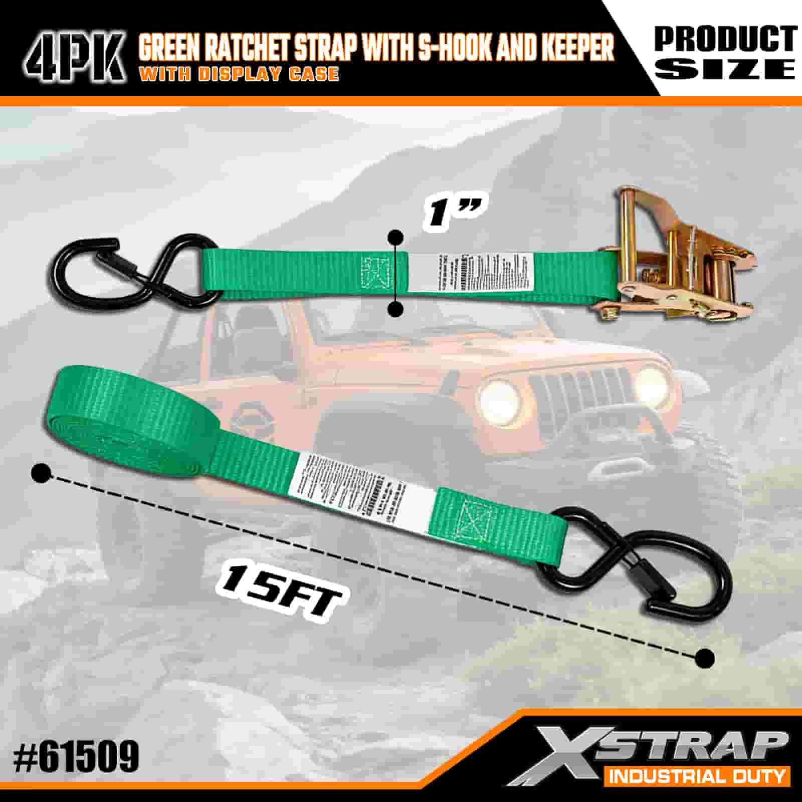 1” x 15’ 4PK Ratchet Strap na may Safety S Hooks