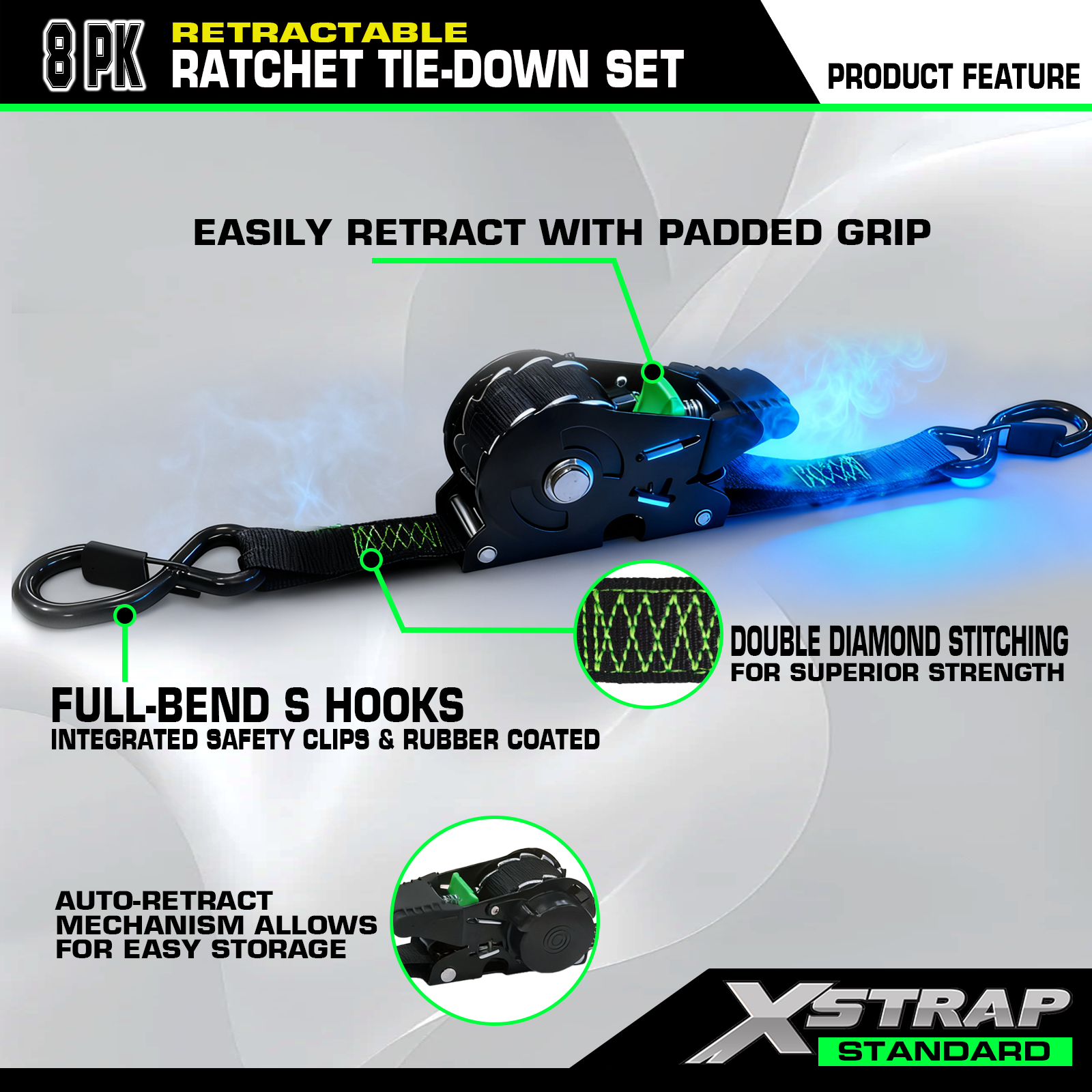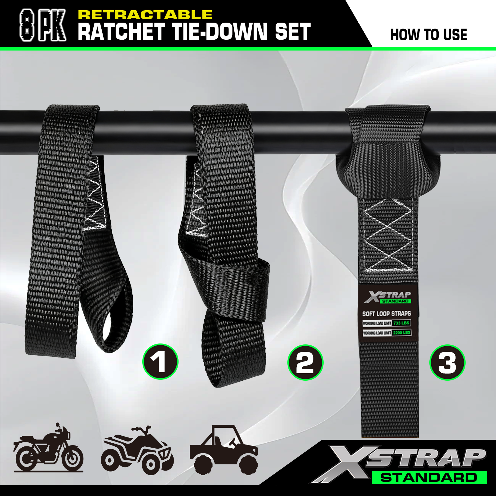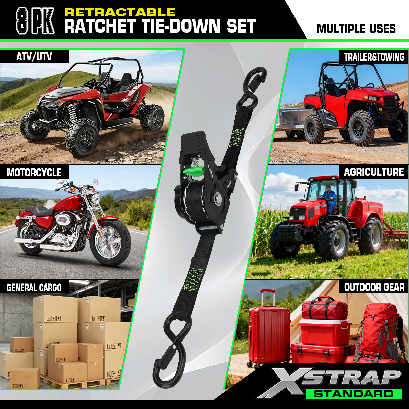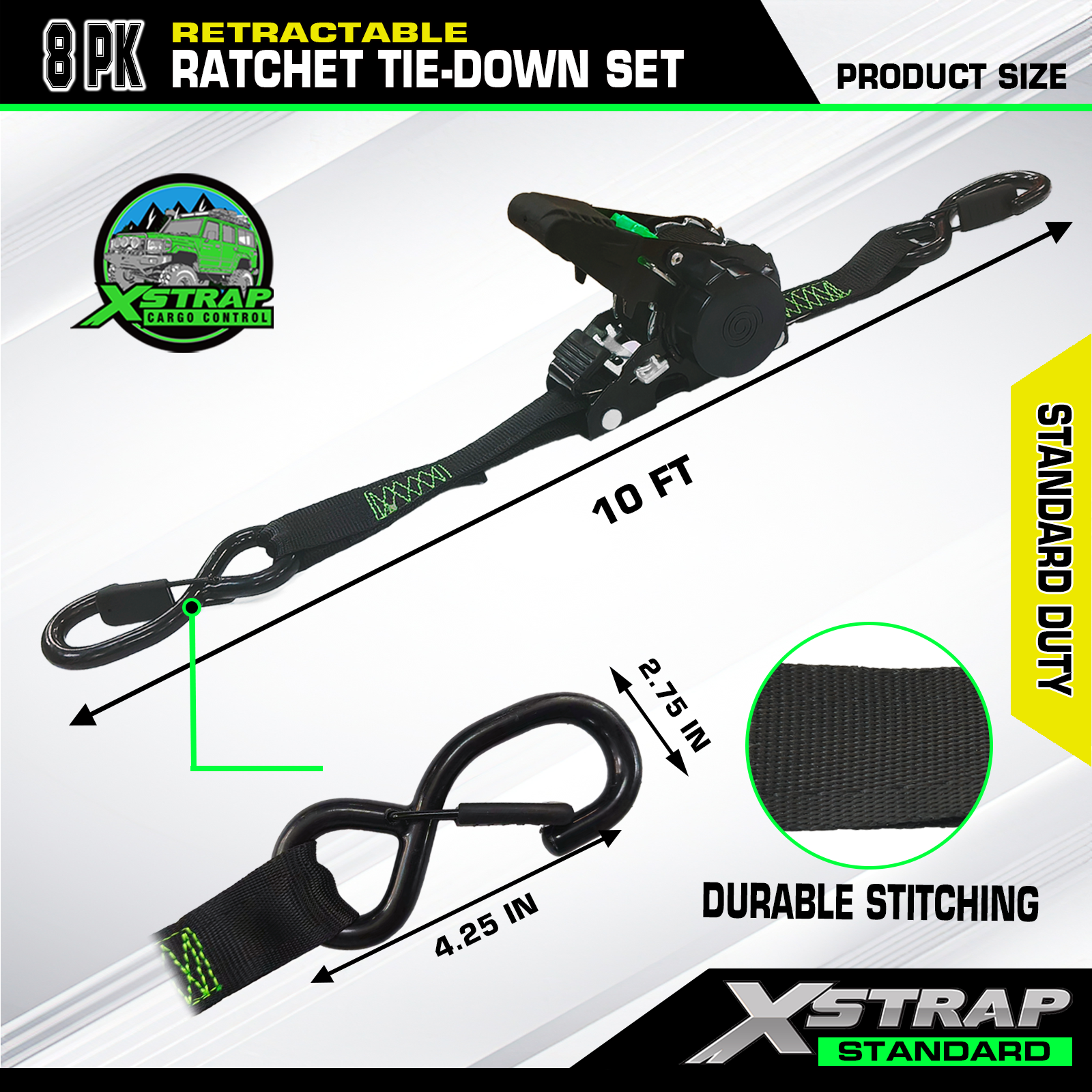 Nagtatampok ang maaaring iurong na ratchet strap ng built-in na mekanismo ng awtomatikong pagbawi, na nagpapahintulot sa strap na mabawi nang maayos pabalik sa housing nito pagkatapos gamitin. Hindi lamang nito pinapanatili ang strap na malinis at protektado, ngunit makabuluhang binabawasan ang oras ng paghahanda at paglilinis. Ang 10ft polyester webbing ay nagbibigay ng malakas na tensyon at maaasahang lakas para sa mga motorsiklo, ATV, bisikleta, UTV. Ang ergonomic na ratchet handle ay kumportableng paandarin, na nag-aalok ng mas mahusay na pagkakahawak at mas kaunting pagsisikap kapag hinihigpitan ang pagkarga.