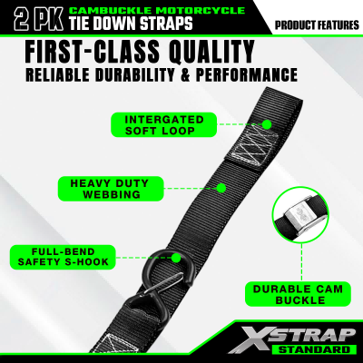 - Heavy duty standard na disenyo: Ang Xstrap motorcycle tie down strap ay ginawa gamit ang mataas na lakas na webbing at may break strength na 2200lbs, na ginagawa itong pinakamahusay na pagpipilian para sa pag-secure ng mga motorsiklo, ATV, UTV, at dirt bike. Kapag ginamit mo ang aming cam buckle strap para sa isang mabilis na biyahe, tinitiyak ng Xstrap tie down strap ang walang kaparis na tibay at seguridad.