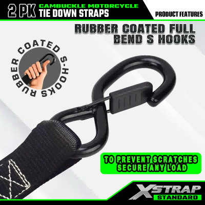 Ito ang Xstrap 2pk Cam buckle strap na may mga safety s hook. Ang ligtas na work load ay 733lb, ang breaking strength ay 2200lb. Karaniwang ginagamit ang mga ito para sa pag-secure ng mga motorsiklo, kayak at iba pa.