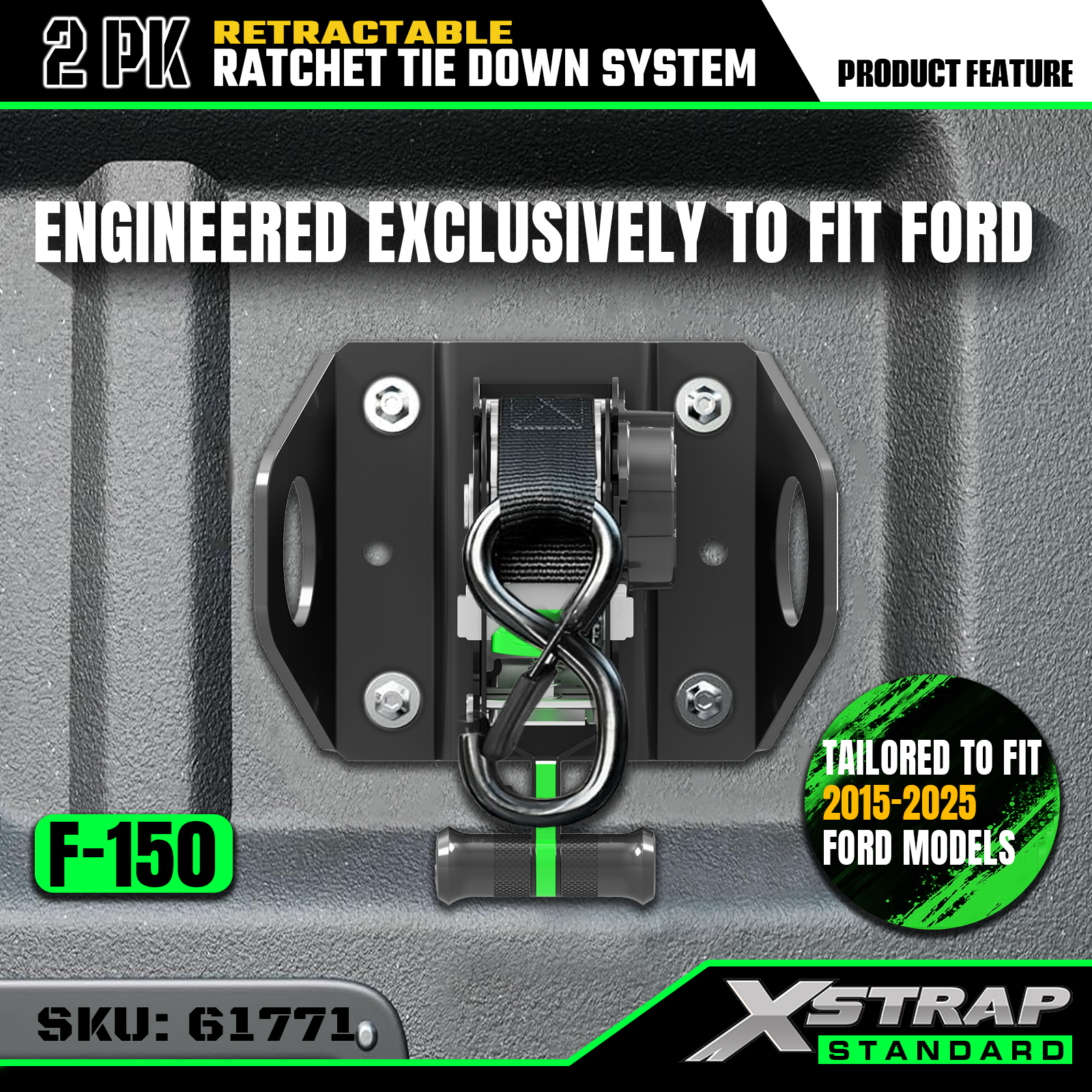 Ito ang Xstrap Retractable Tie Down Straps Fits para sa F150 2015-2026 Ford na may Safety S Hooks. Ang ligtas na work load ay 500lbs, at breaking strength ay 1500lbs.