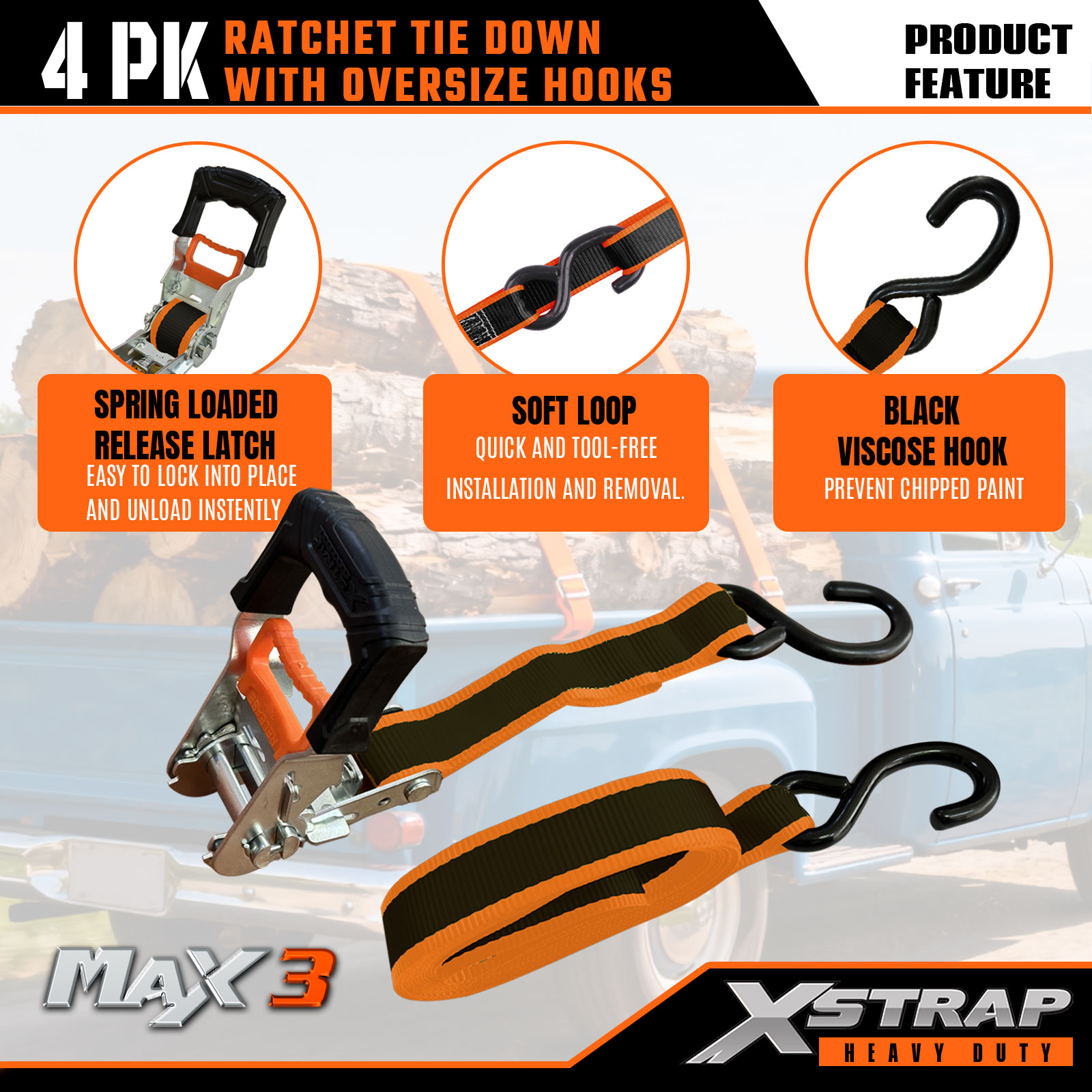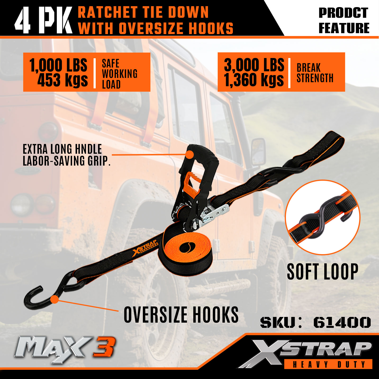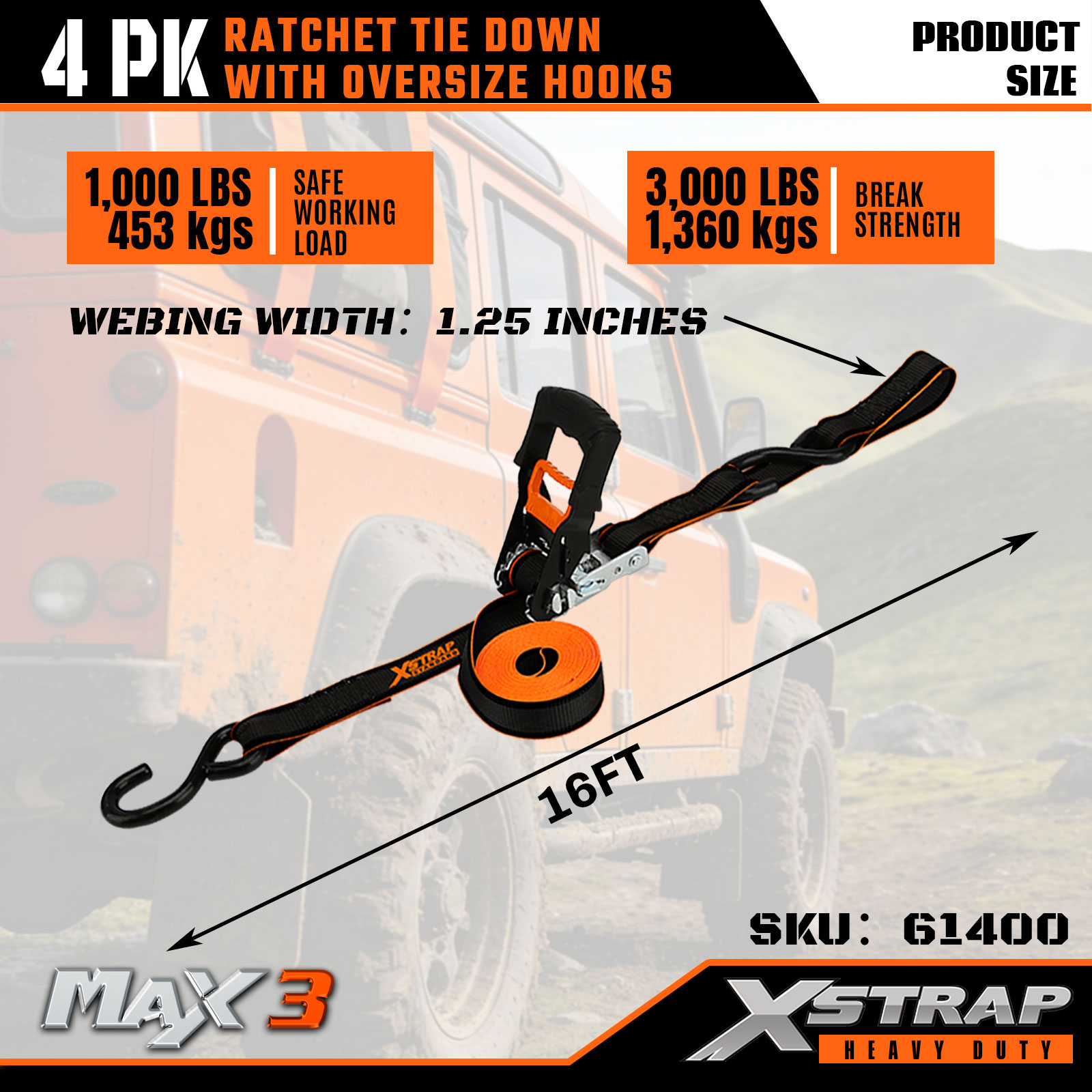 Xstrap 4 Pack Ratchet Tie Down, 1-1/4” x 16’ Polyester Tie Down Strap Pull Ratchet Strap, 1000lbs Kapasidad Cargo Lashing Securing Straps na may Double J Hooks para sa Pickup Truck, SUV, Car Top Racks Motorsiklo, Light Fishing Boat, Lawn Tractor, Snowmobile.
