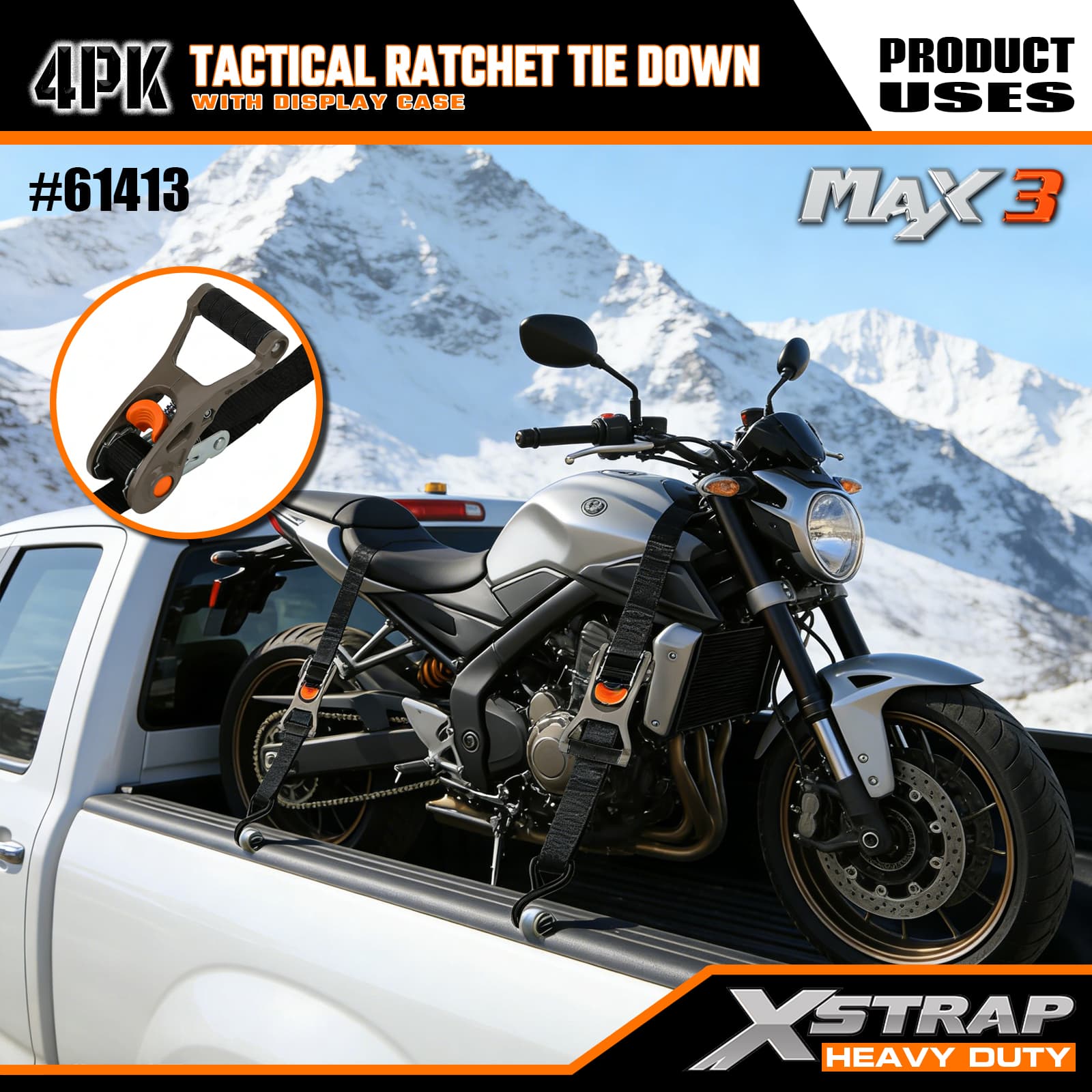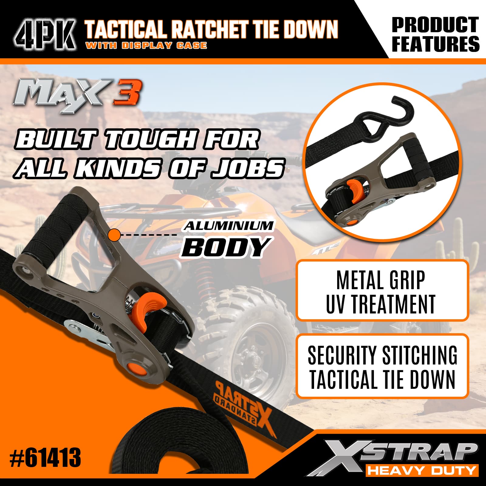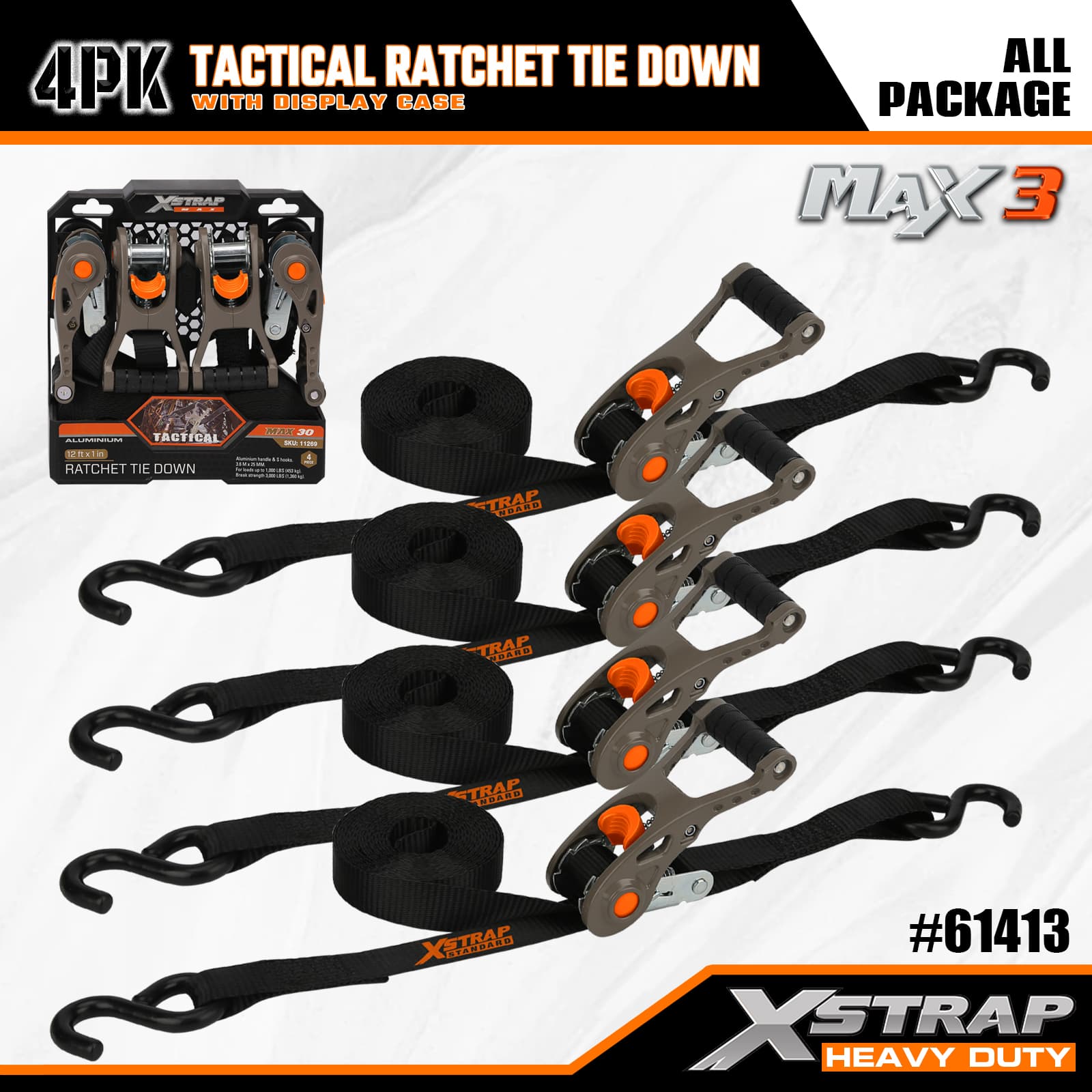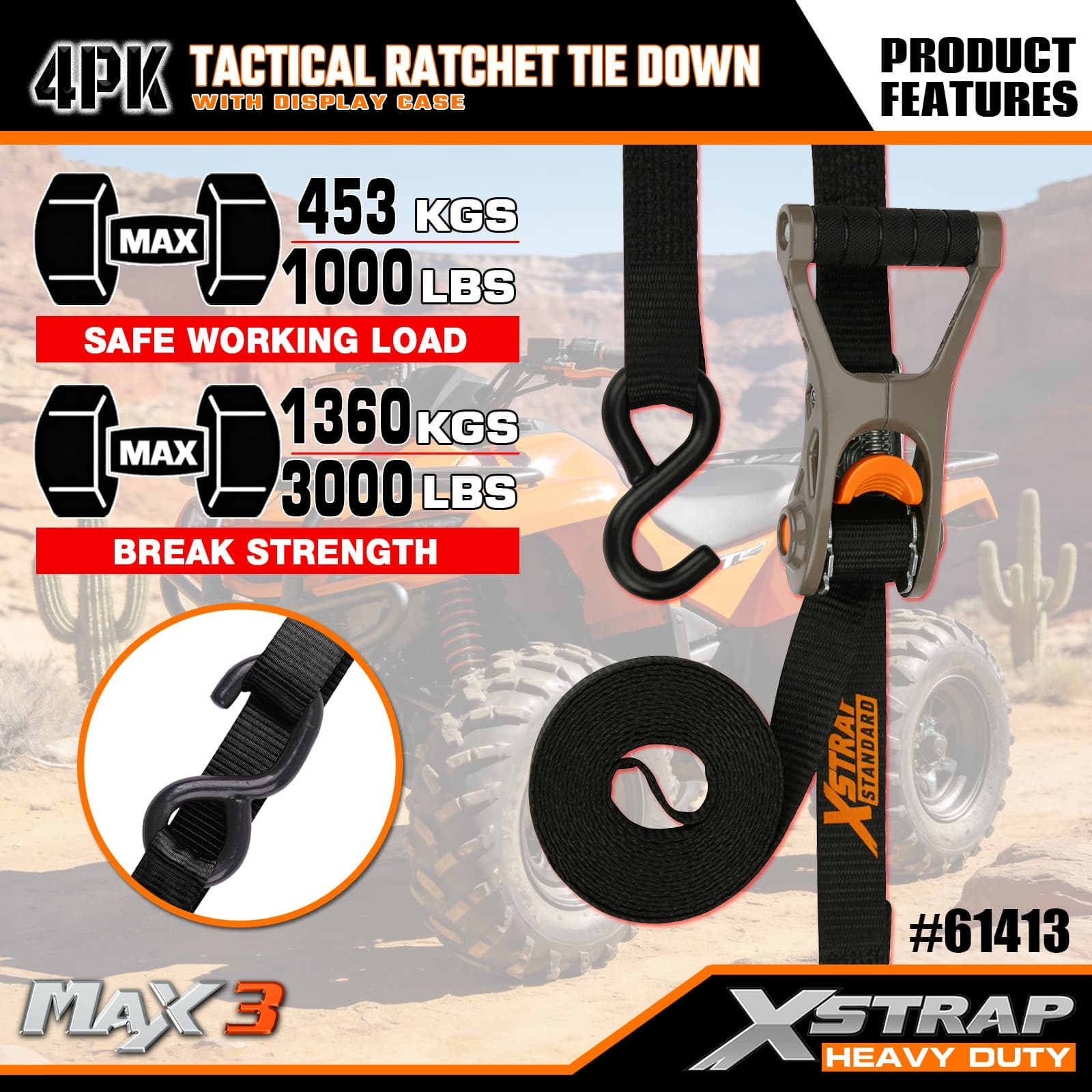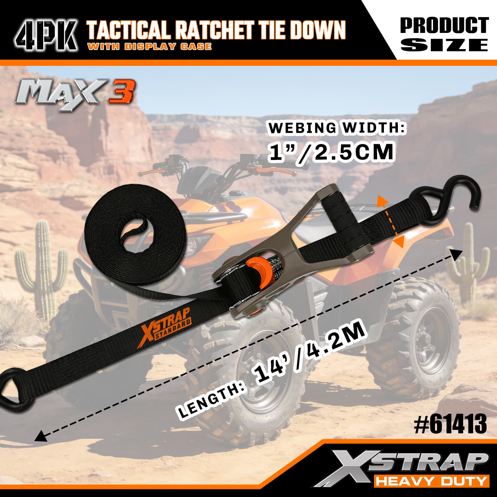 Xstrap 4 Pack Tactical Ratchet Tie Down na may Soft Loop, 1” x 14’ Polyester Tie Down Strap Pull Ratchet Strap, 1000lbs Kapasidad Cargo Lashing Securing Straps na may S Hooks para sa Truck, SUV, Car Top Racks Motorsiklo.