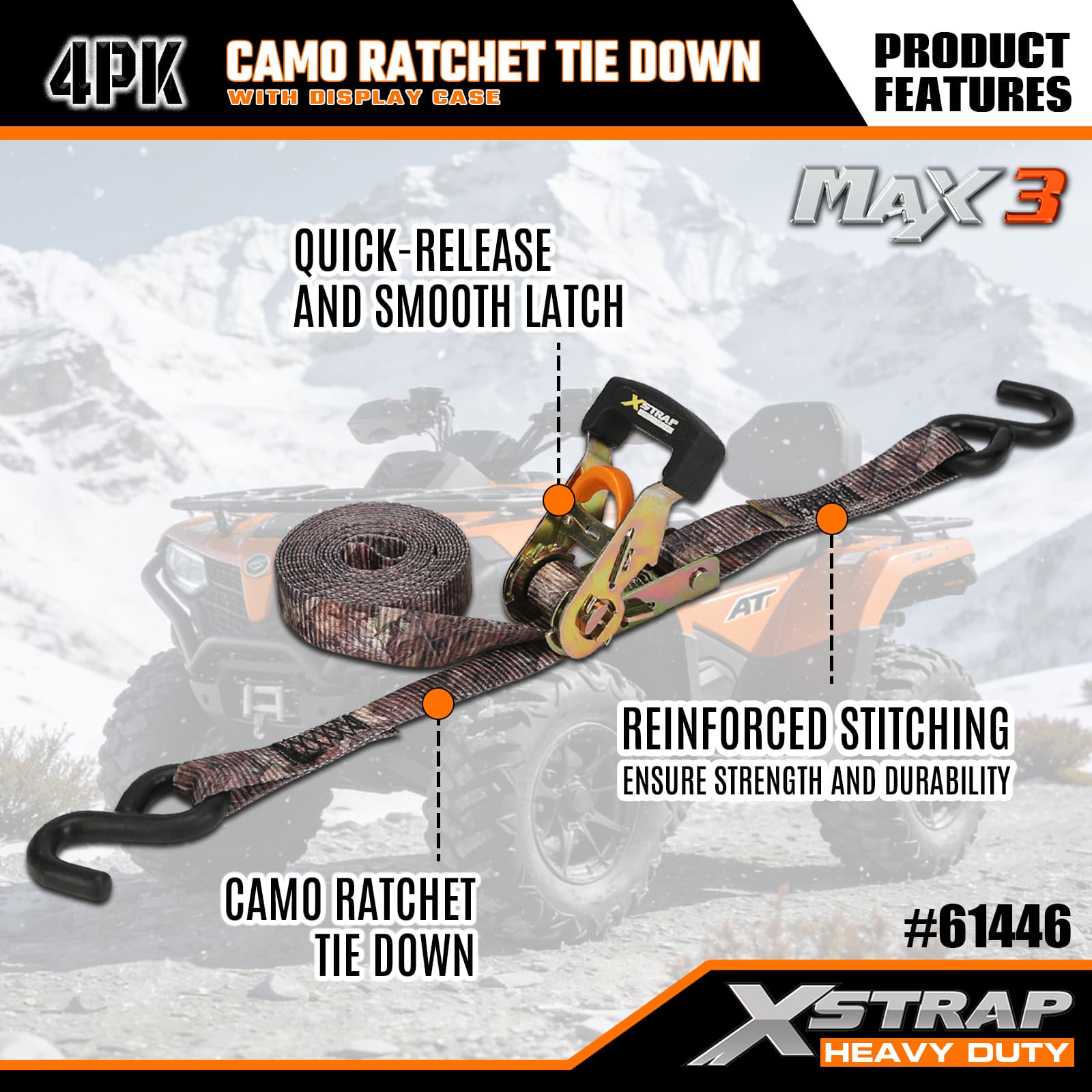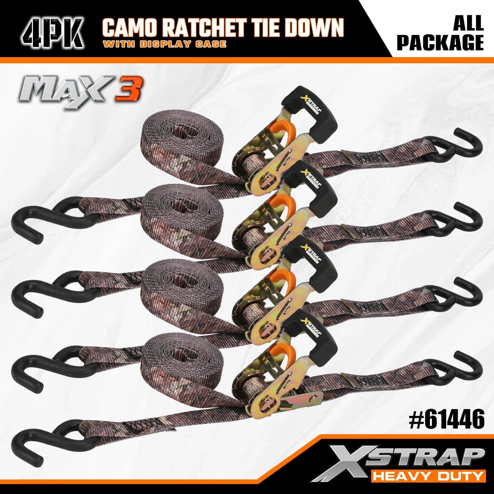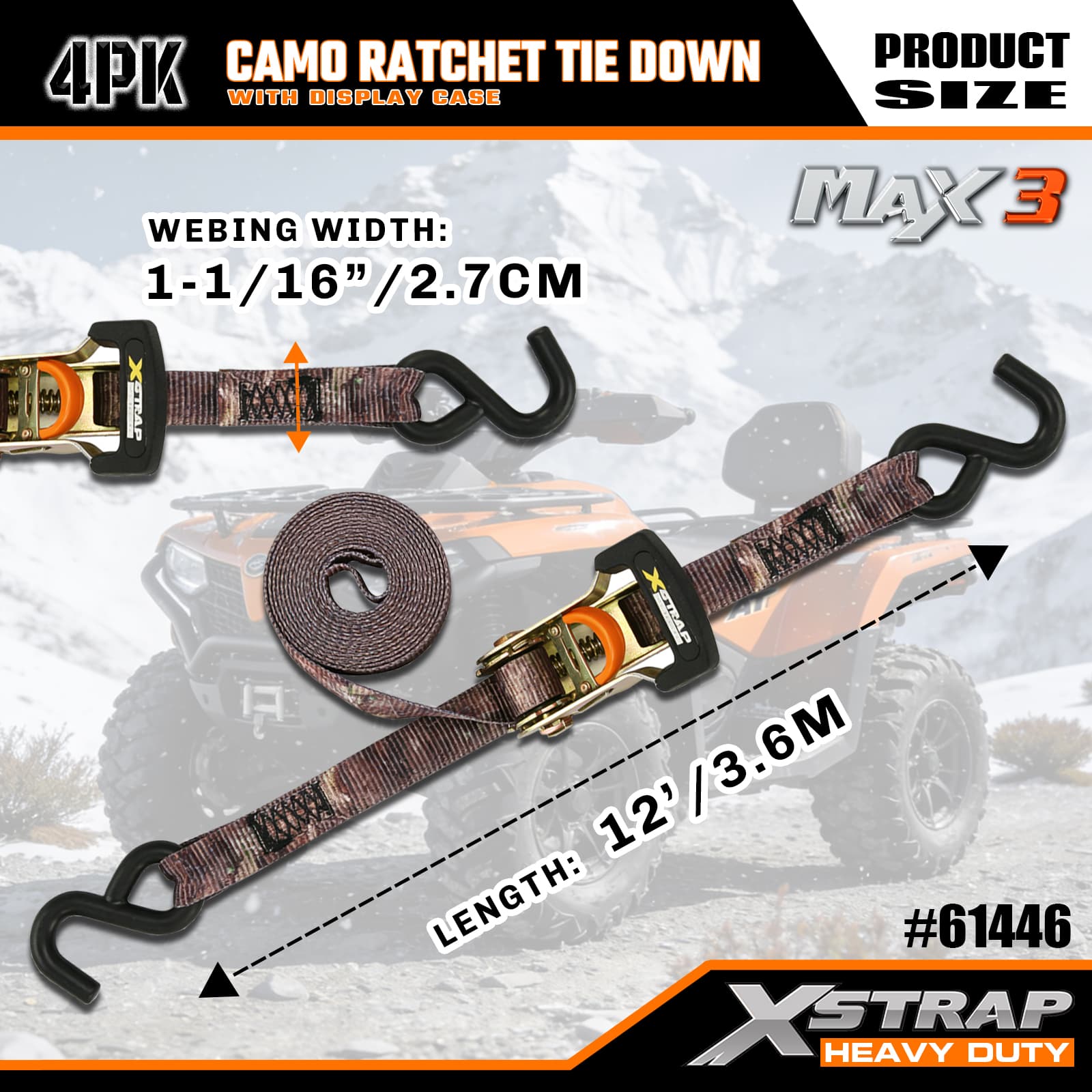 Xstrap 4 Pack Camo Ratchet Tie Down, 1-1/16 ” x 12’ Polyester Tie Down Strap Pull Ratchet Strap, 1000lbs Kapasidad Cargo Lashing Securing Straps na may S Hooks para sa Pickup Truck, SUV, Car Top Racks Motorsiklo, Light Fishing Boat, Lawn Tractor, Snowmobile.