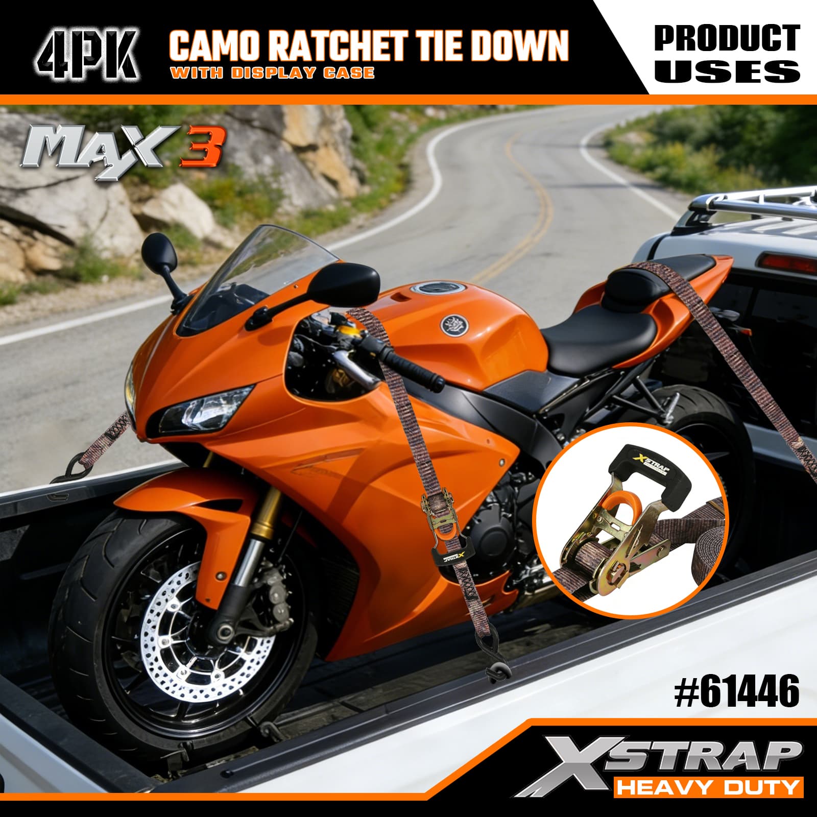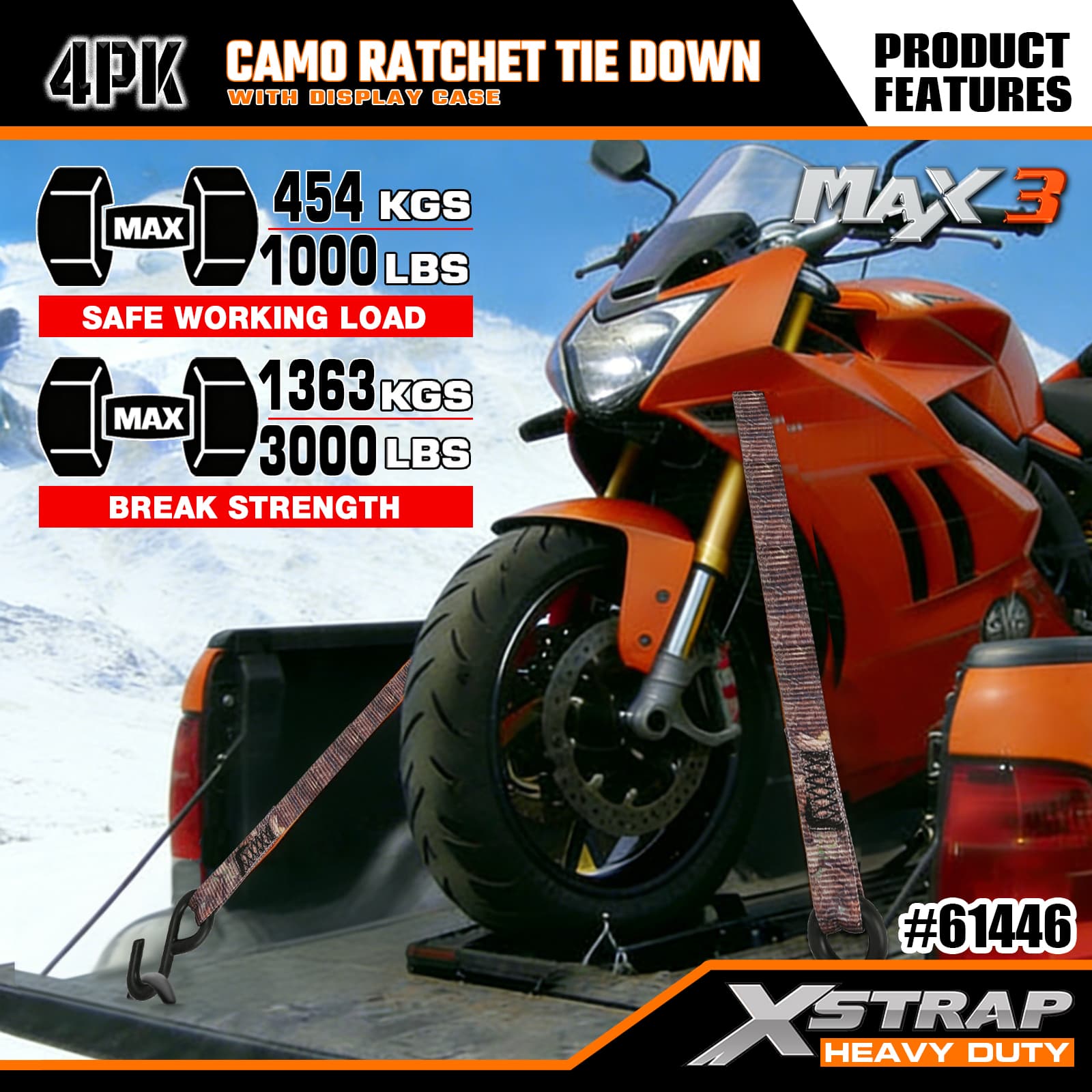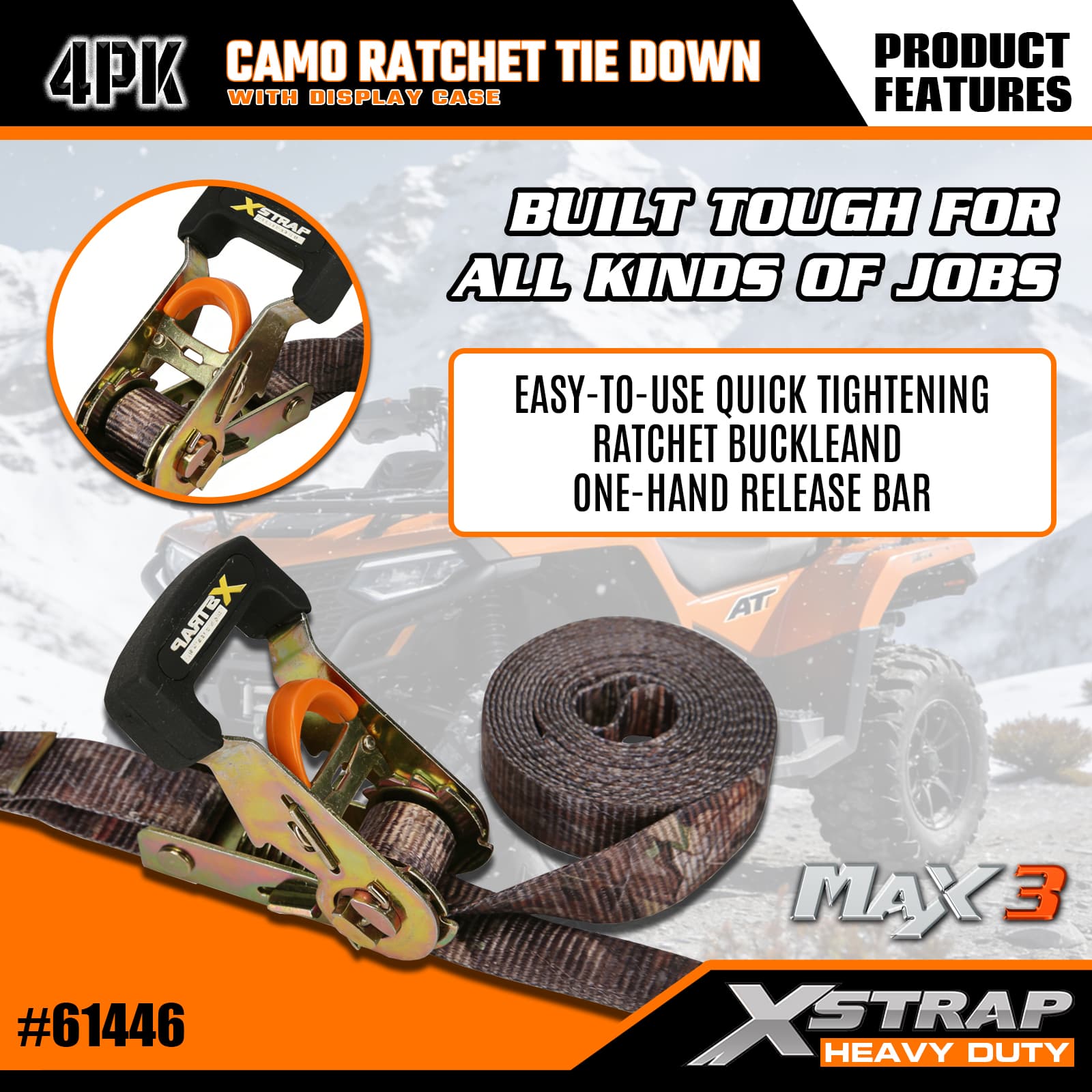 Xstrap 4 Pack Camo Ratchet Tie Down, 1-1/16 ” x 12’ Polyester Tie Down Strap Pull Ratchet Strap, 1000lbs Kapasidad Cargo Lashing Securing Straps na may S Hooks para sa Pickup Truck, SUV, Car Top Racks Motorsiklo, Light Fishing Boat, Lawn Tractor, Snowmobile.