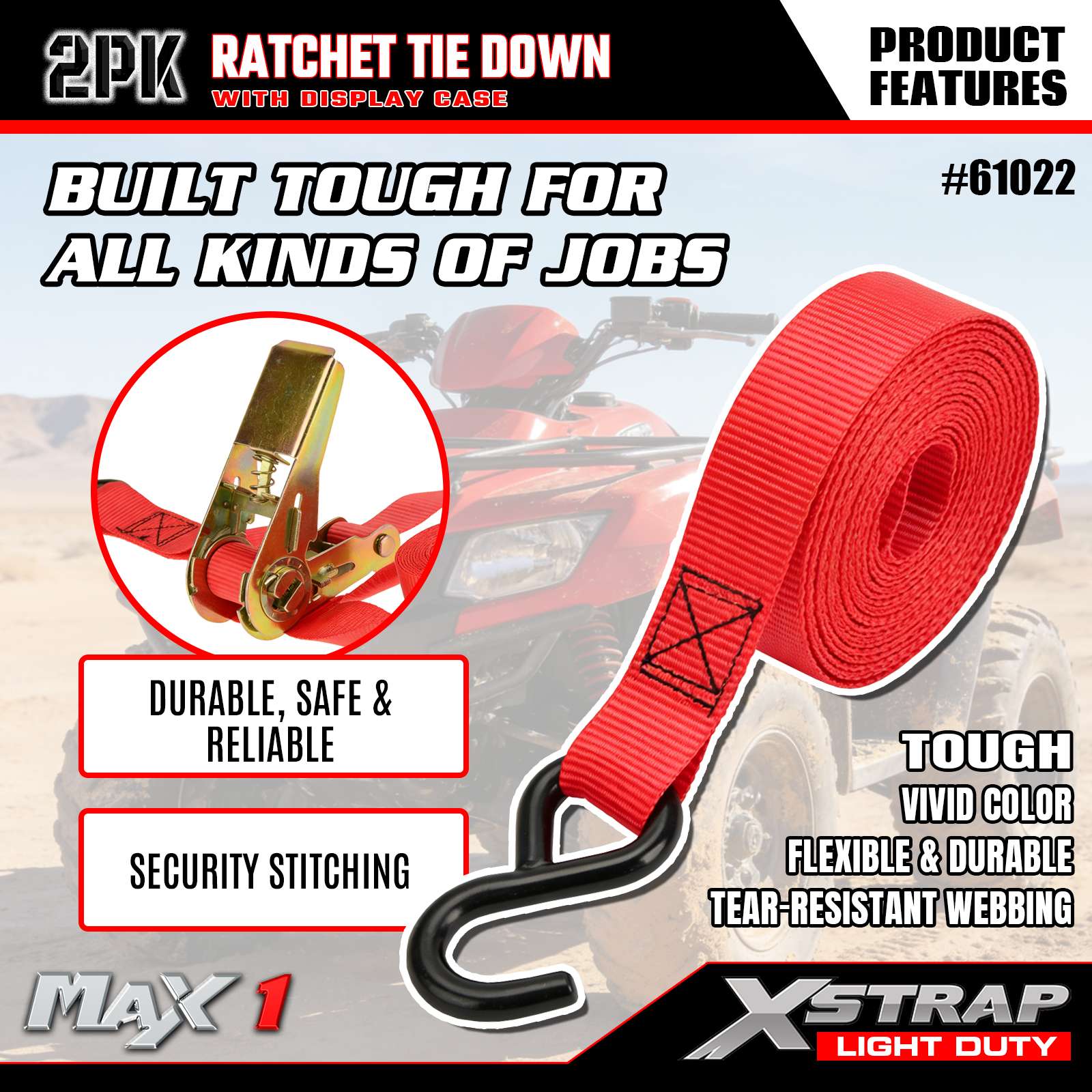 Ang Xstrap 2PK Ratchet Tie Down Straps ay 1 in x 10 ft, ang ligtas na work load ay 300lbs at ang breaking strength ay 900lbs.