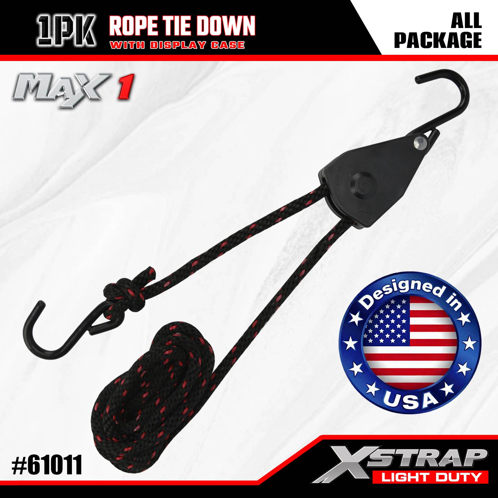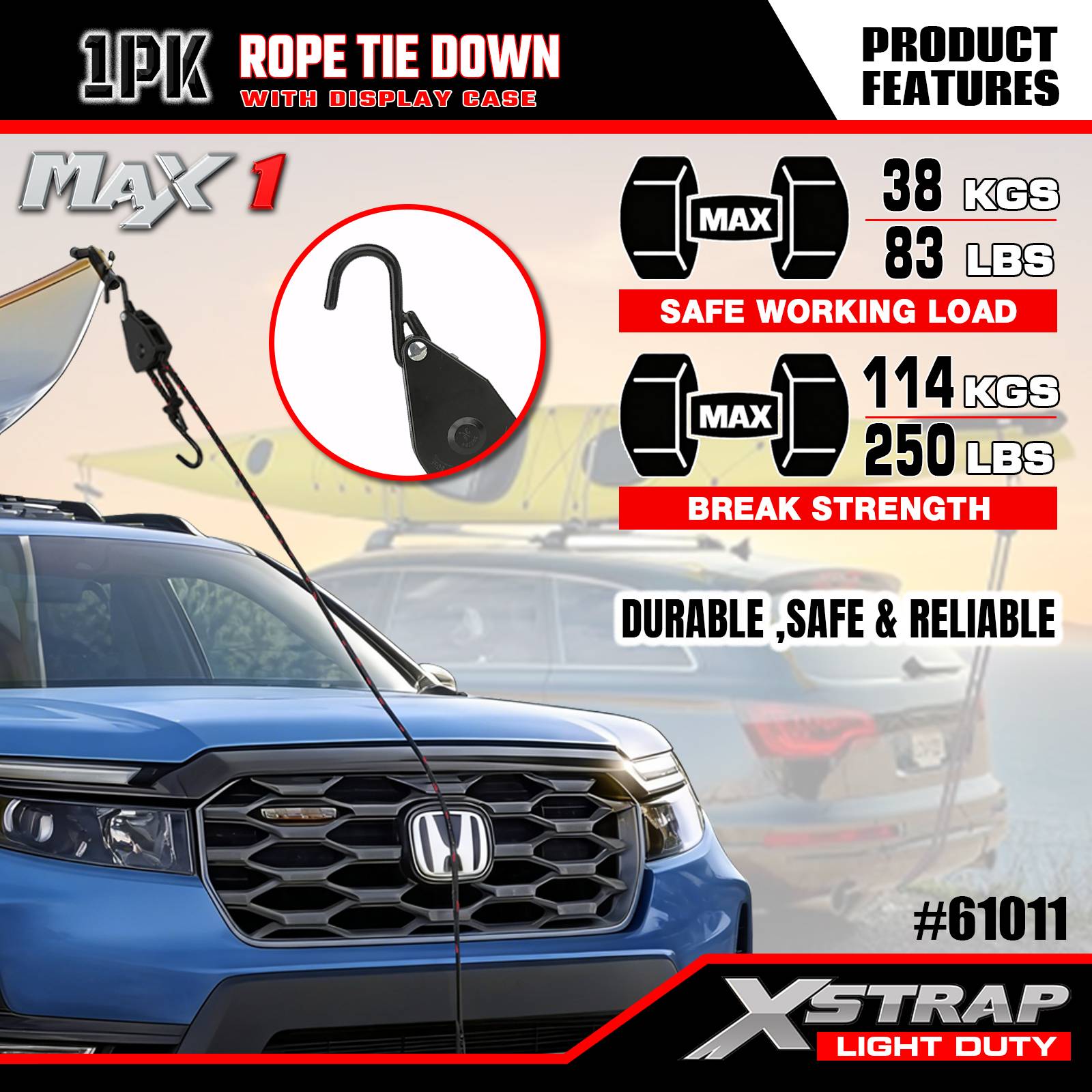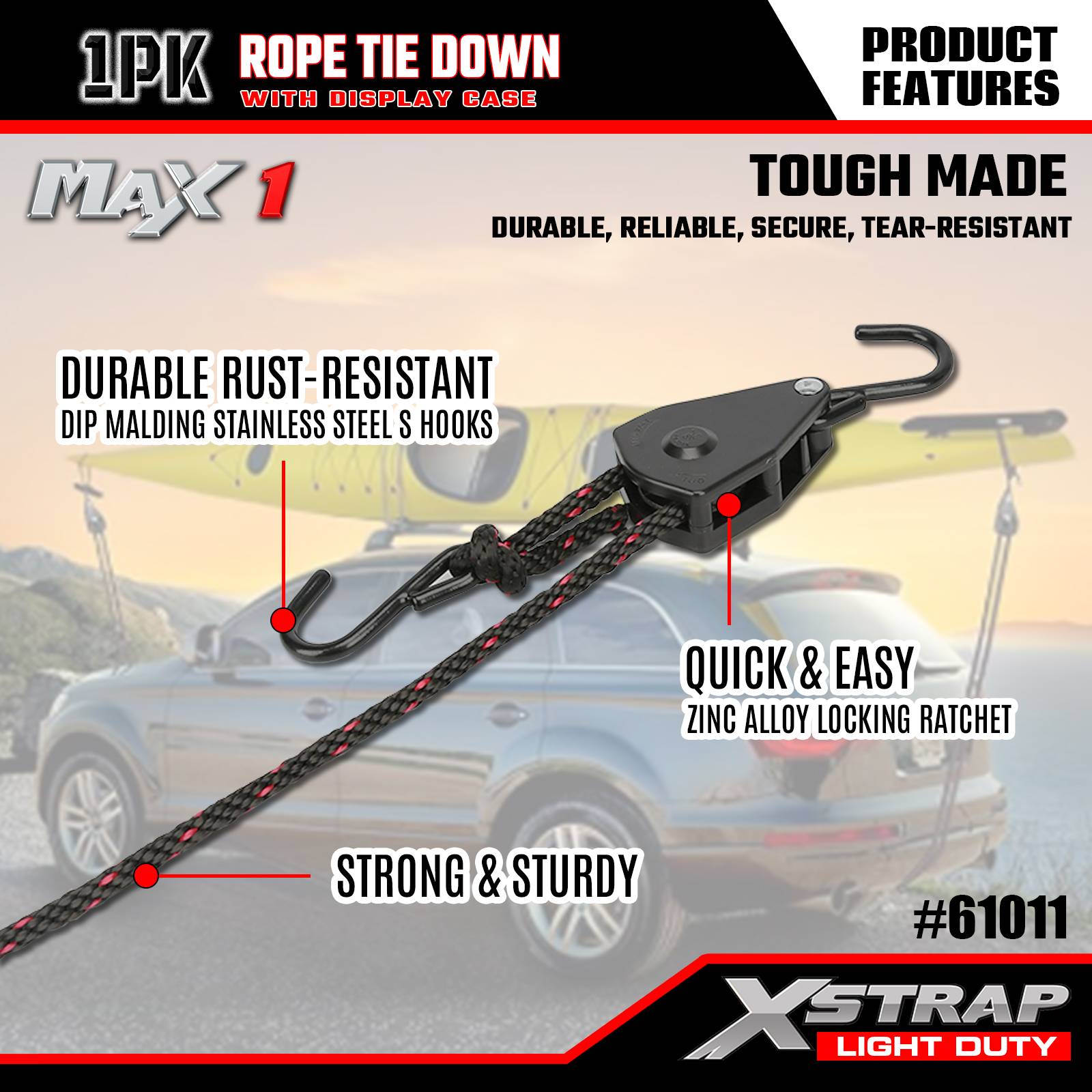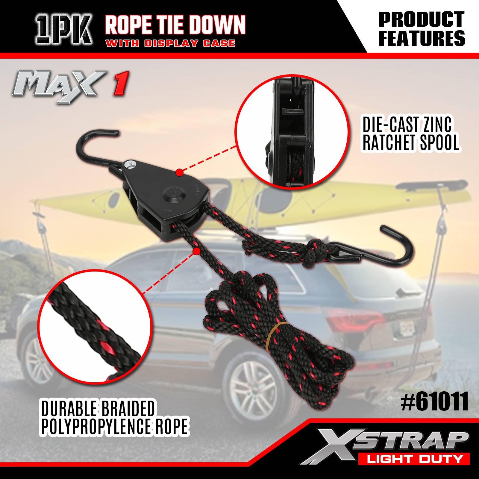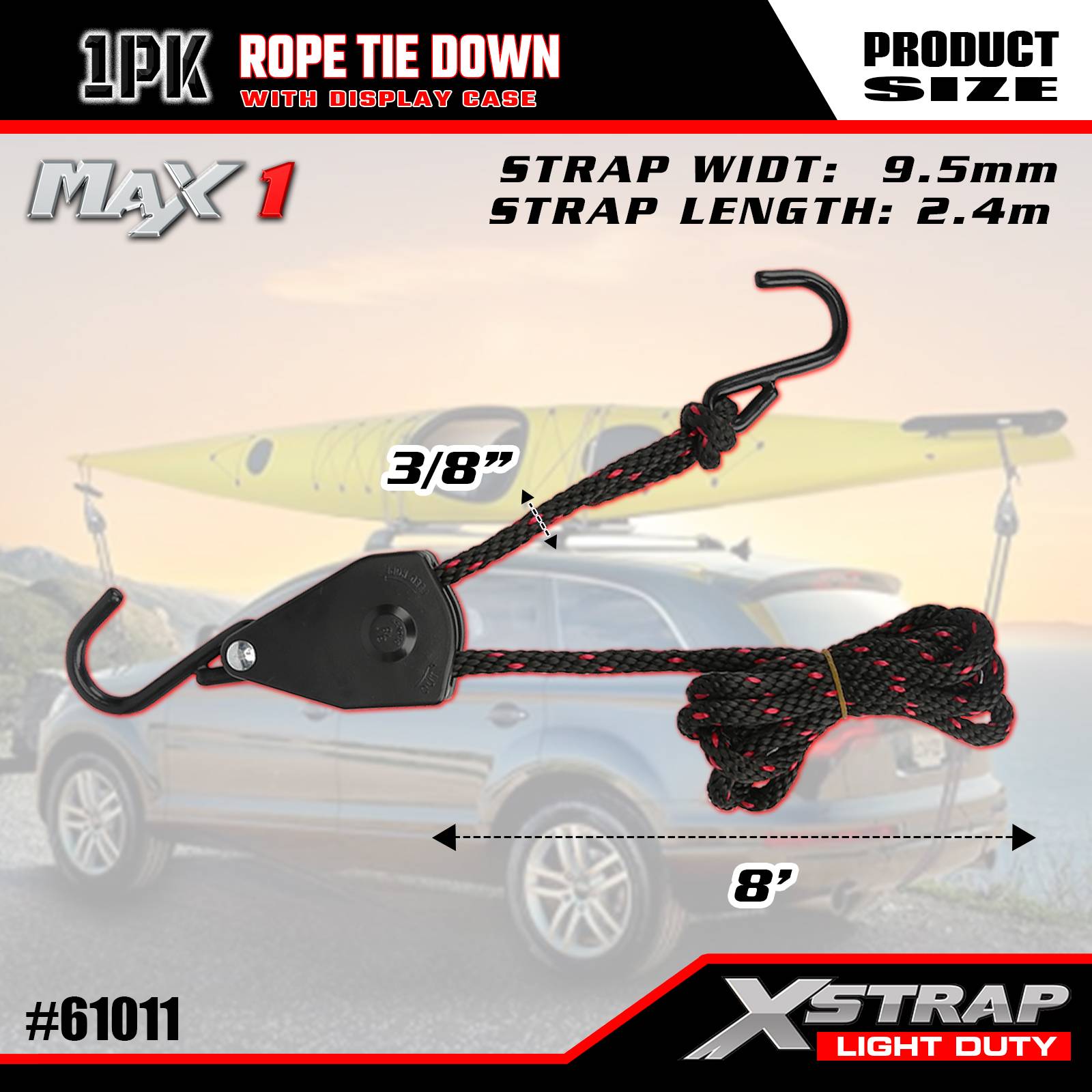 Xstrap 1 Pack Rope Tie-Down Straps, 3/8” x 8’ - 83 Lbs Load Cap- 250 Lbs Break Strength-Cargo Straps para sa Pag-secure ng Magaan na Load (Mga Kayaks, Gear, Maliit na Kagamitan) sa Mga Sasakyan/Rack