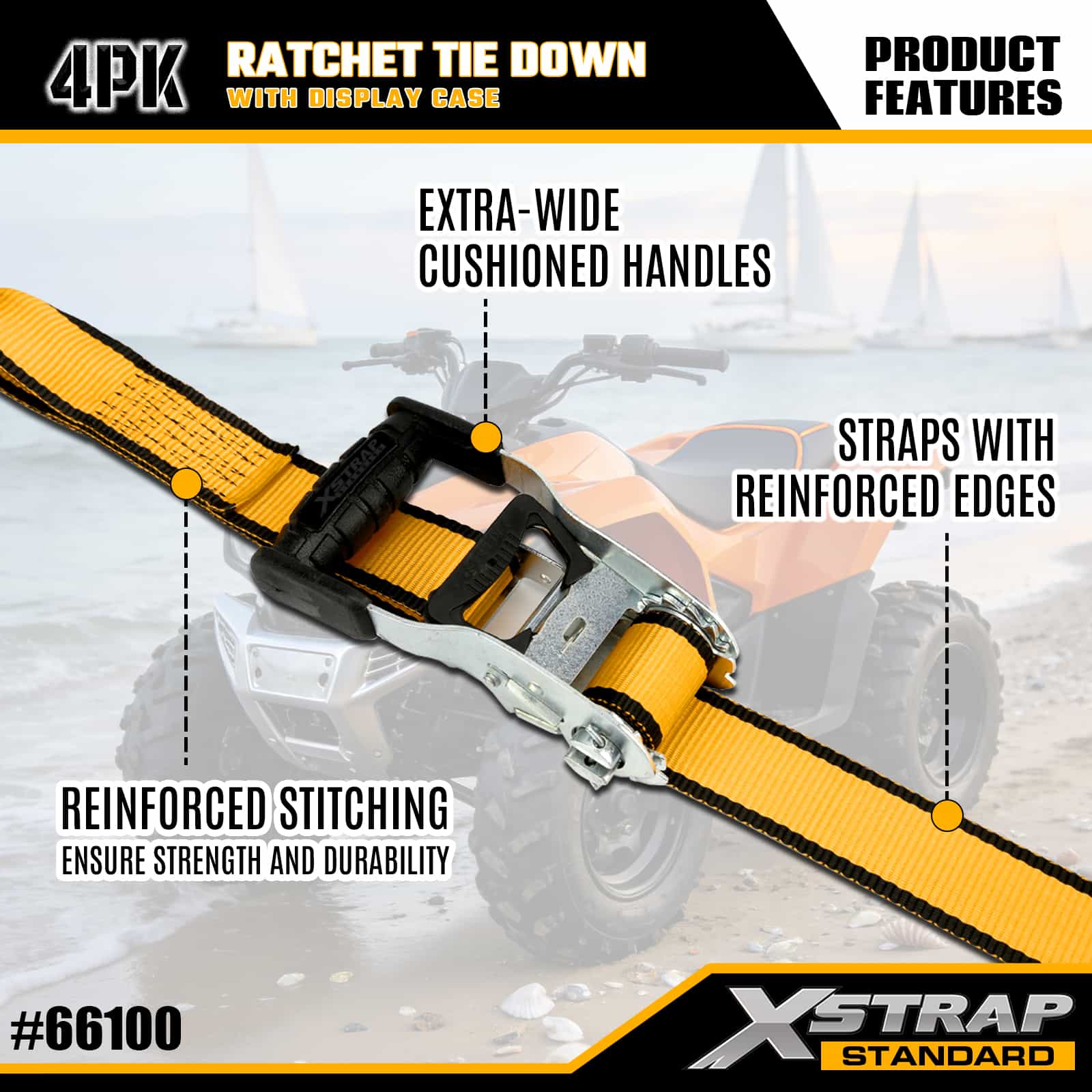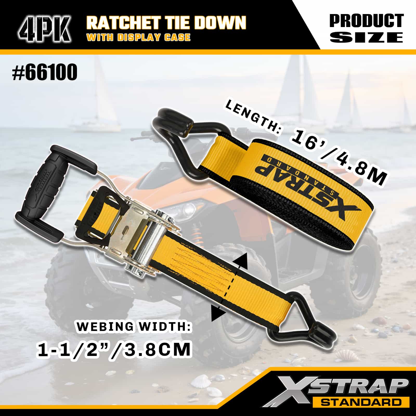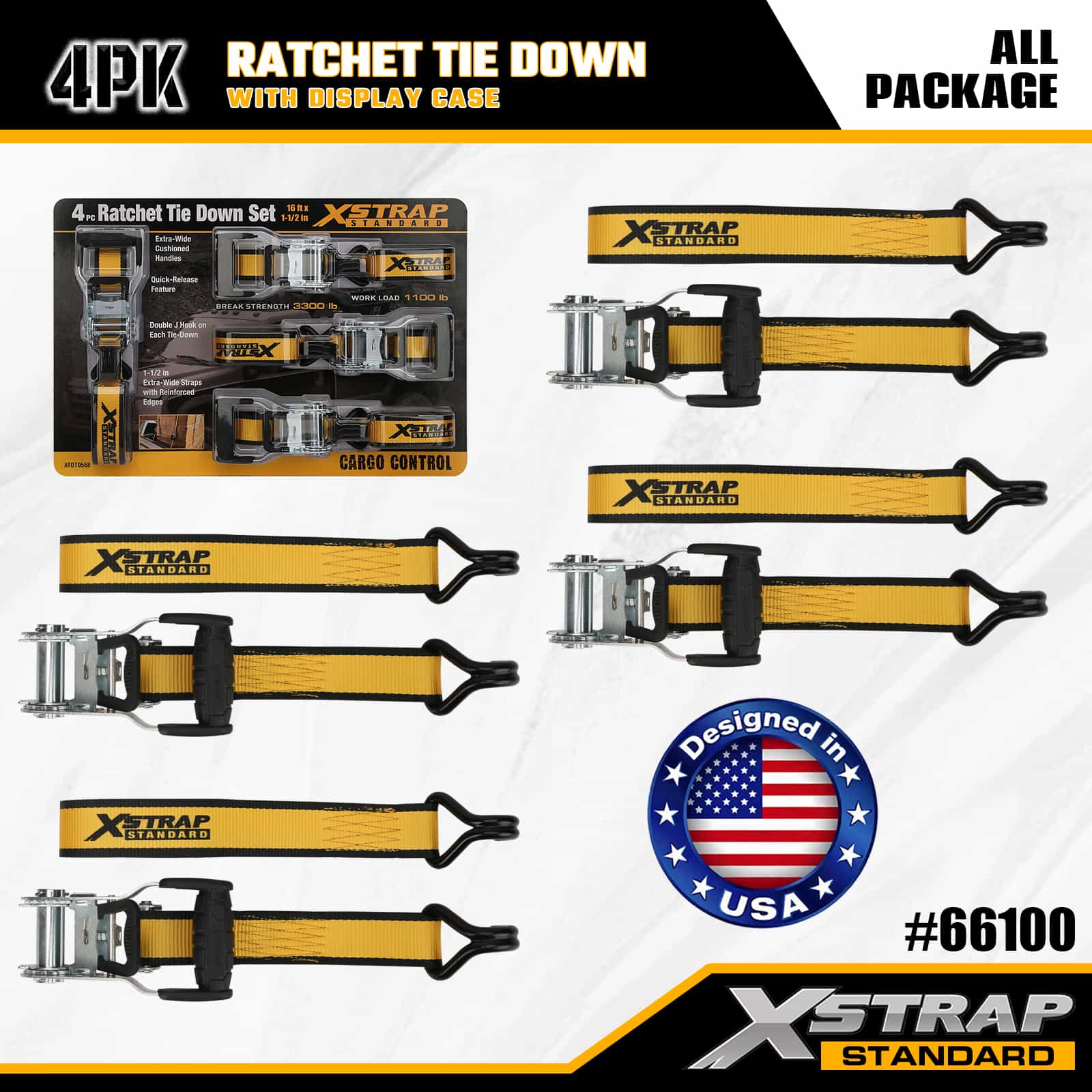 Xstrap 4 Pack Ratchet Tie Down na may Double J Hooks, 1-1/2" x 16' Polyester Tie Down Strap Pull Ratchet Strap, 1100lbs Kapasidad Cargo Lashing Securing Straps na may Double J Hooks para sa Pickup Truck, SUV, Car Top Racks Motorsiklo, Light Fishing Boat, Jet Ski, Snowmobile.