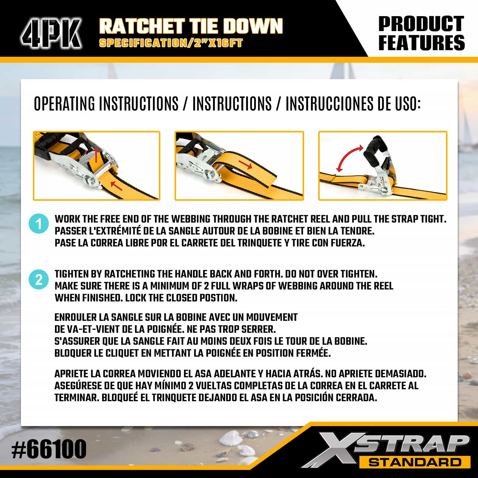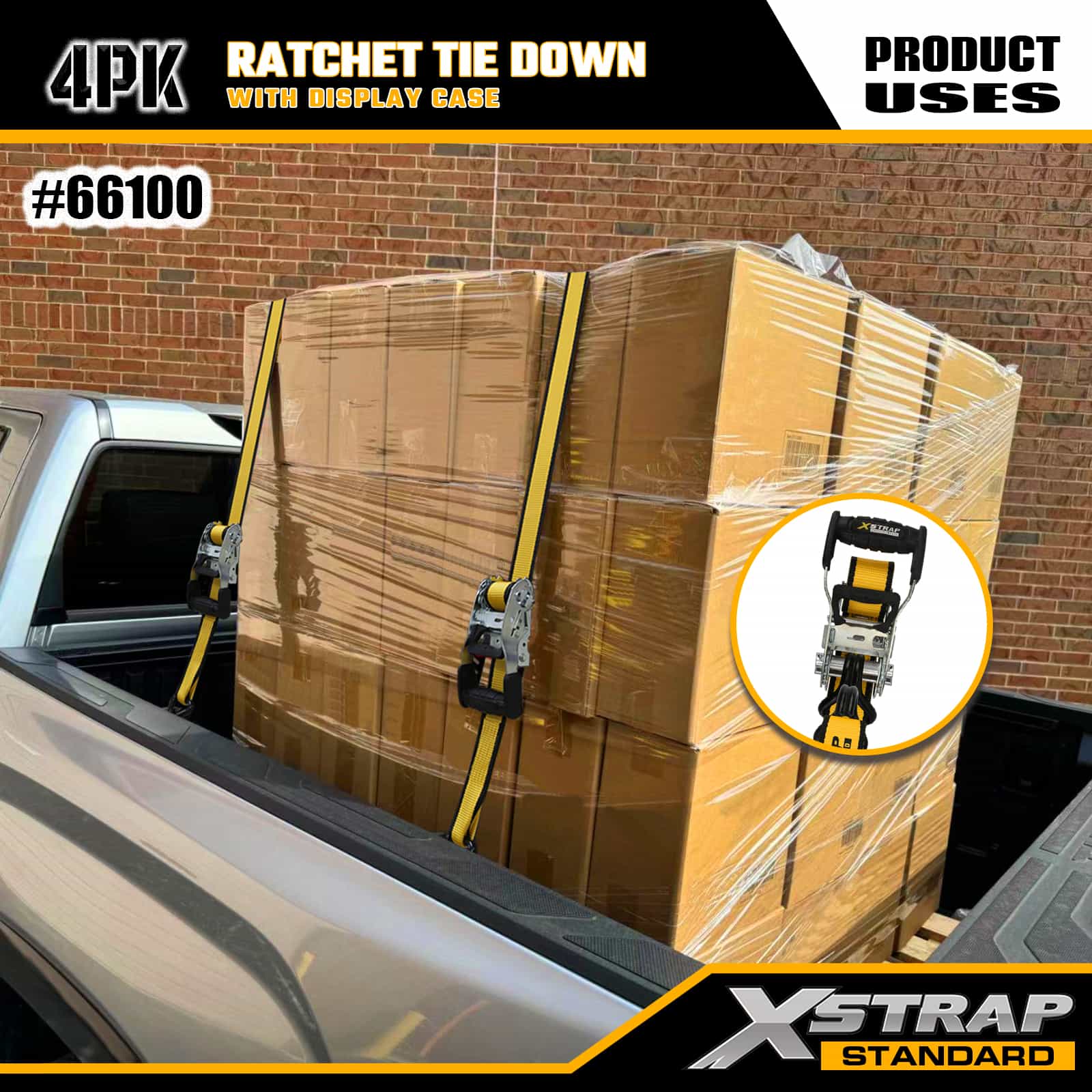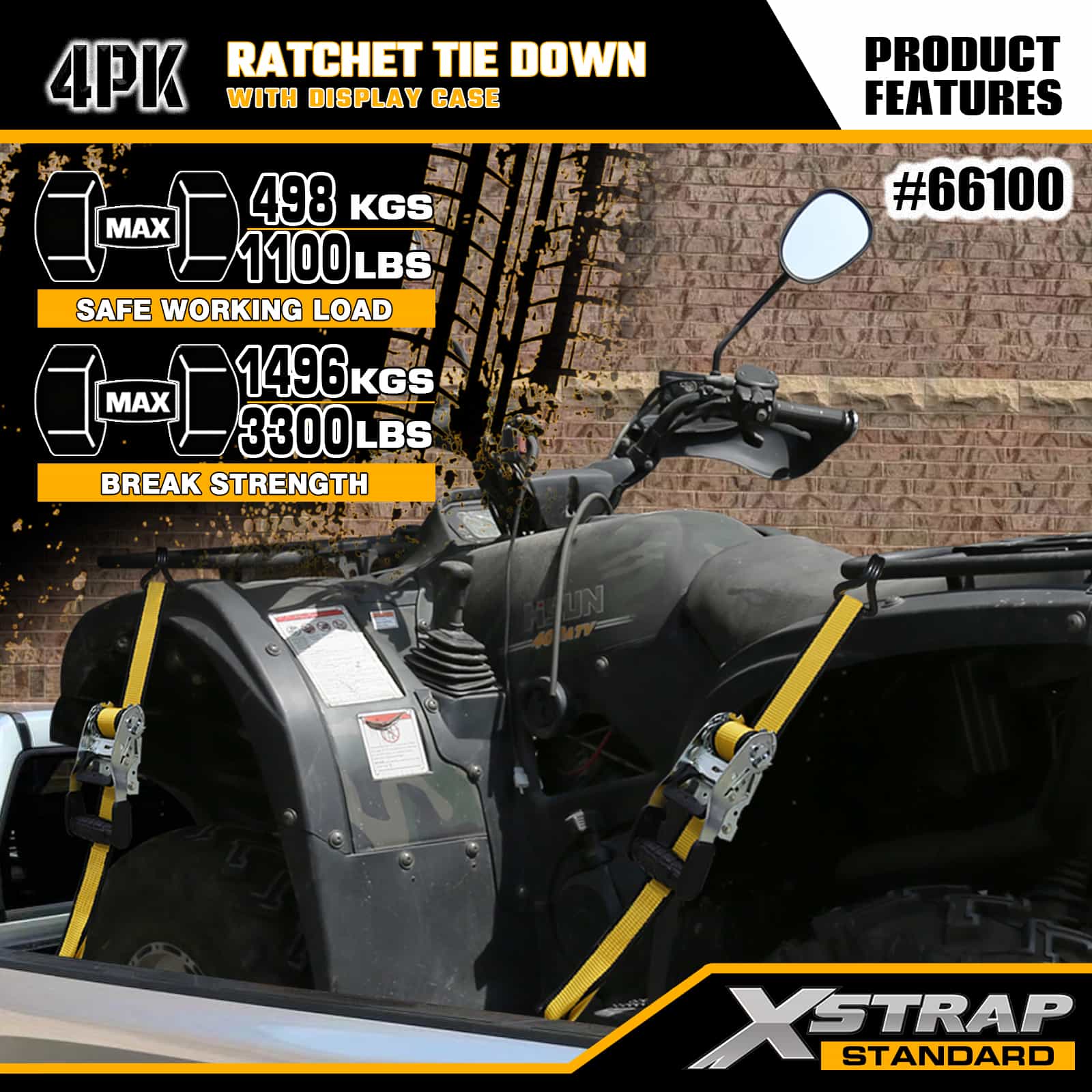 Xstrap 4 Pack Ratchet Tie Down na may Double J Hooks, 1-1/2" x 16' Polyester Tie Down Strap Pull Ratchet Strap, 1100lbs Kapasidad Cargo Lashing Securing Straps na may Double J Hooks para sa Pickup Truck, SUV, Car Top Racks Motorsiklo, Light Fishing Boat, Jet Ski, Snowmobile.