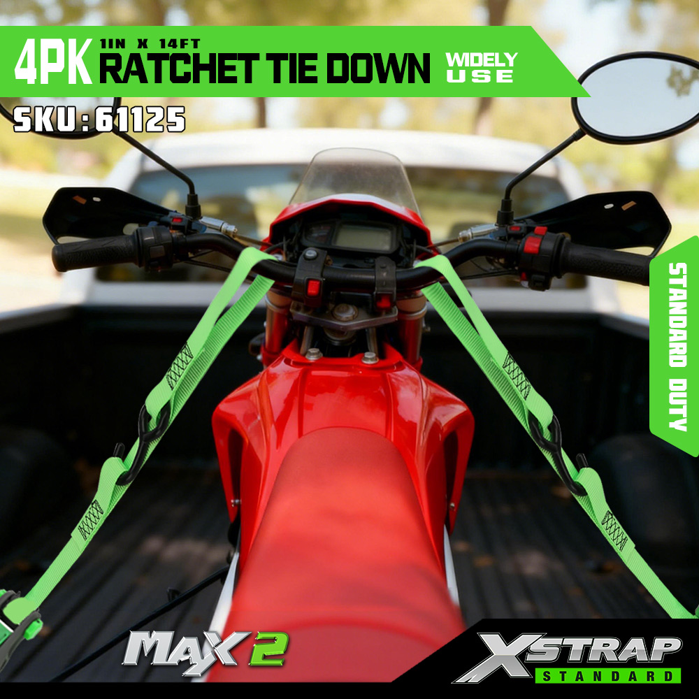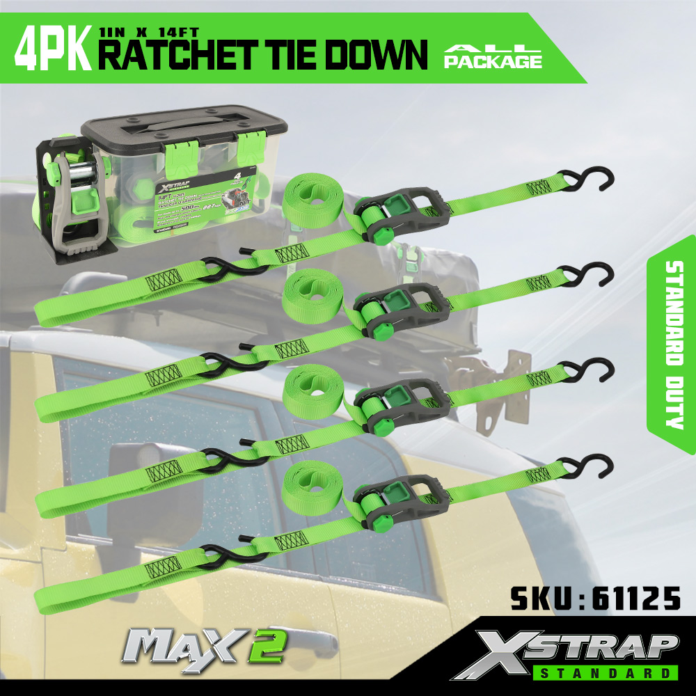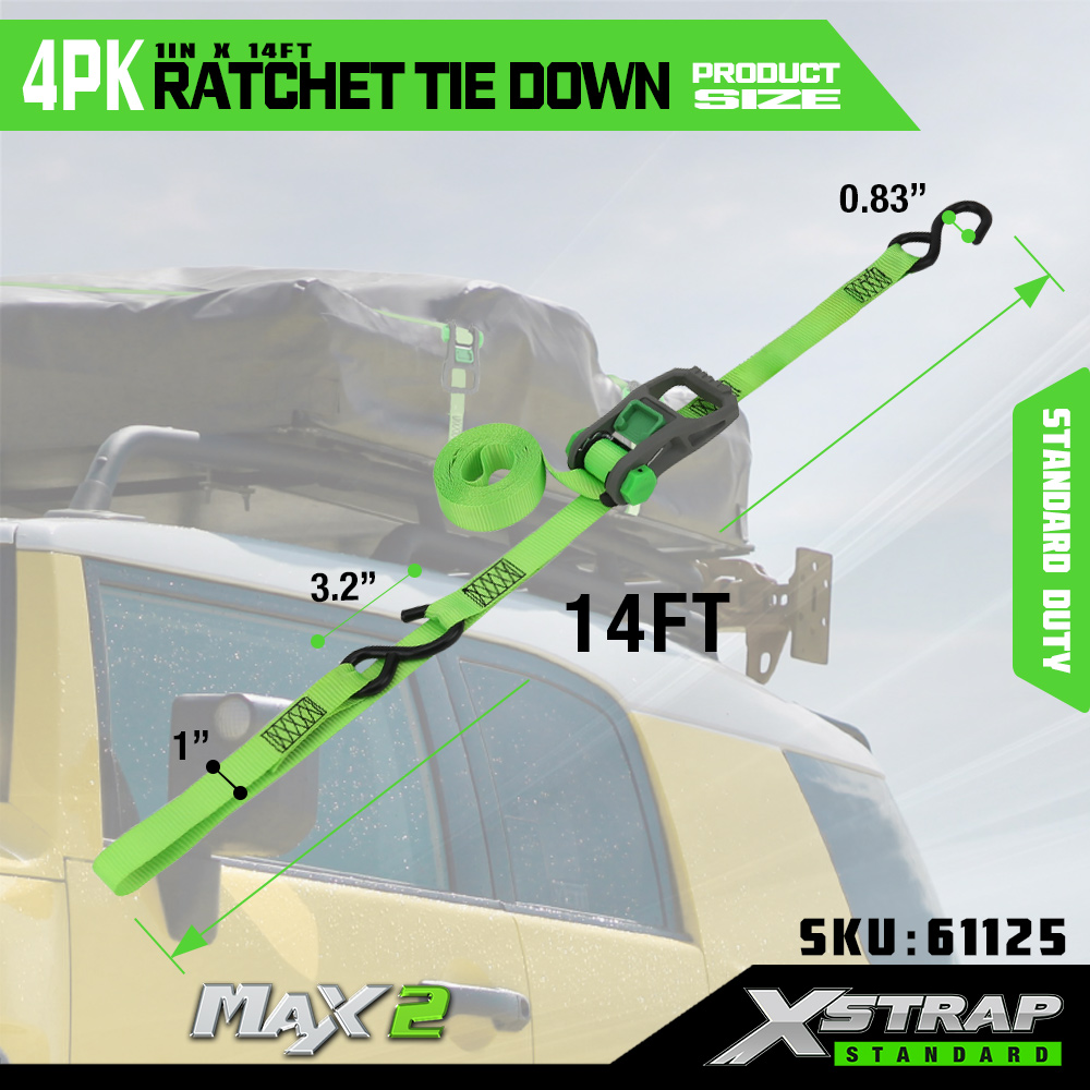 Xstrap 4 Pack Ratchet Tie Down, 1” x 14’ Polyester Tie Down Strap na may malambot na loop Pull Ratchet Strap, 500lbs Kapasidad Cargo Lashing Securing Straps na may S Hooks para sa Pickup Truck, SUV, Car Top Racks Motorsiklo, Light Fishing Boat, Jet Ski, Snowmobile.
